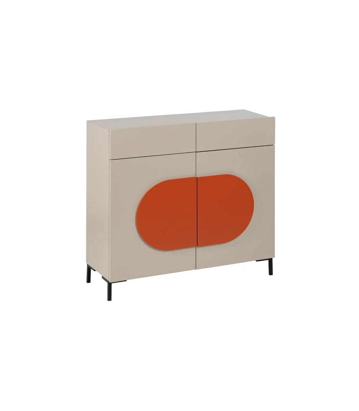 Aparador pequeño de poco fondo de estilo oriental con 2 cajones y 2 puertas realizado en madera dm lacada en color topo y naranja, un mueble muy decorativo de buena capacidad.