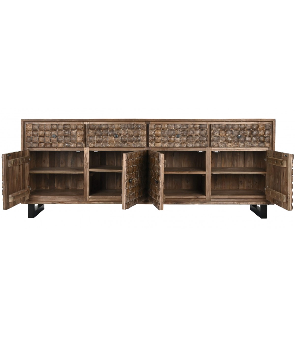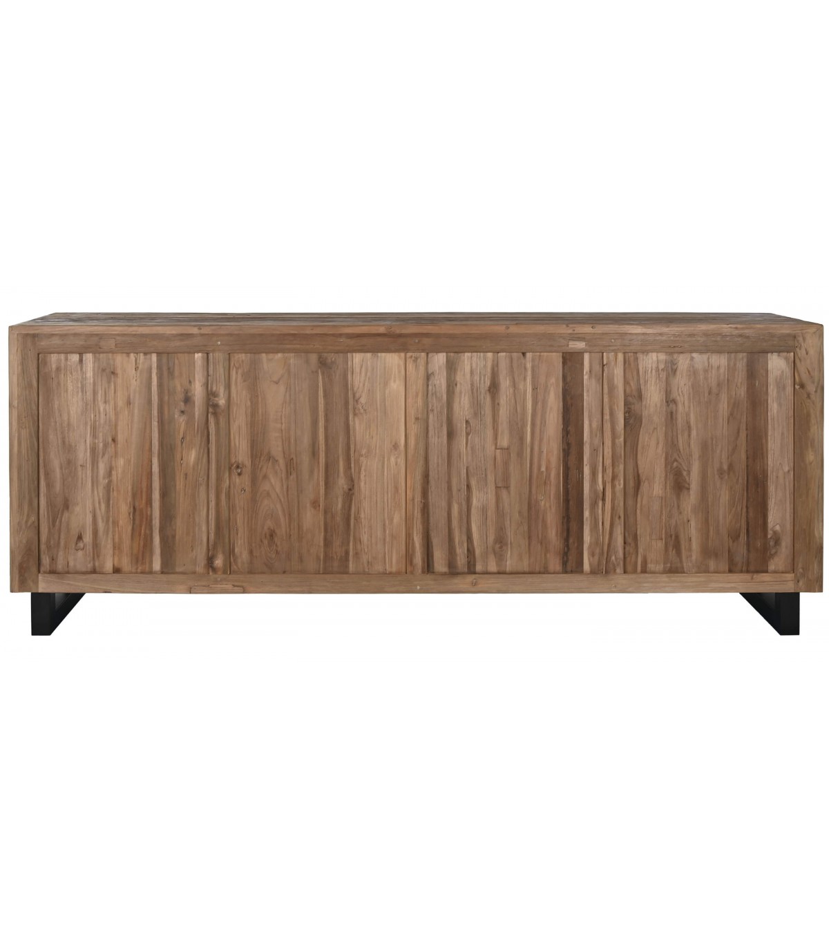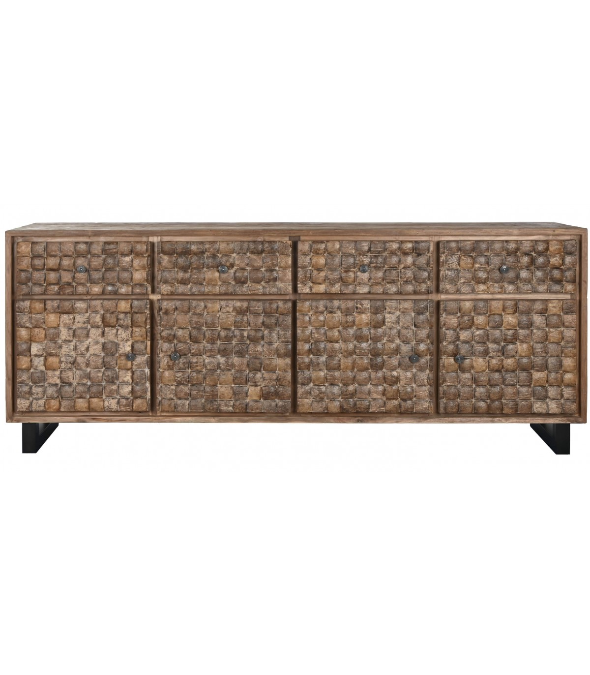Aparador grande con 4 puertas y 4 cajones realizado en madera de teca reciclada, con el frente de las puertas en coco, patas en metal negro, un mueble de gran capacidad adaptable a cualquier tipo de decoración como pieza singular.