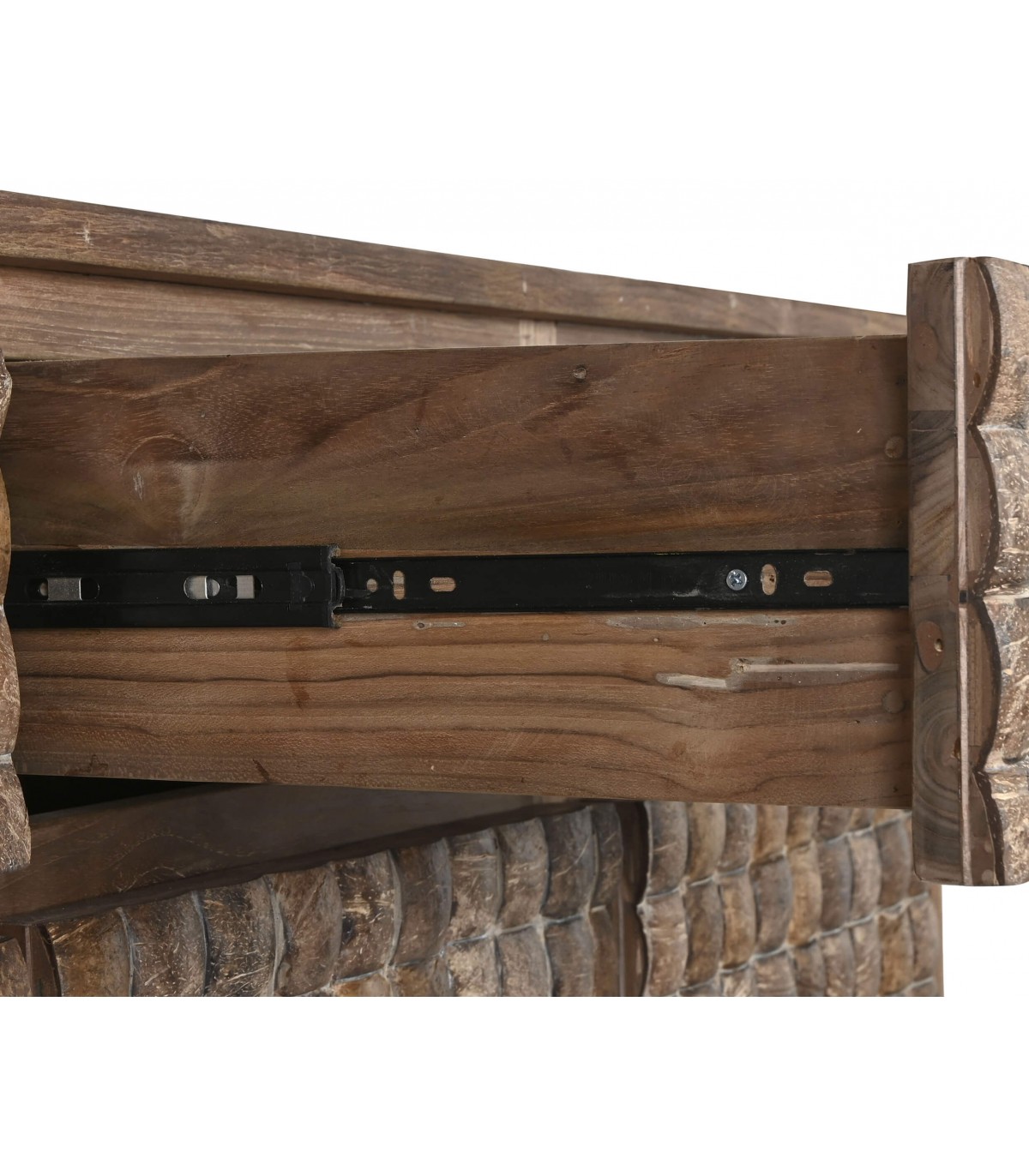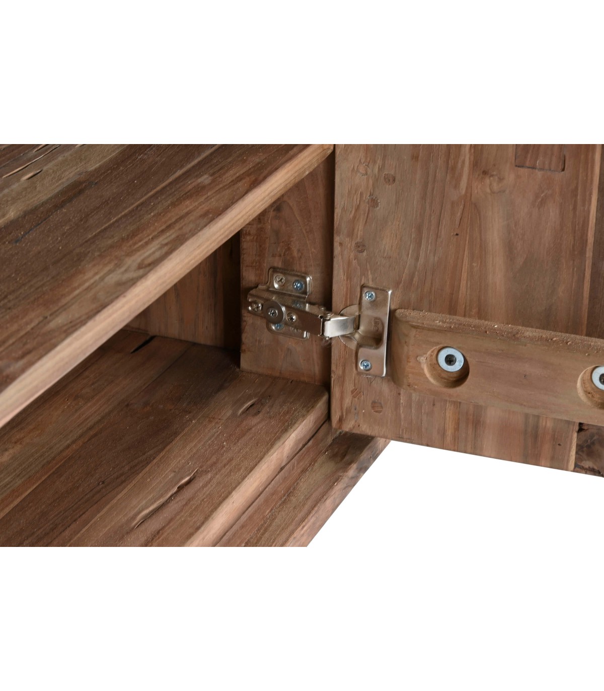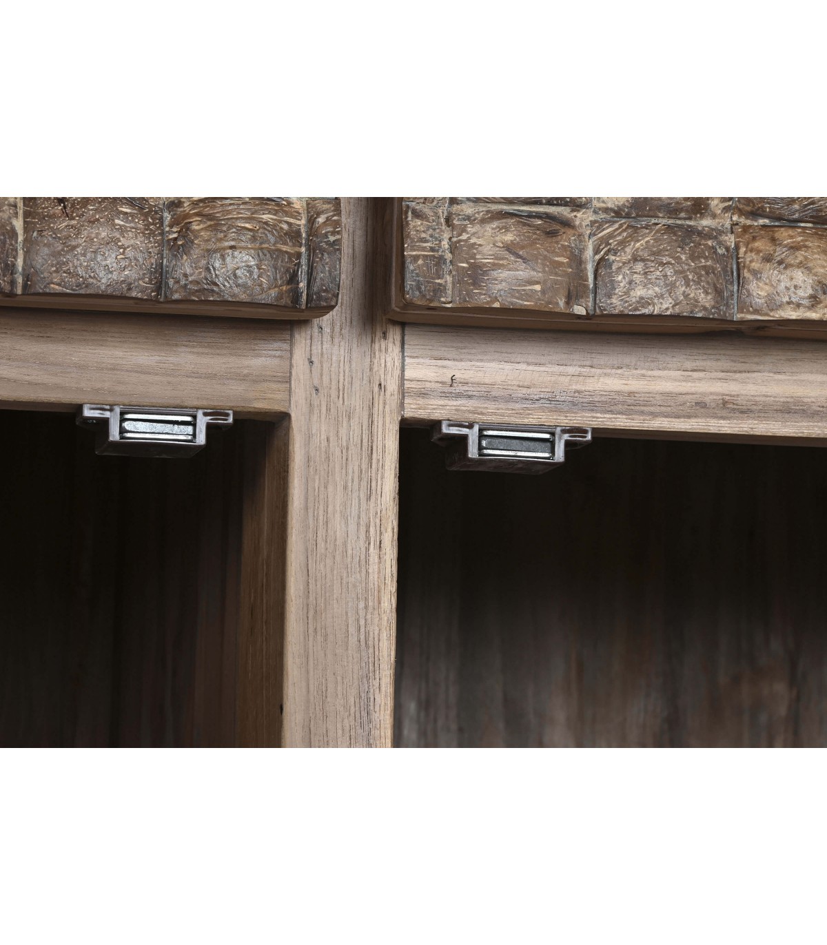 Aparador grande con 4 puertas y 4 cajones realizado en madera de teca reciclada, con el frente de las puertas en coco, patas en metal negro, un mueble de gran capacidad adaptable a cualquier tipo de decoración como pieza singular.