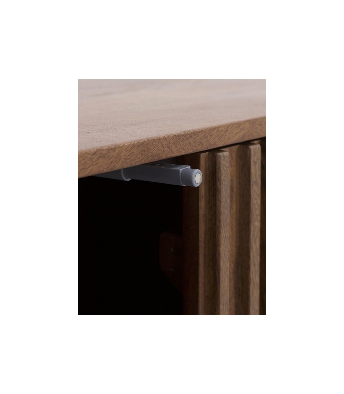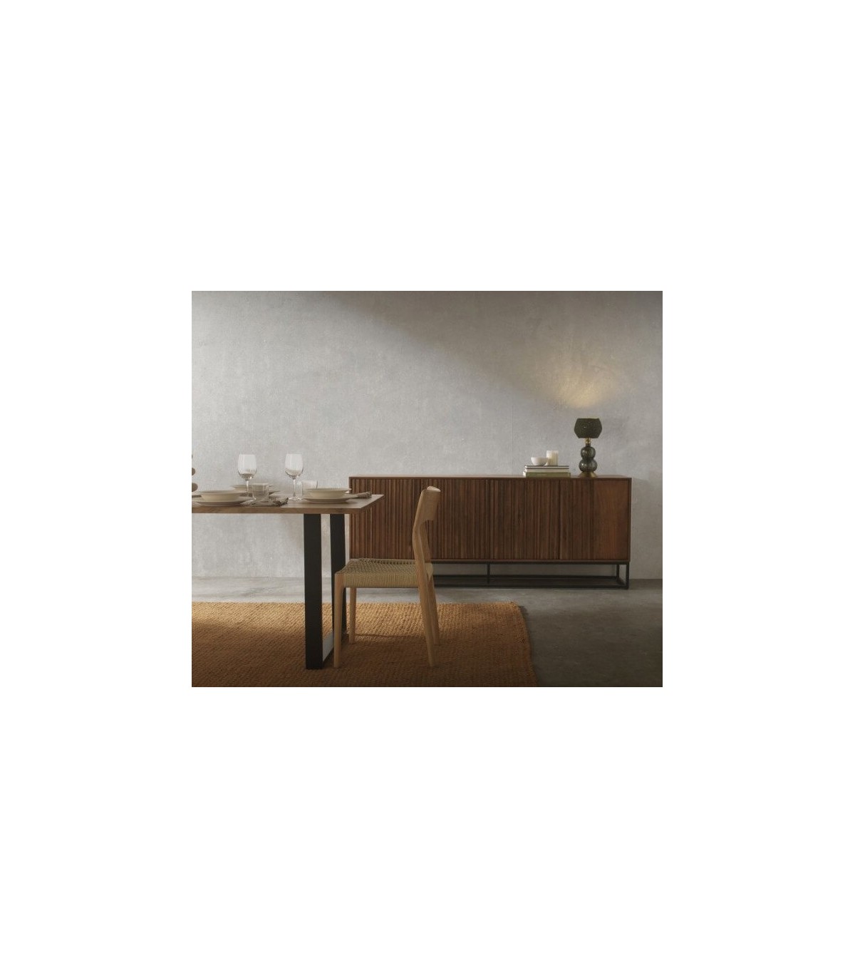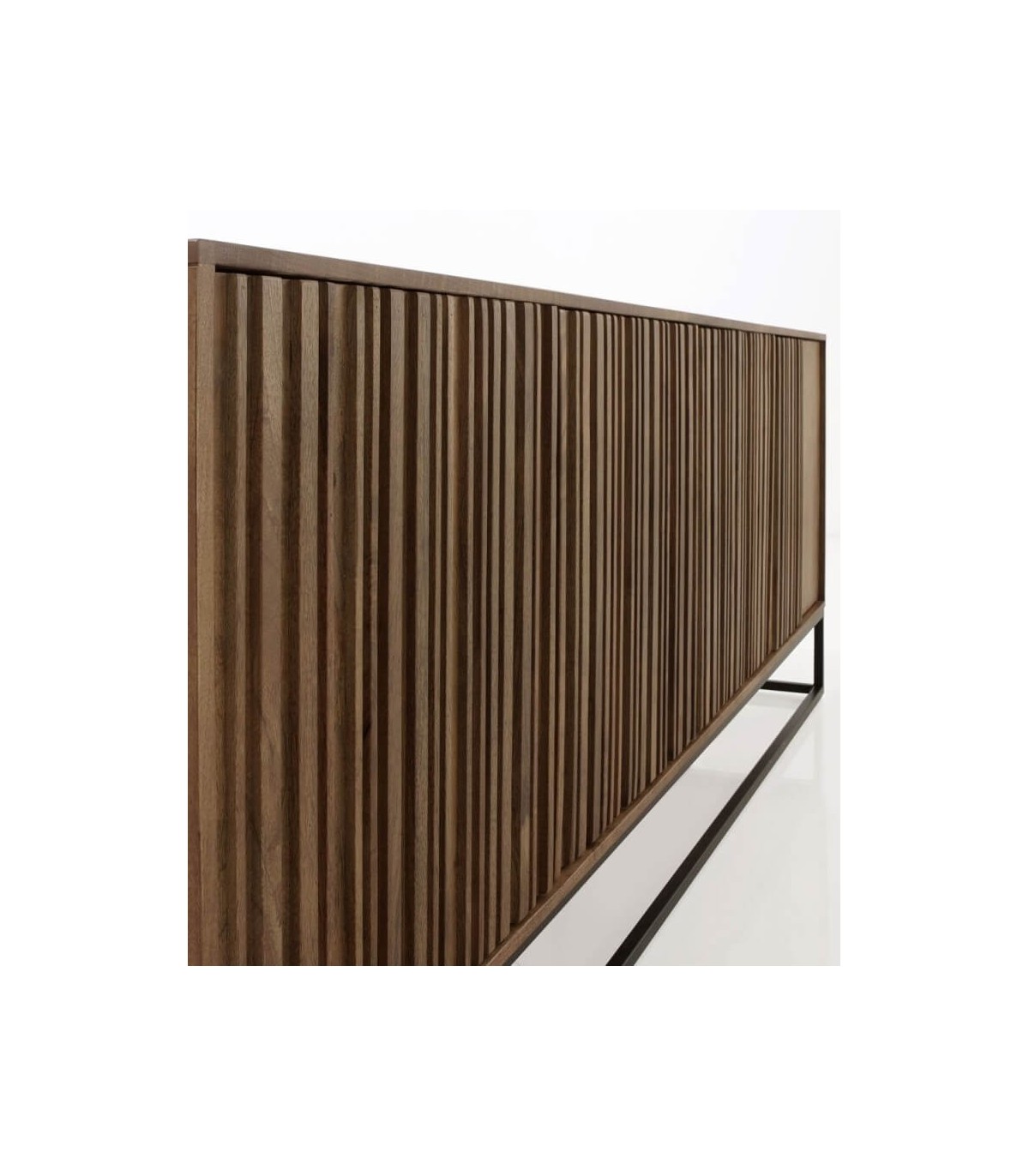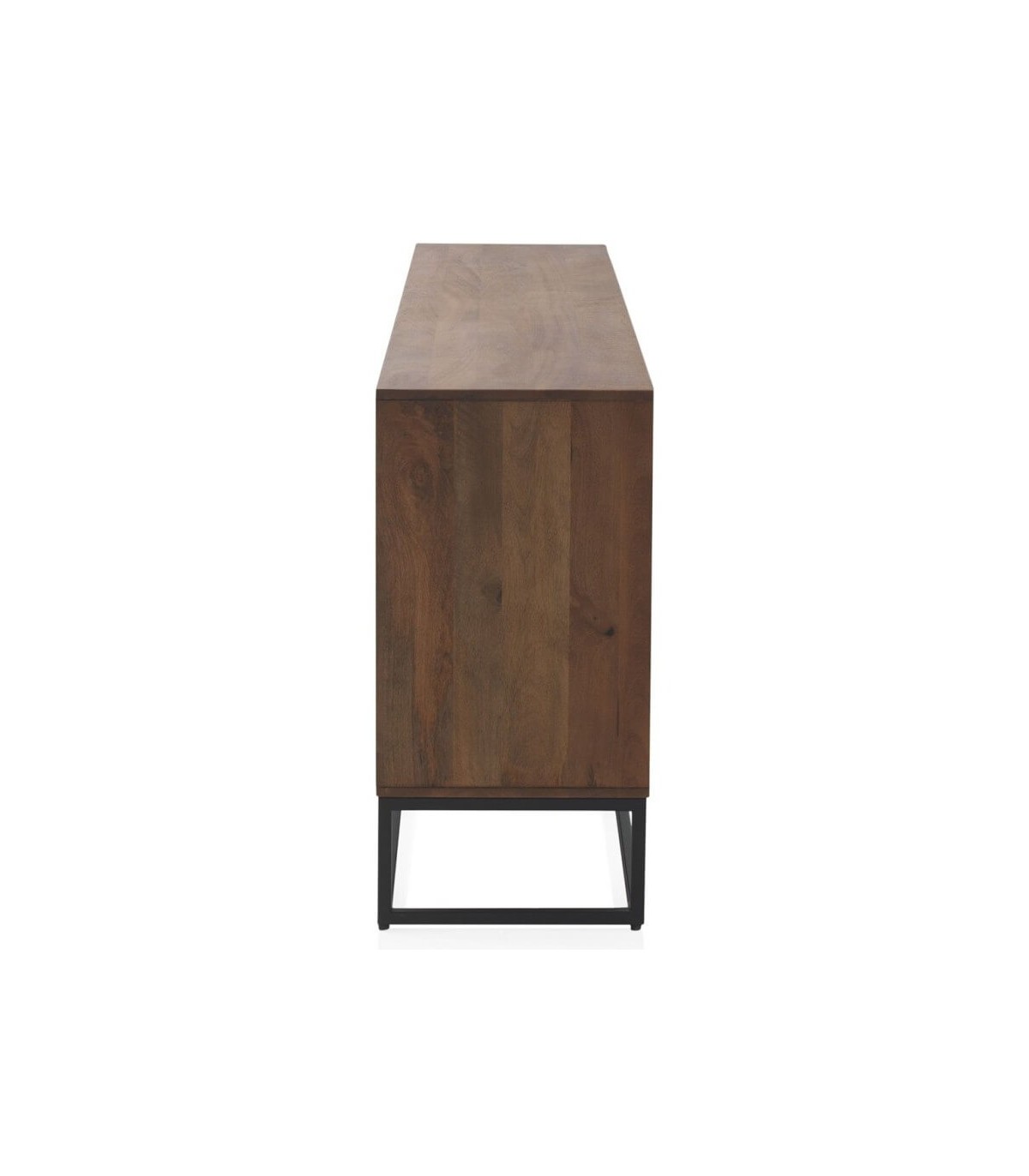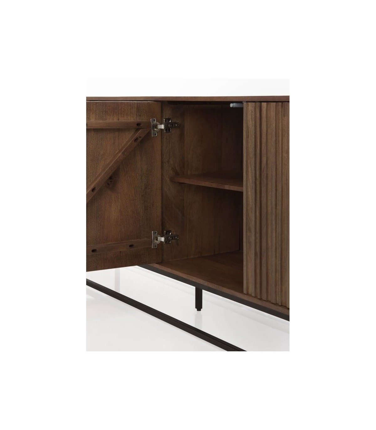 Aparador con 4 puertas realizado en madera de mango, con las puertas labradas teñido en color nogal y la base en metal negro, Una colección de muebles de alta calidad donde se aprecia el cuidado al detalle y un herraje de calidad. Elegante y cálida.