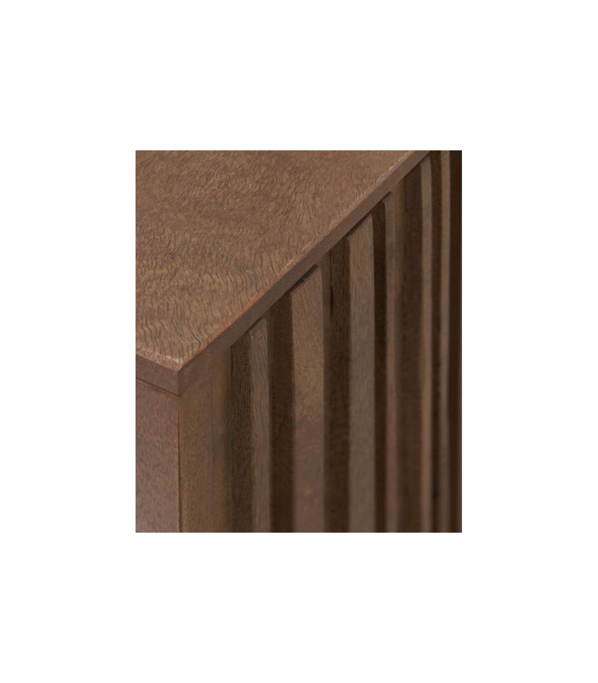Acabado, madera de mango con las puertas labradas en color nogal, patas en metal.