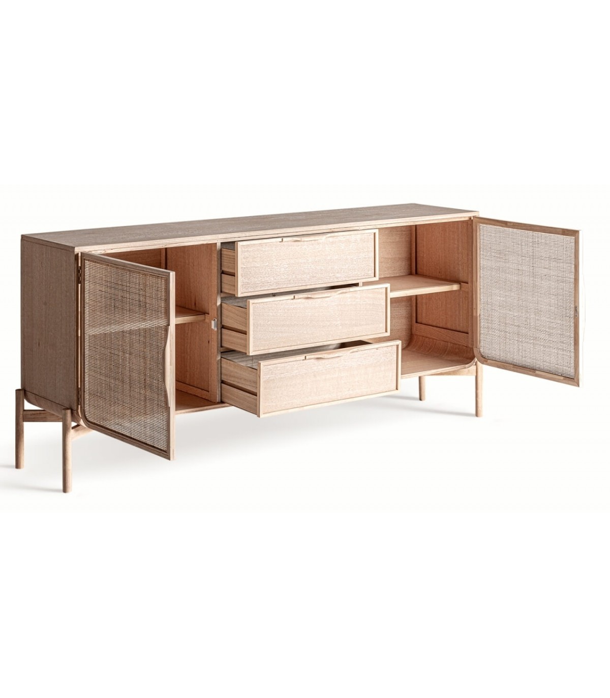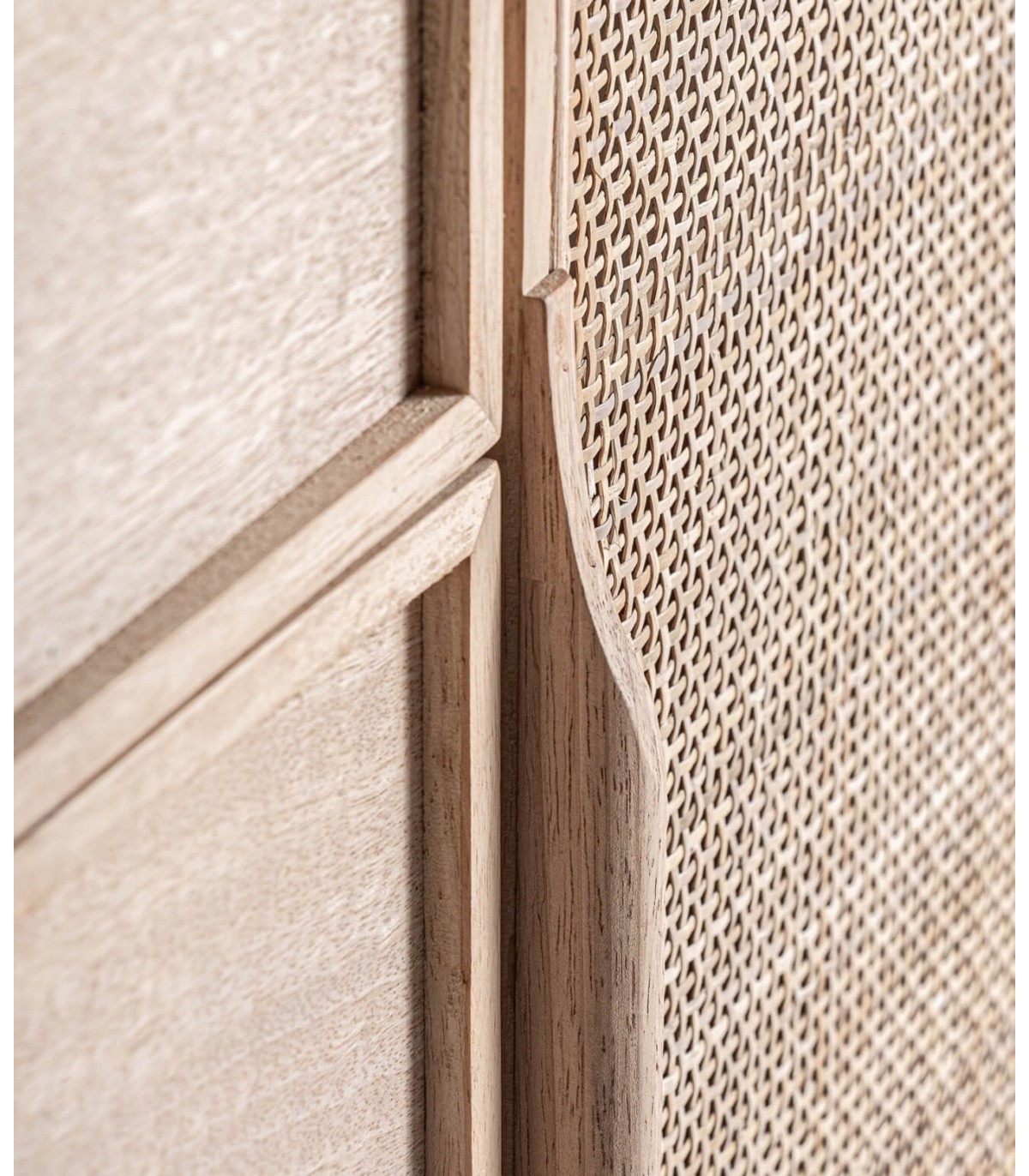 Aparador estilo colonial, realizado en madera de fresno y ratán acabado natural, un mueble de capacidad muy refrescante, con sus partes curvas y el contraste entre el ratán y la madera con unos bonitos tiradores tallados madera a juego.