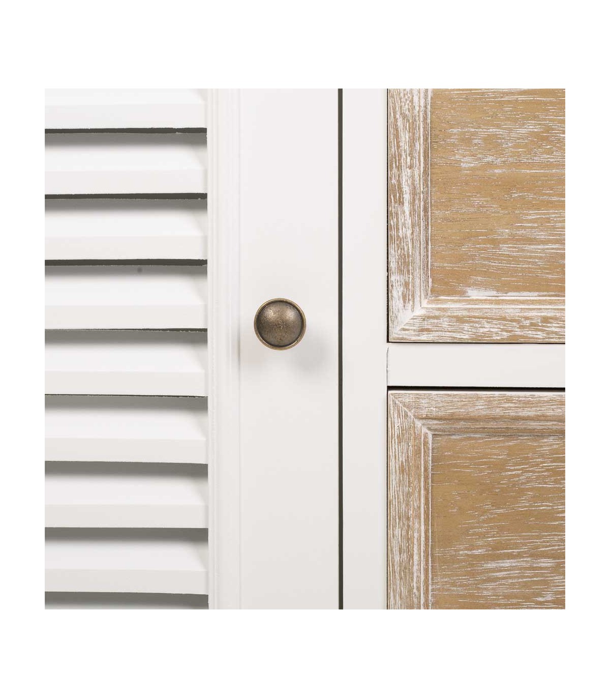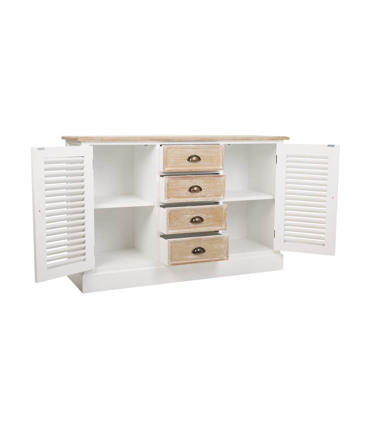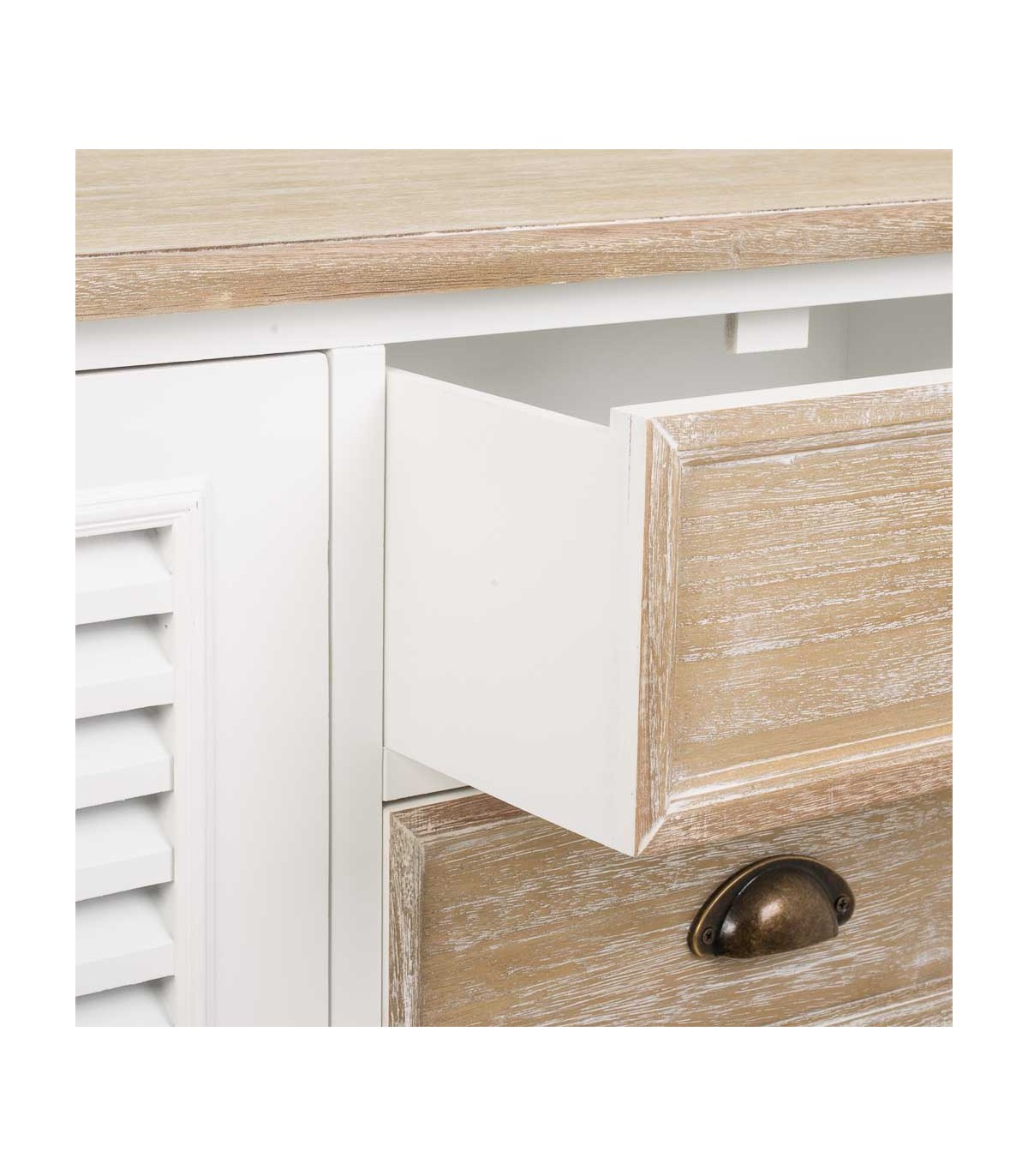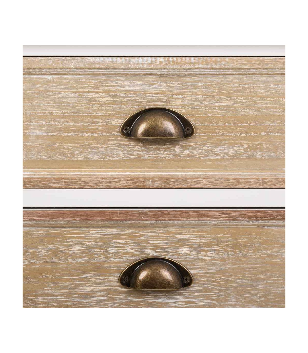 🎨 Acabado: Cuerpo blanco, tapas y cajones en madera natural lavada, tiradores en latón pavonado