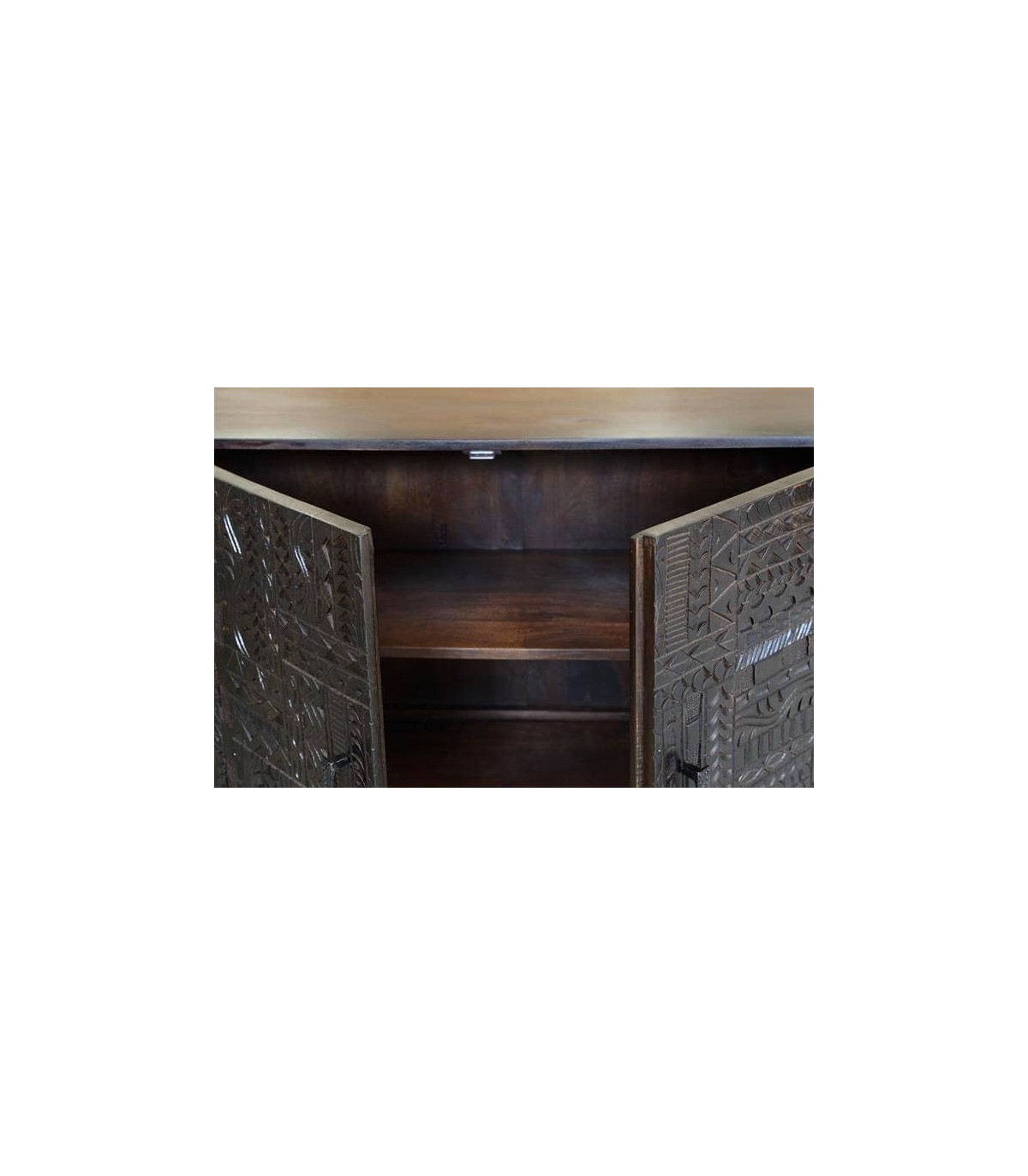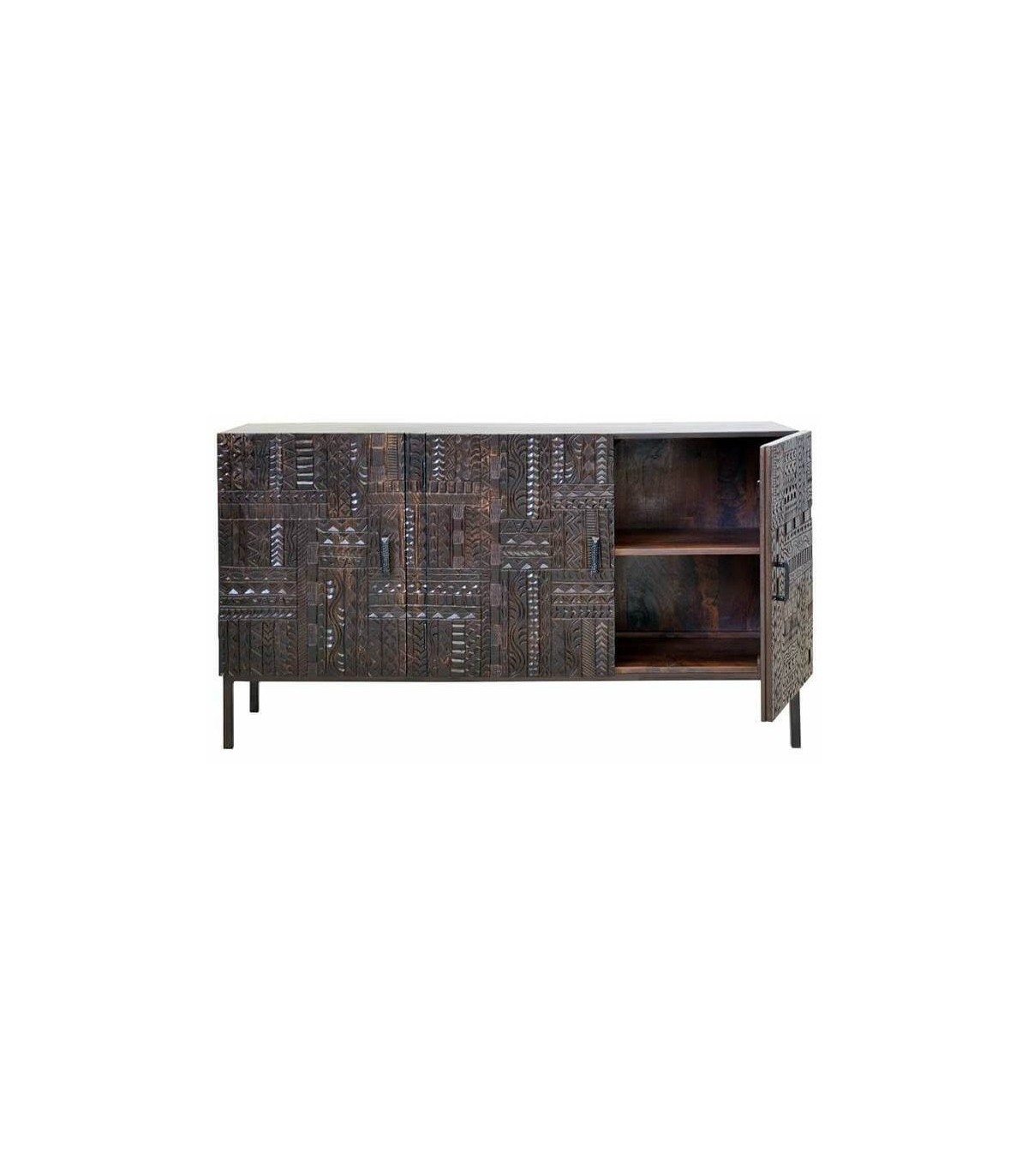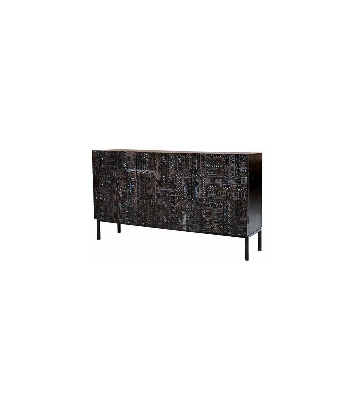 Aparador de nuestra colección de muebles Azteca, una colección realizada en madera maciza de mango con las tallas hechas a mano artesanalmente y la base y los tiradores especificos para la colección en hierro forjado acabado negro, una colección muy racial y con carácter que le dara mucho sabor a tu decoración.