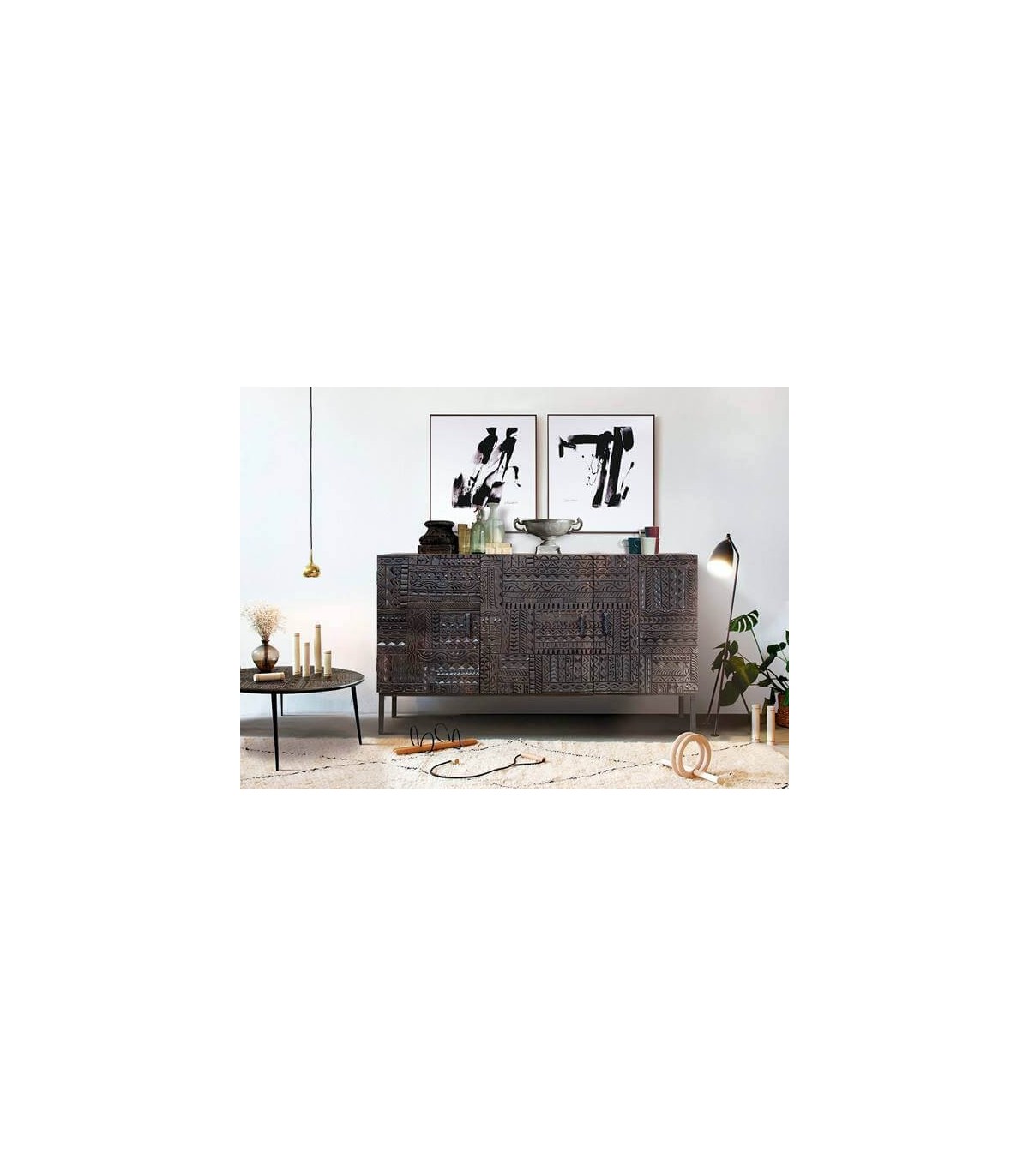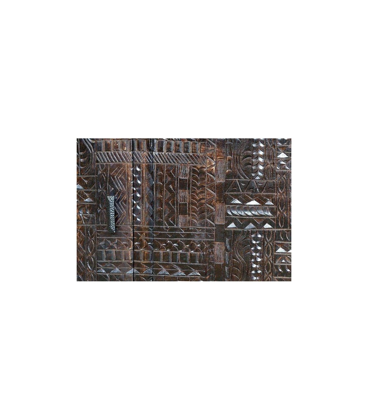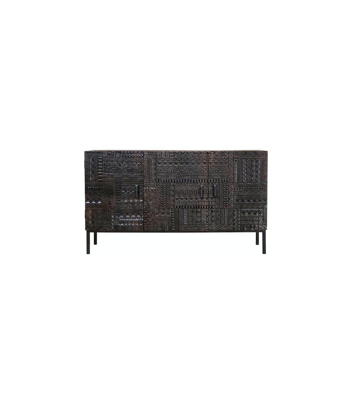 Aparador de nuestra colección de muebles Azteca, una colección realizada en madera maciza de mango con las tallas hechas a mano artesanalmente y la base y los tiradores especificos para la colección en hierro forjado acabado negro, una colección muy racial y con carácter que le dara mucho sabor a tu decoración.
