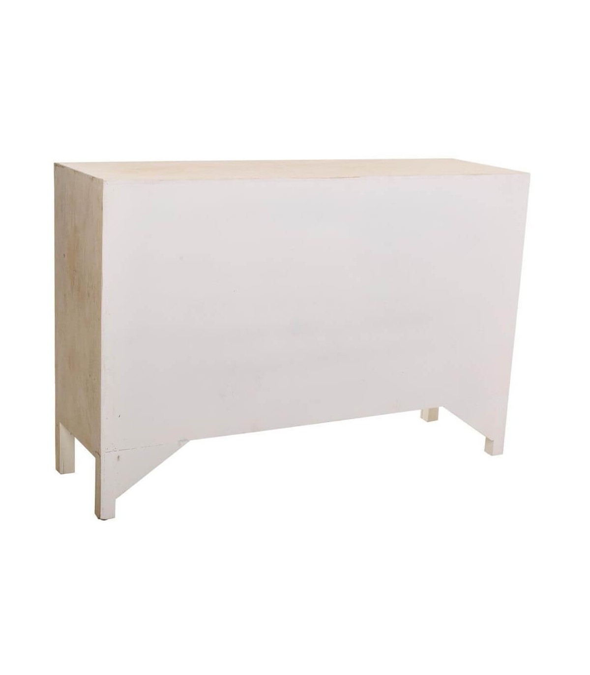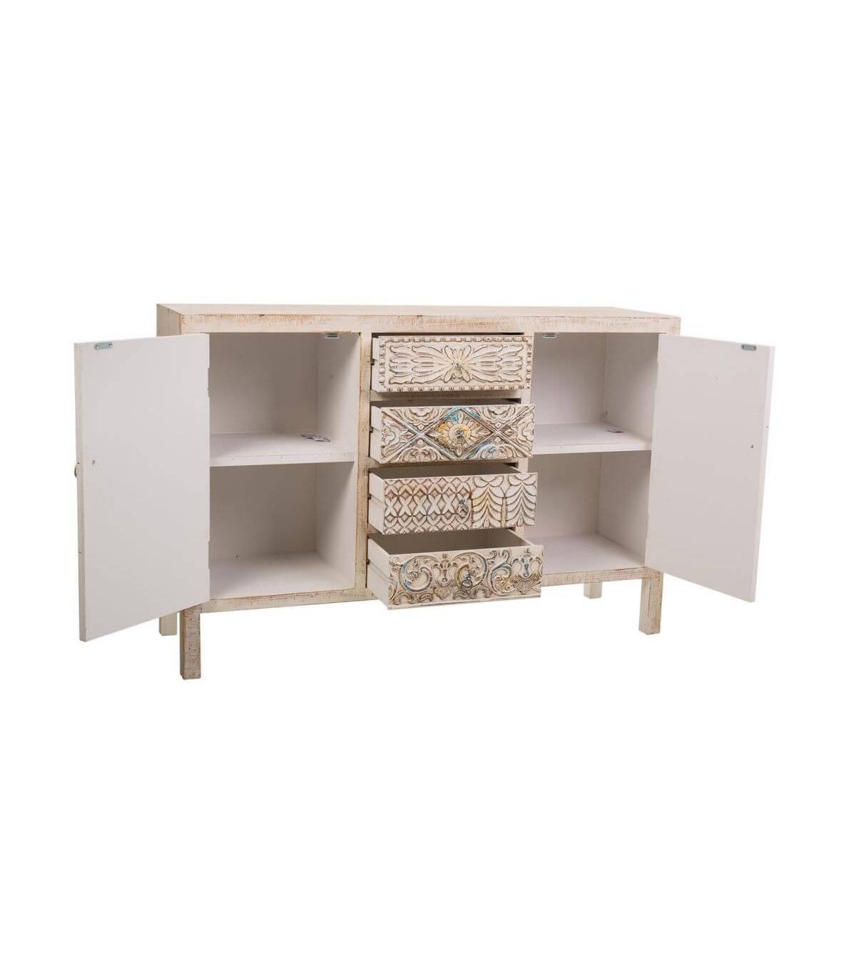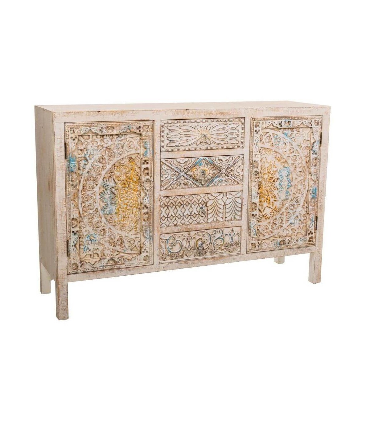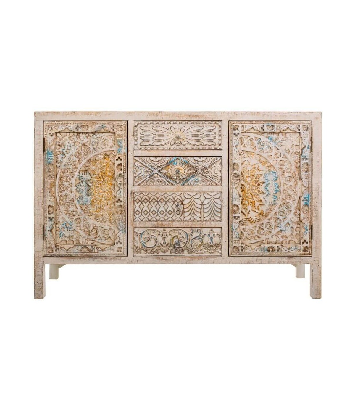 Este aparador artesanal combina belleza escultórica y funcionalidad con un aire exótico que enamora. La madera maciza de mango cobra vida a través de sus puertas y cajones tallados a mano, donde cada relieve muestra un trabajo minucioso y lleno de matices.