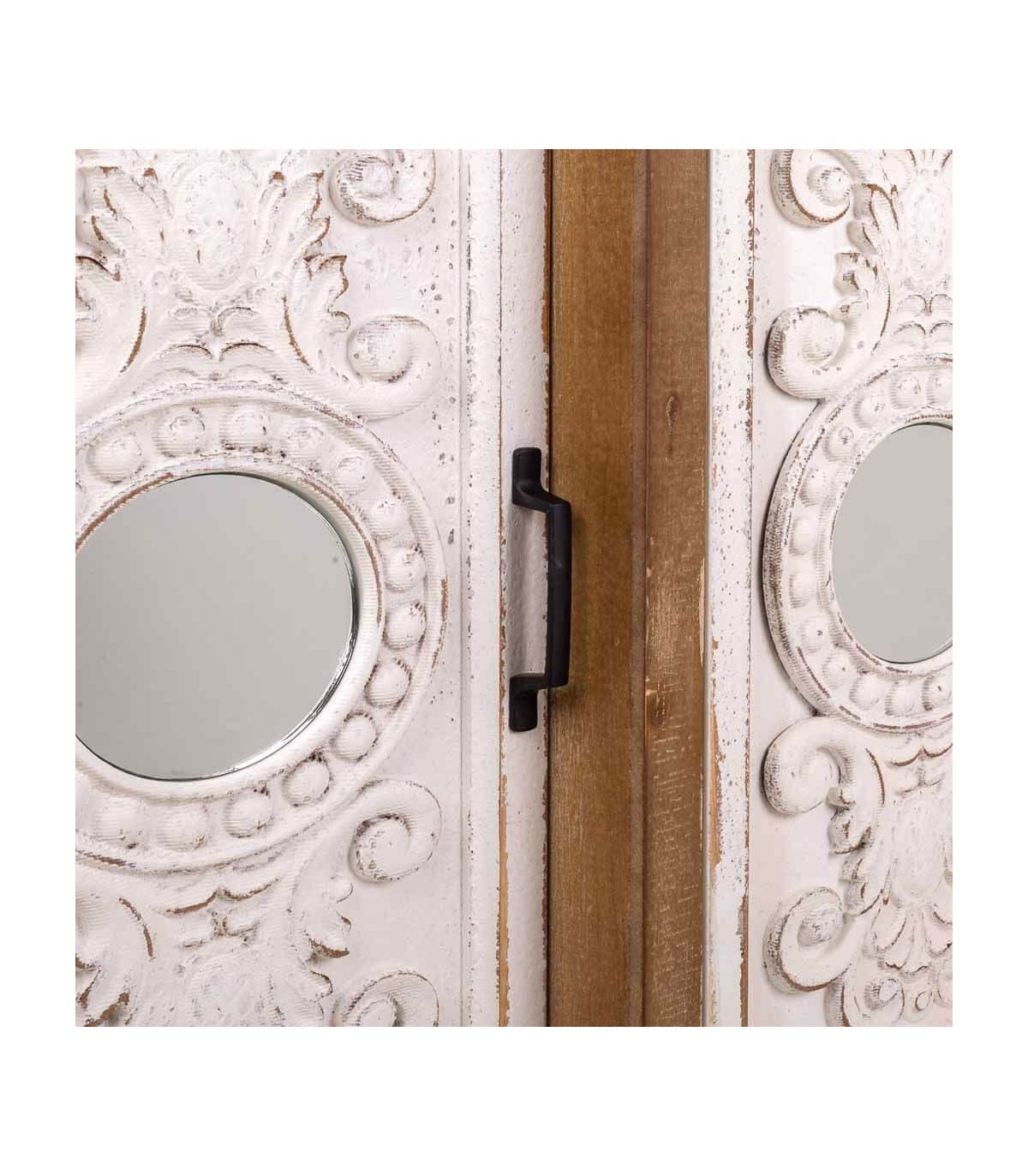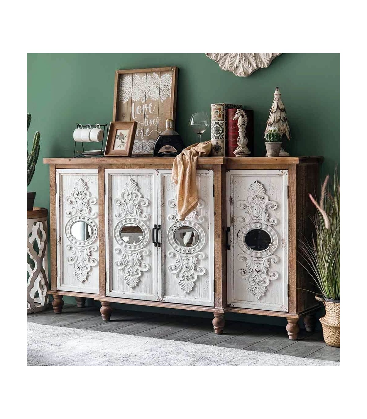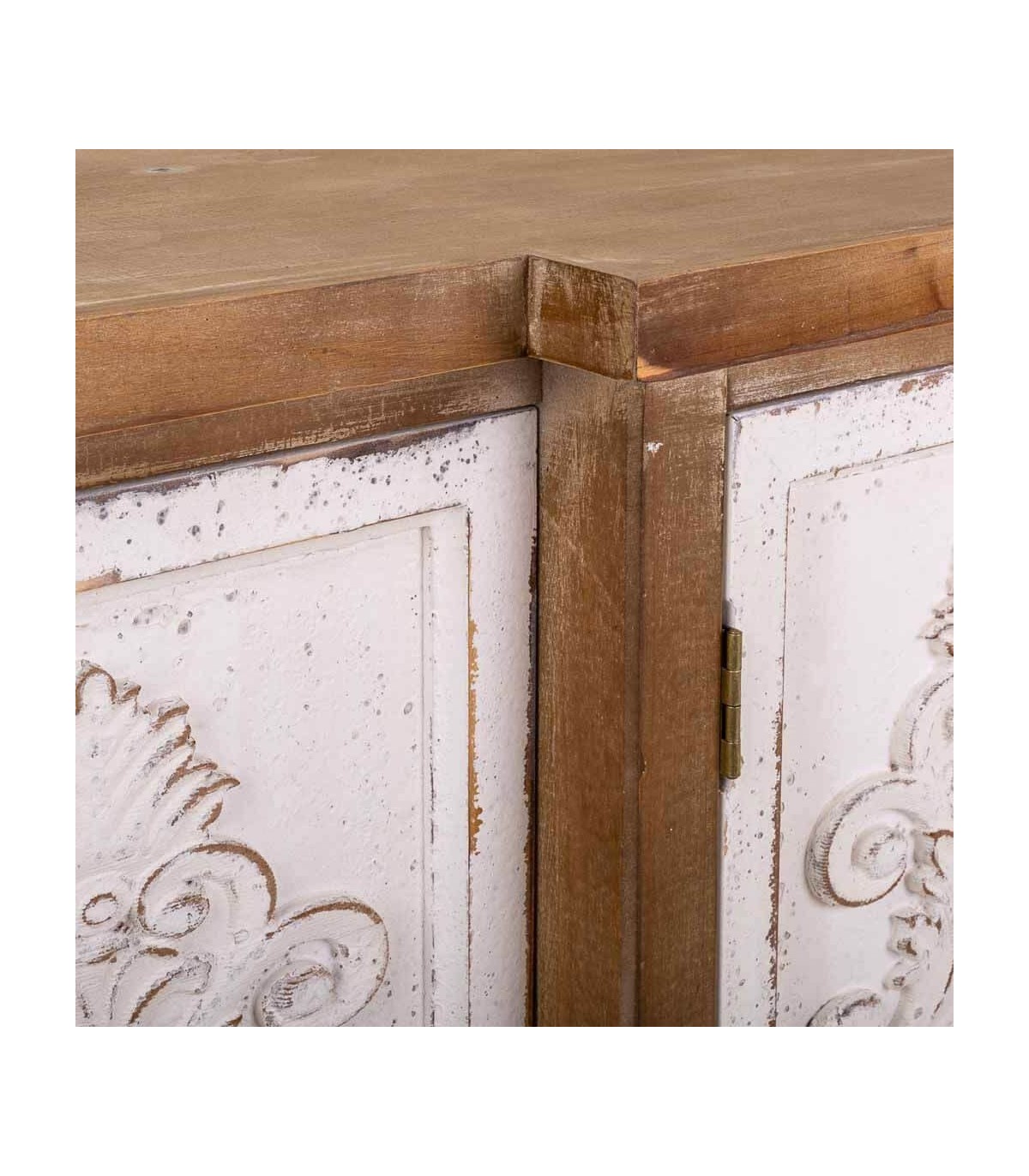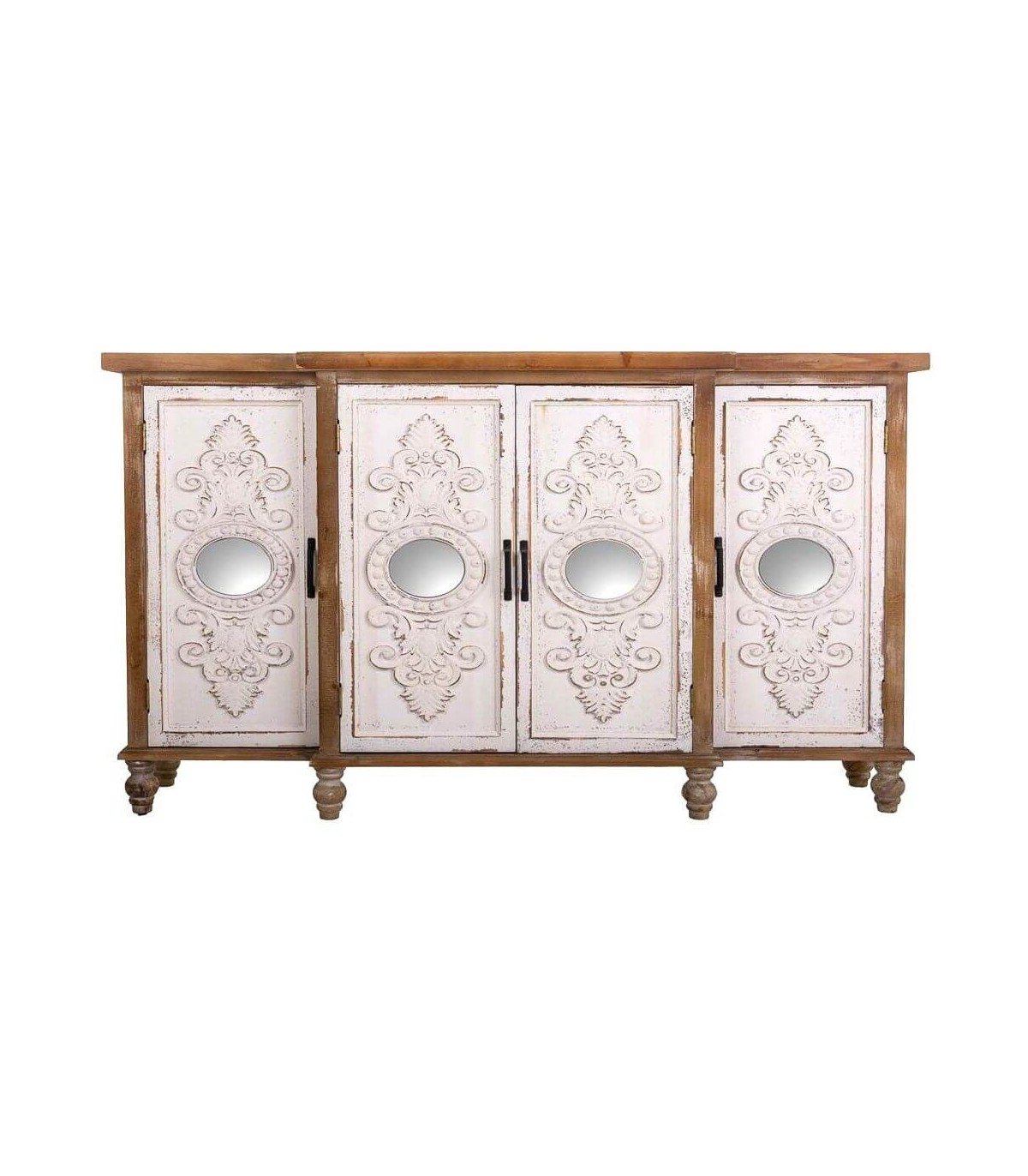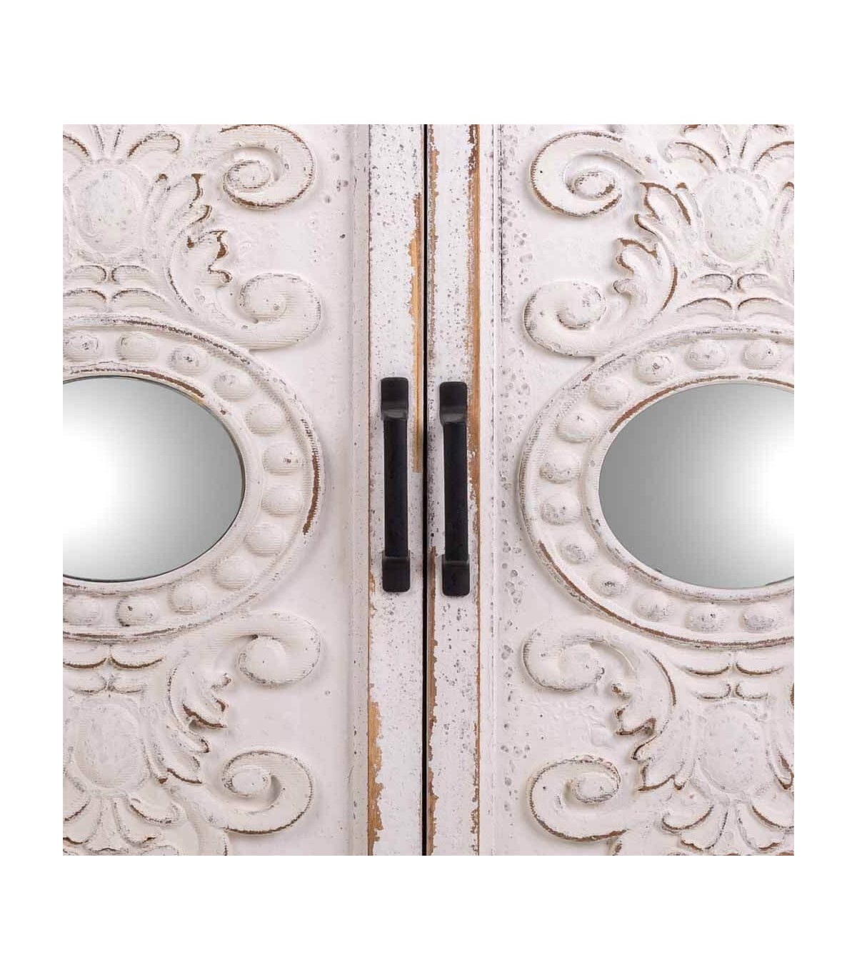 Acabado, artesanal cuerpo acabado cerezo, puertas en madera talladas con espejo acabadas en blanco vintage.