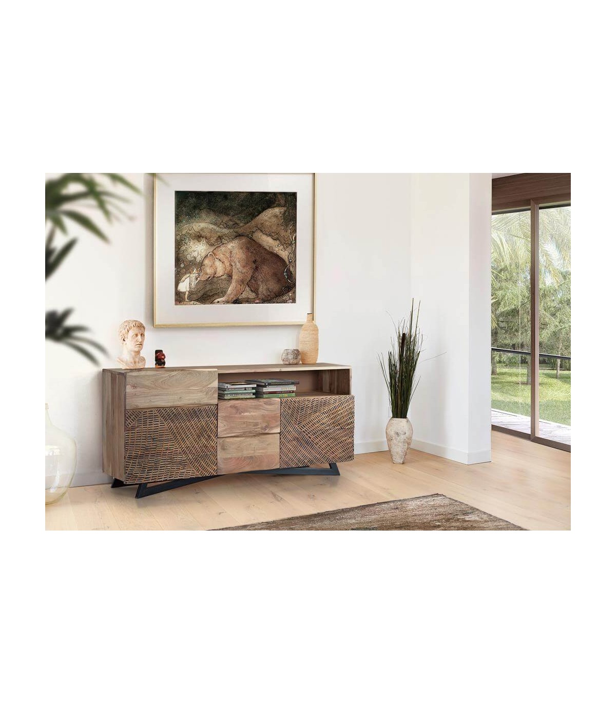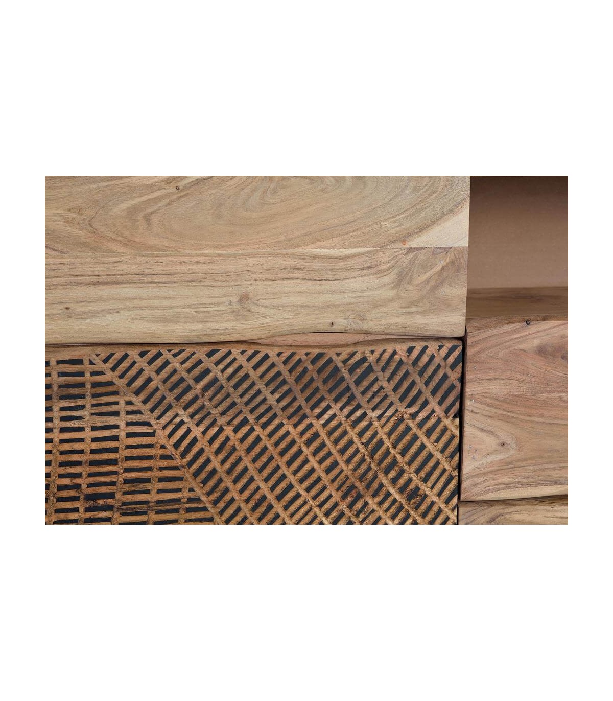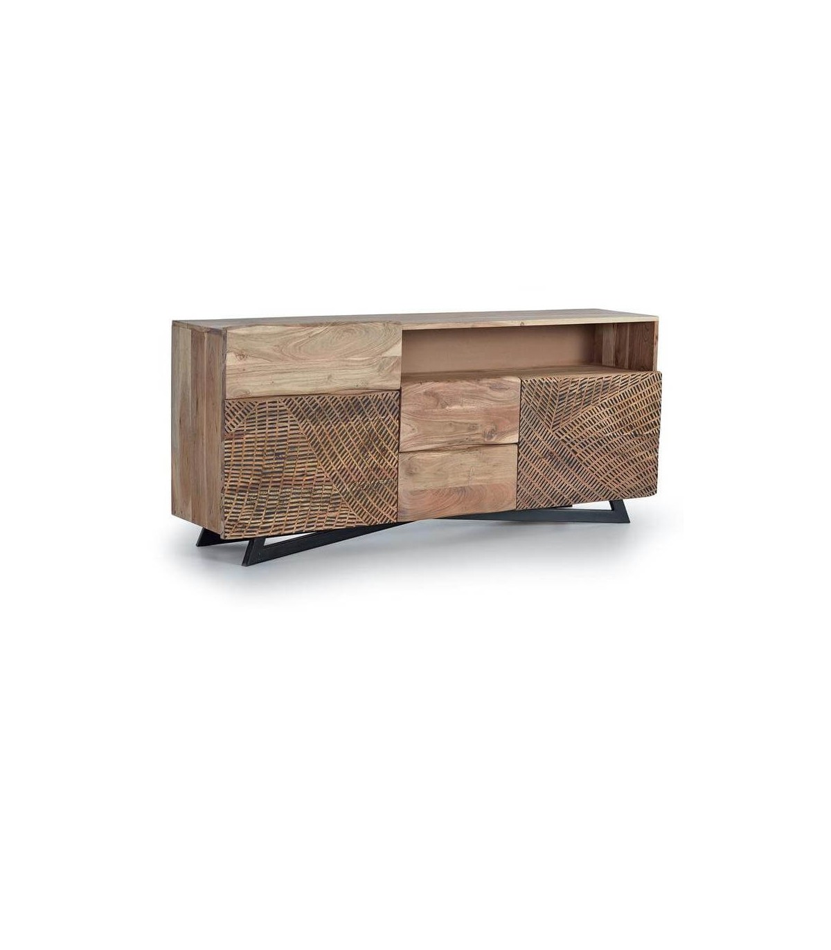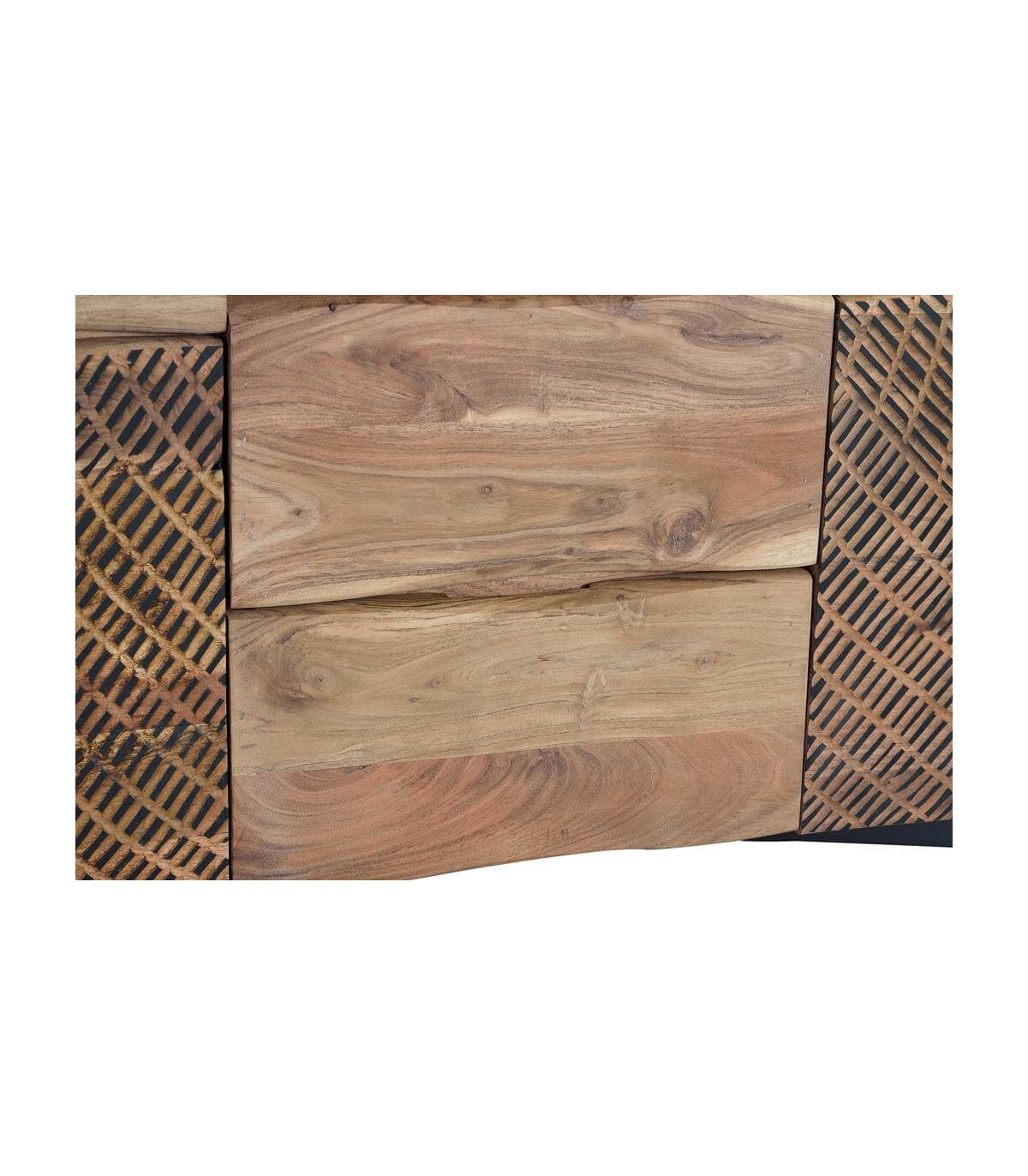 • Acabado, madera de acacia tallada y patas en metal negro.