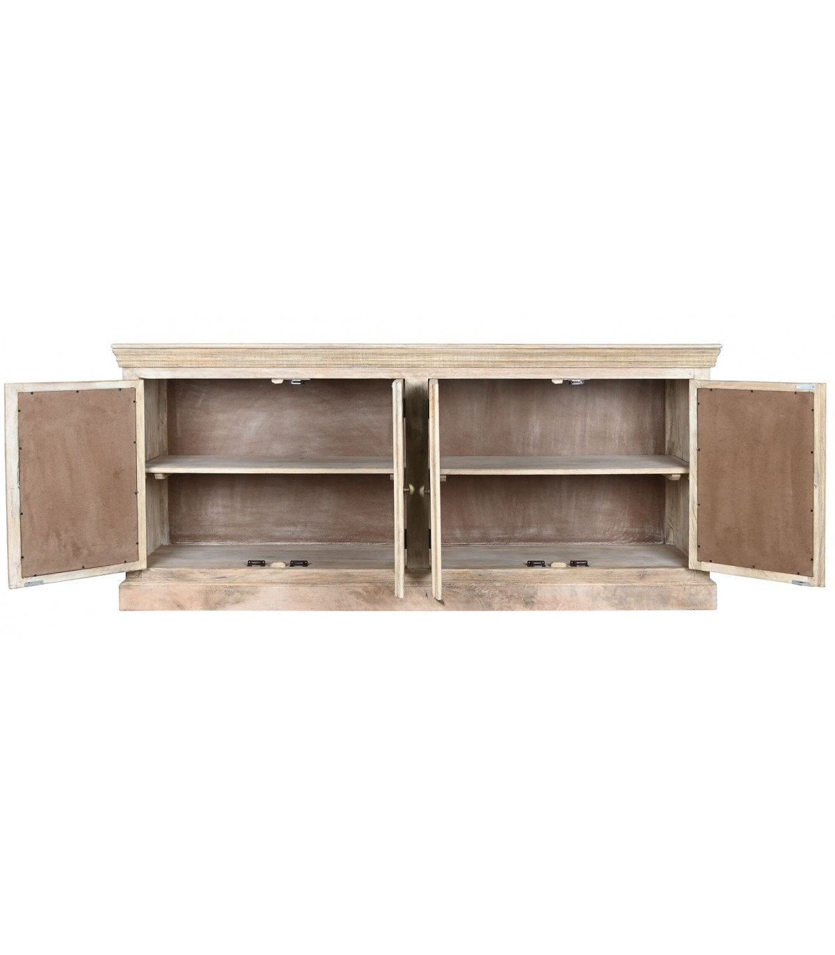 Aparador de estilo colonial con 4 puertas y una bonita celosía con espejo, realizada artesanamente en madera de mango natural con los tiradores de bronce, una pieza singular muy bonita de gran capacidad.