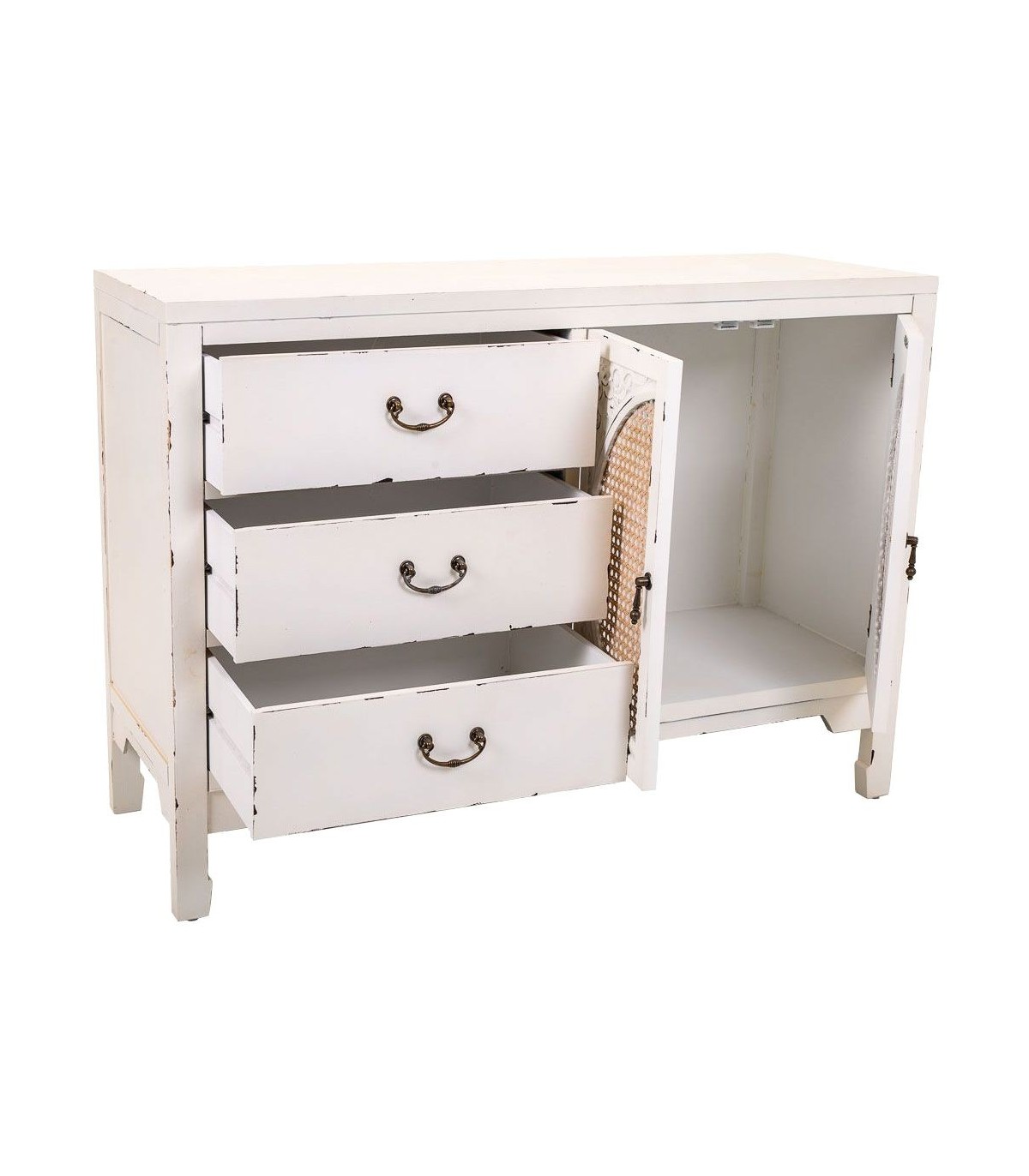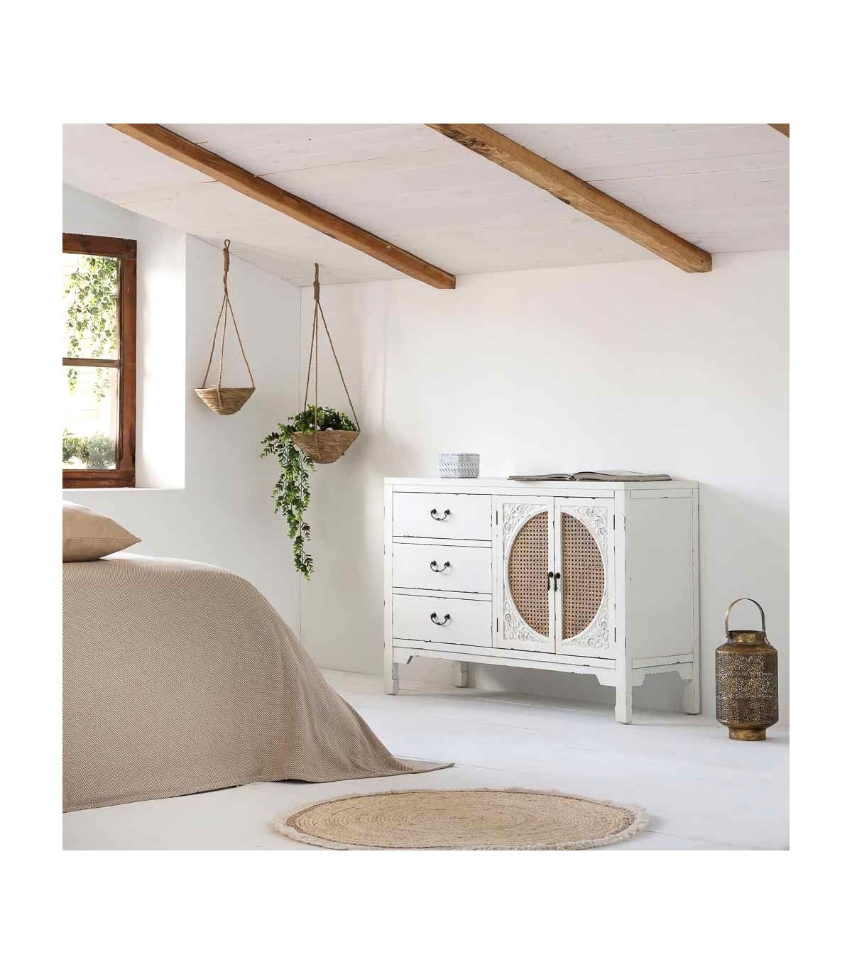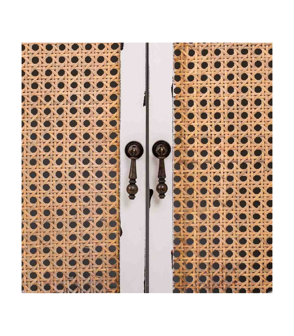 Acabado, artesanal, madera con detalles tallados a mano lacada en blanco rozado, ratán natural, tiradores bronce.
