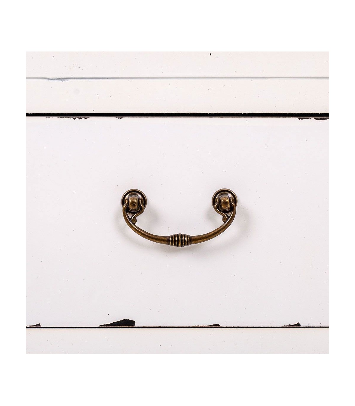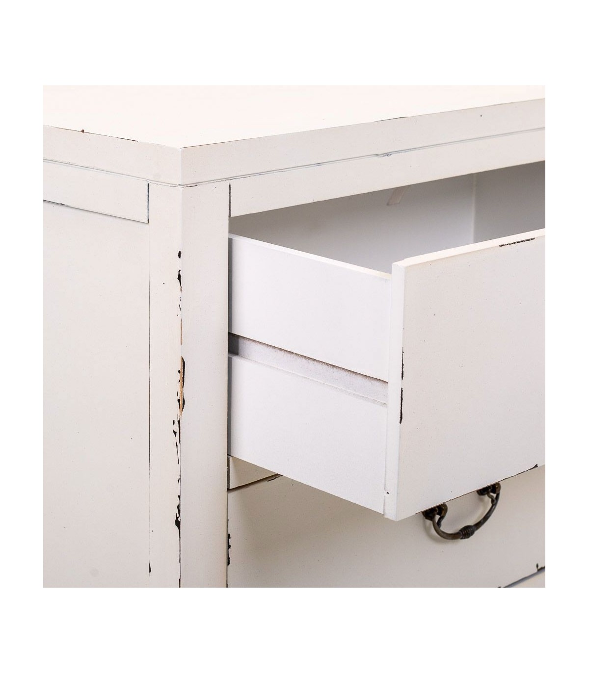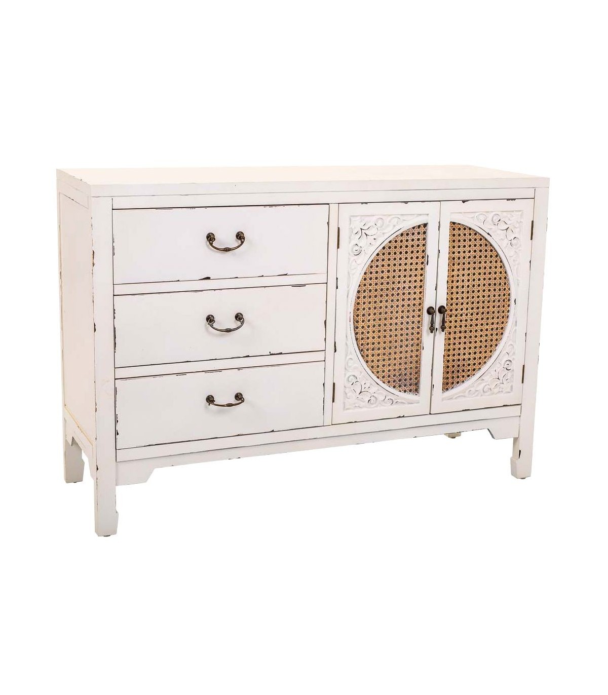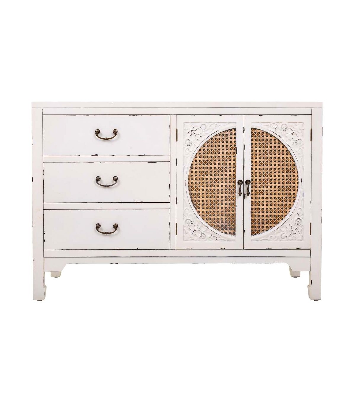 Acabado, artesanal, madera con detalles tallados a mano lacada en blanco rozado, ratán natural, tiradores bronce.