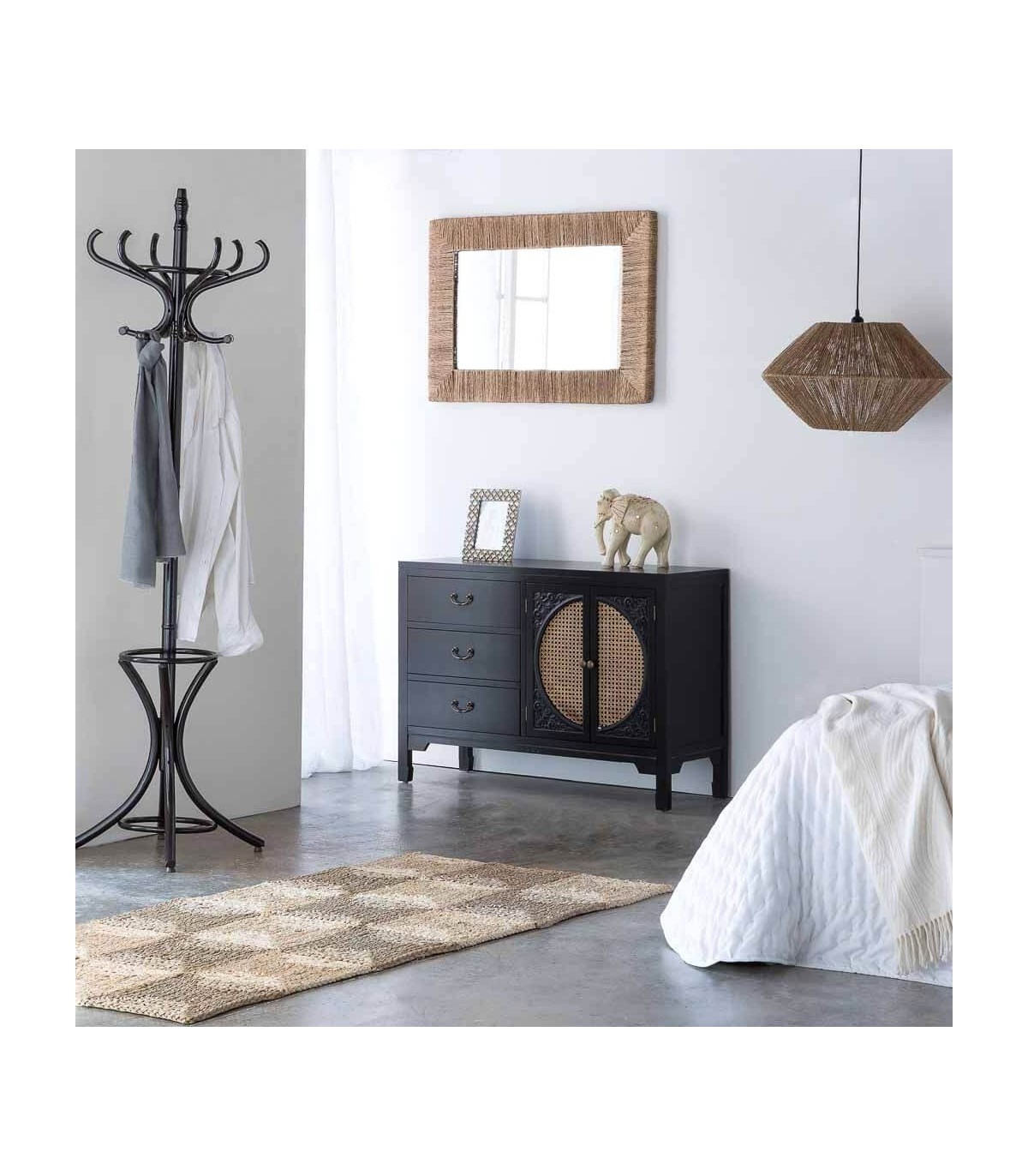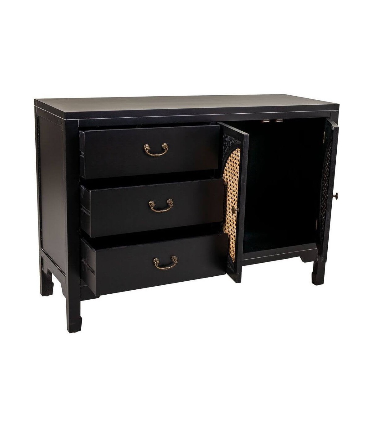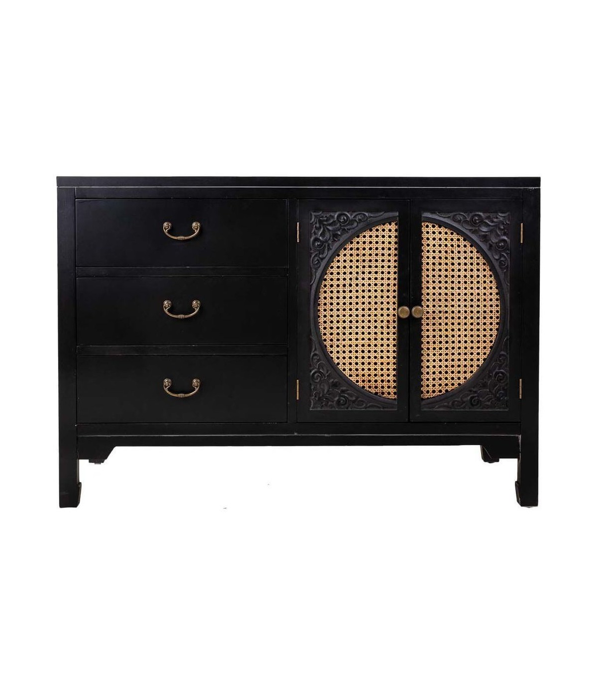 Acabado, artesanal, madera con detalles tallados a mano lacada en negro, ratán natural, tiradores bronce.