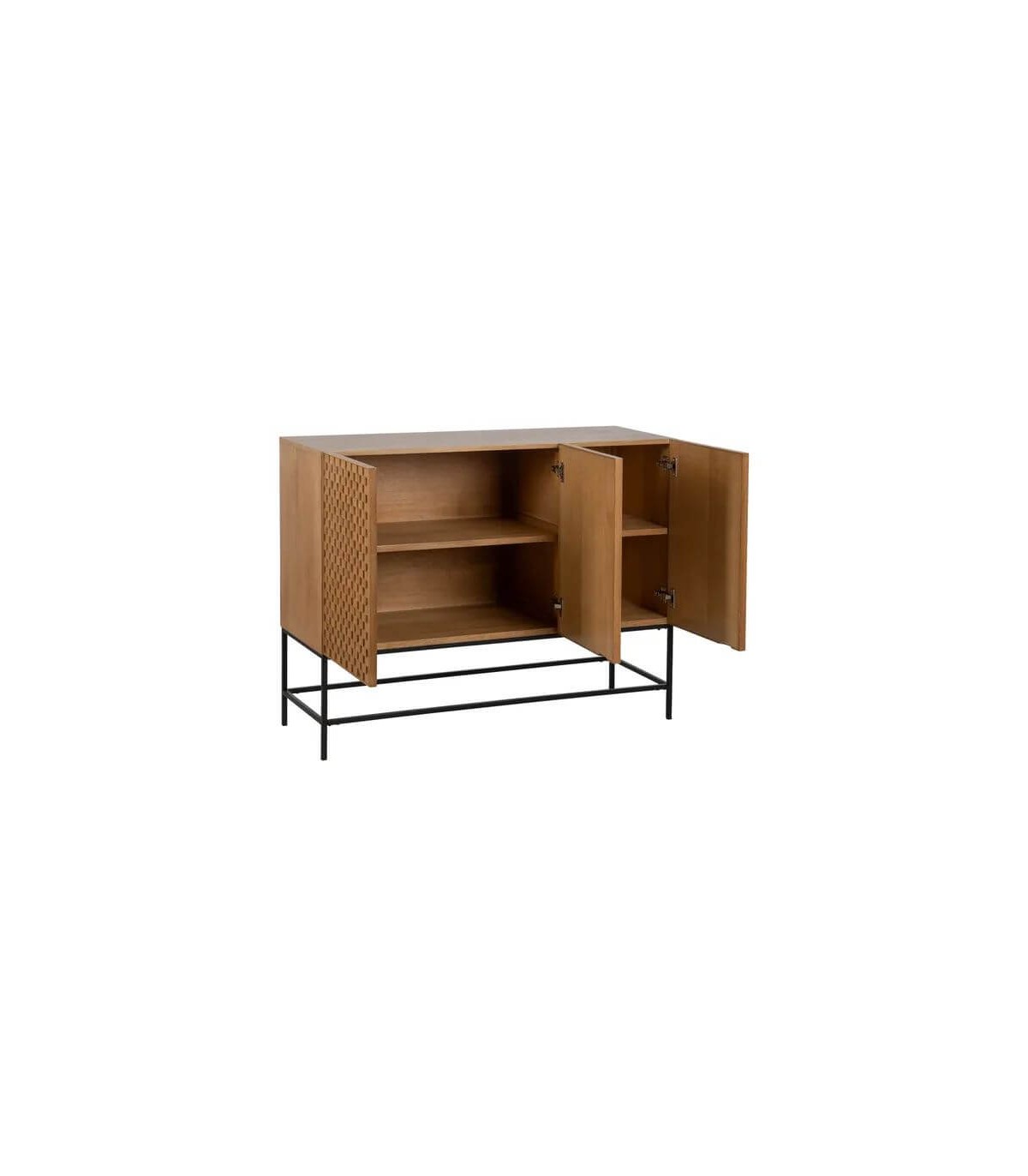 Aparador, realizado en dm acabado fresno natural con las patas en metal negro, de estilo colonial. Dispone 3 puertas, aparador espacioso y muy decorativo.