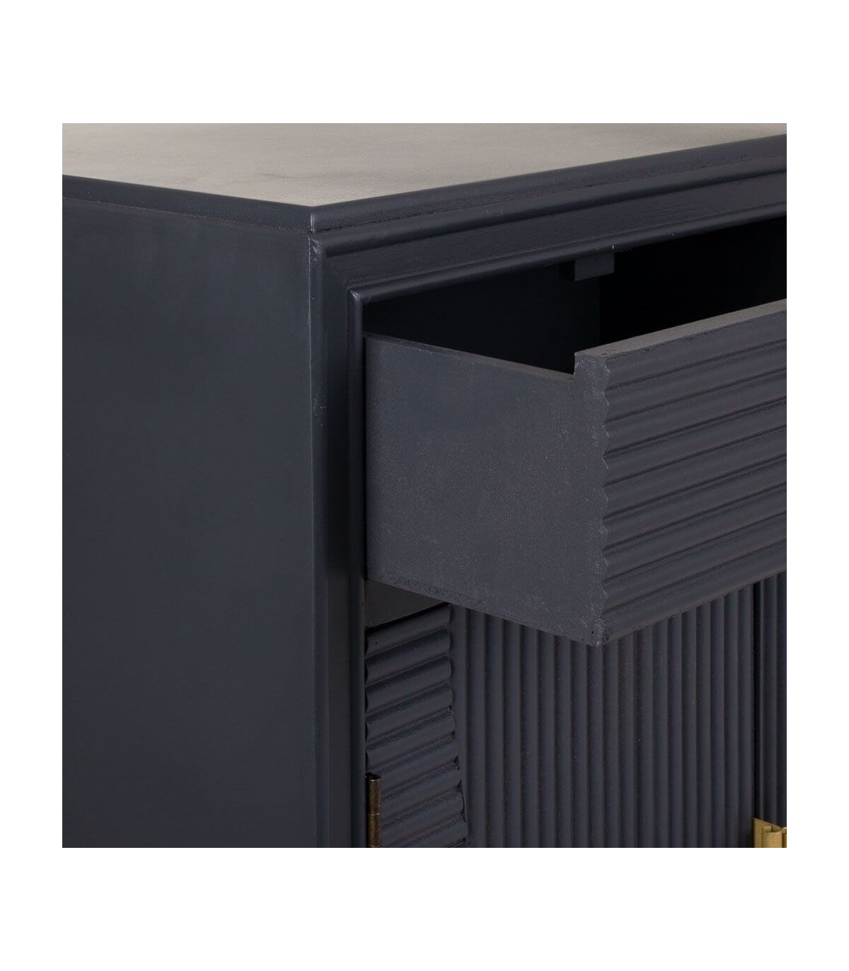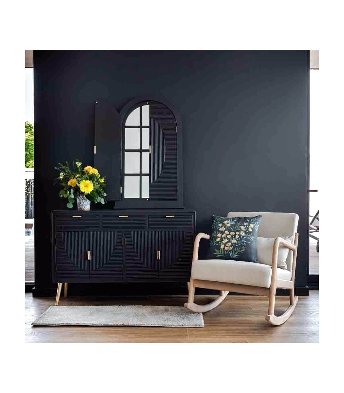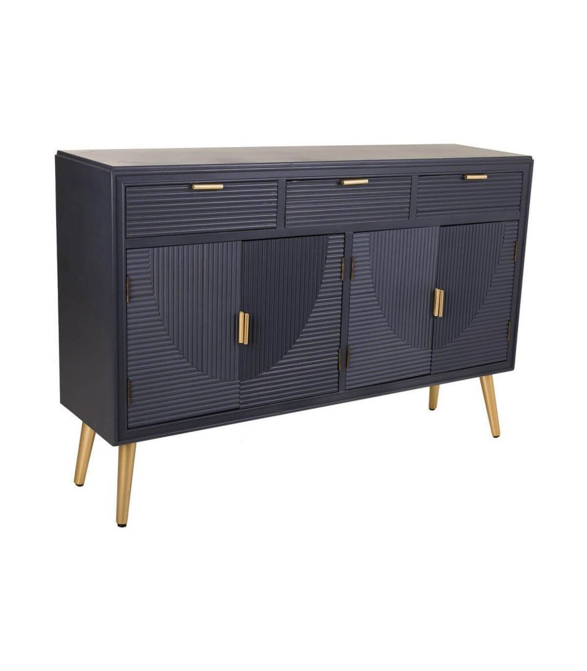 Aparador de nuestra colección Neo, una colección que se caracteriza por su estilo art decó, realizada en madera lacada en negro o blanco, de líneas rectas con el contraste de los dibujos geométricos en sus frentes y el contraste con el oro, una colección muy elegante con muebles y complementos para cualquier lugar de tu casa.