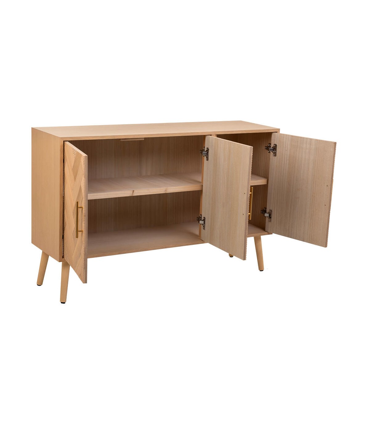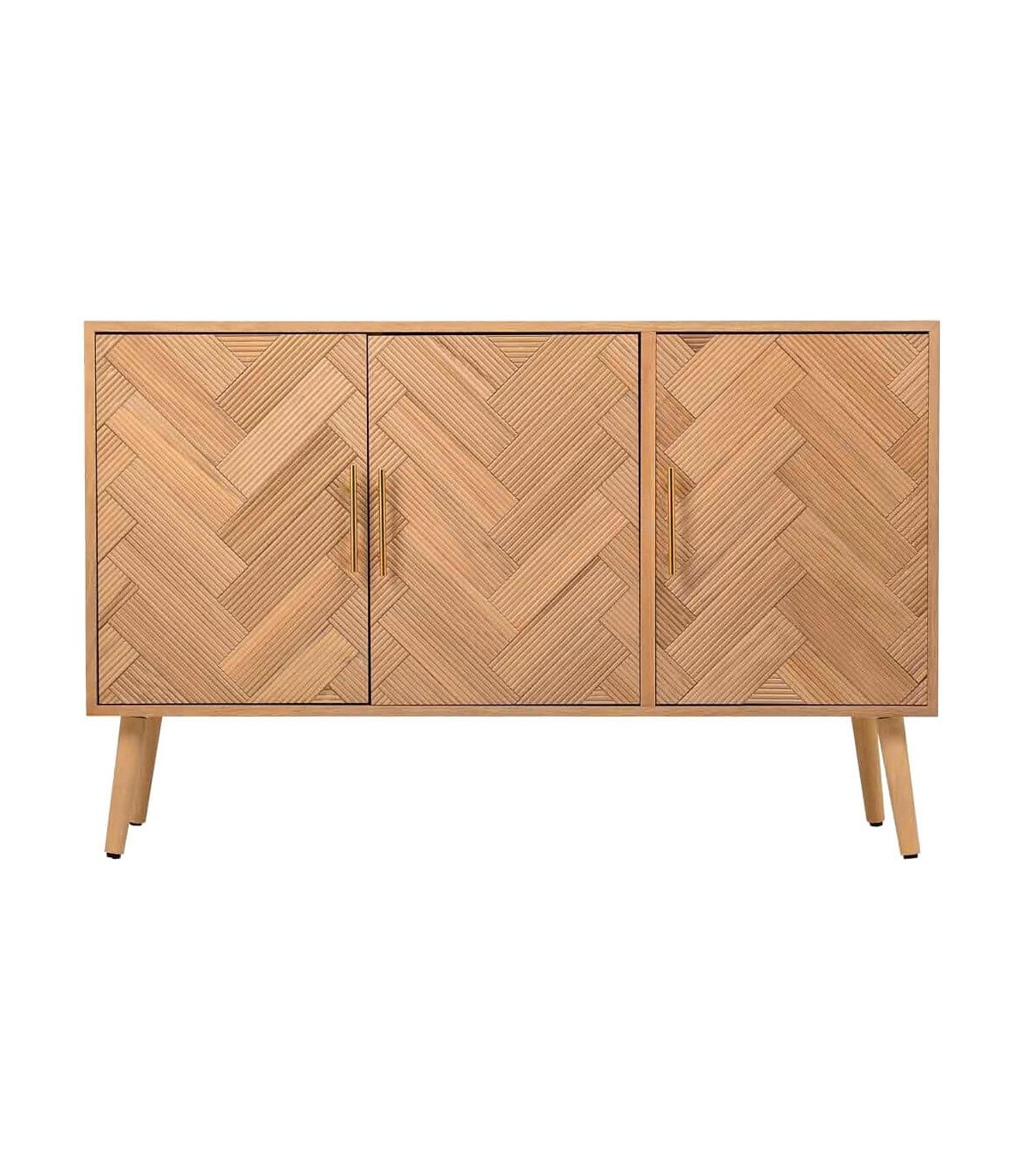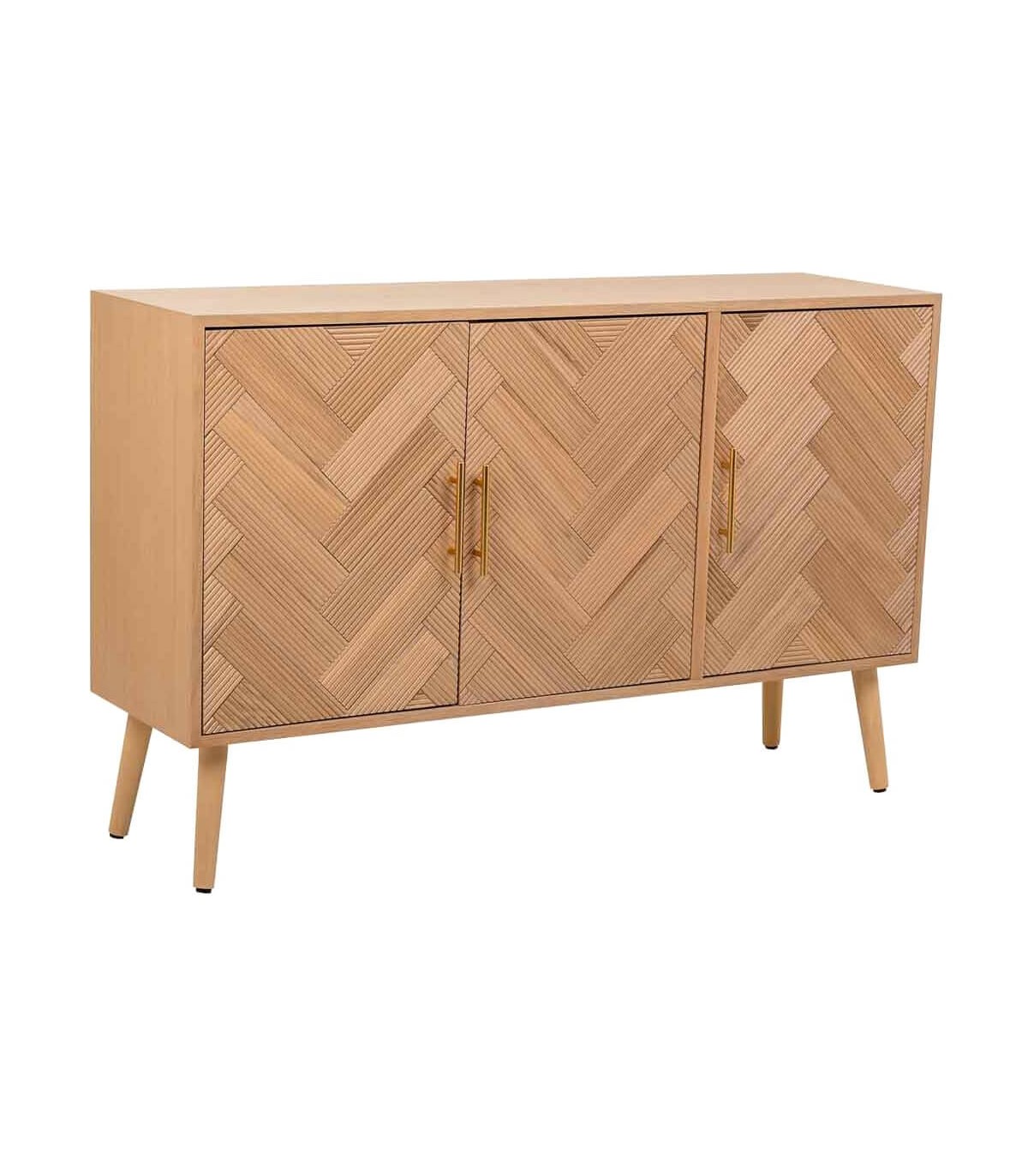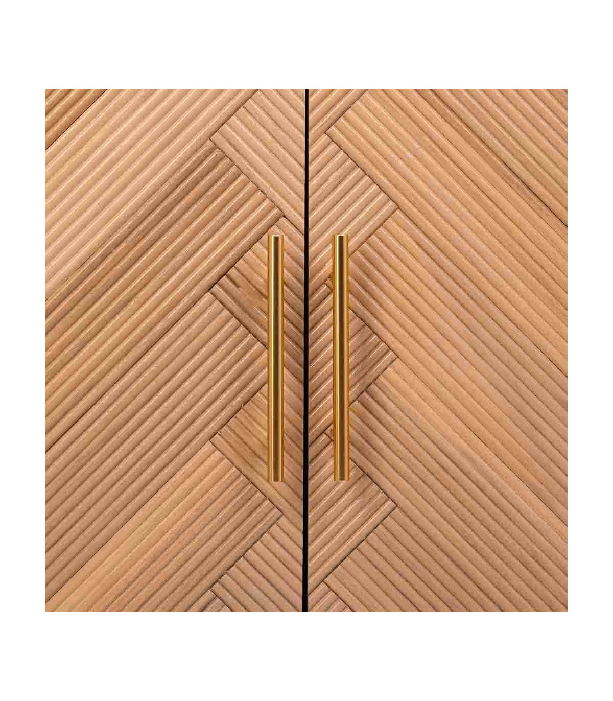 Aparador pequeño realizado en madera de paulonia natural, con 3 puertas, los frentes llevan un dibujo geométrico en a listonado que le da mucho movimiento al mueble, aportándole originalidad.