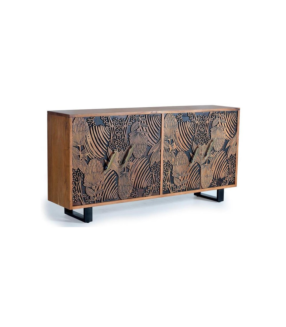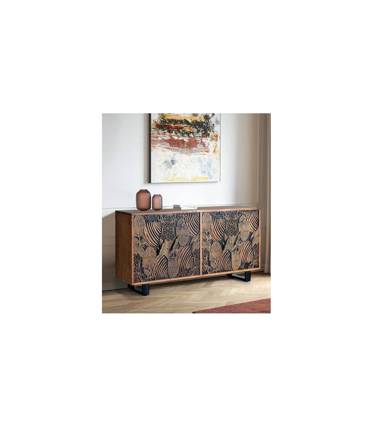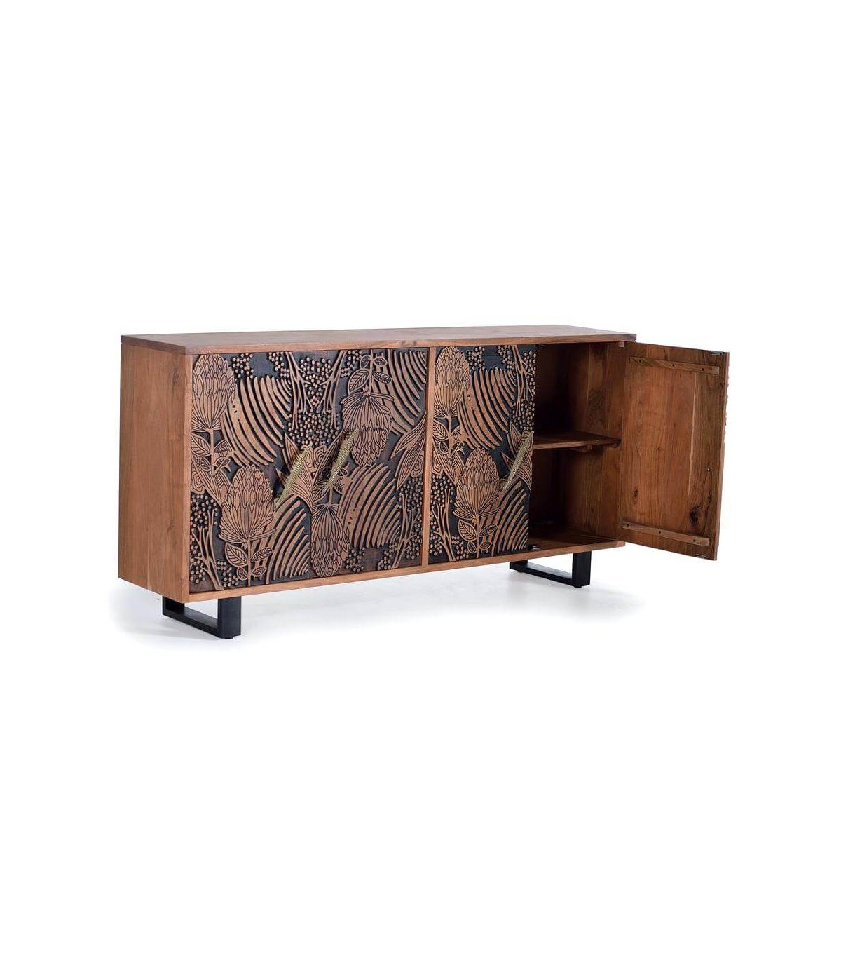 Bonito Aparador de estilo colonial chic, con 4 puertas realizado en madera maciza de acacia natural con los tiradores en forma de hoja que van a juego con el tallado del frente de los cajones, una gran aparador.