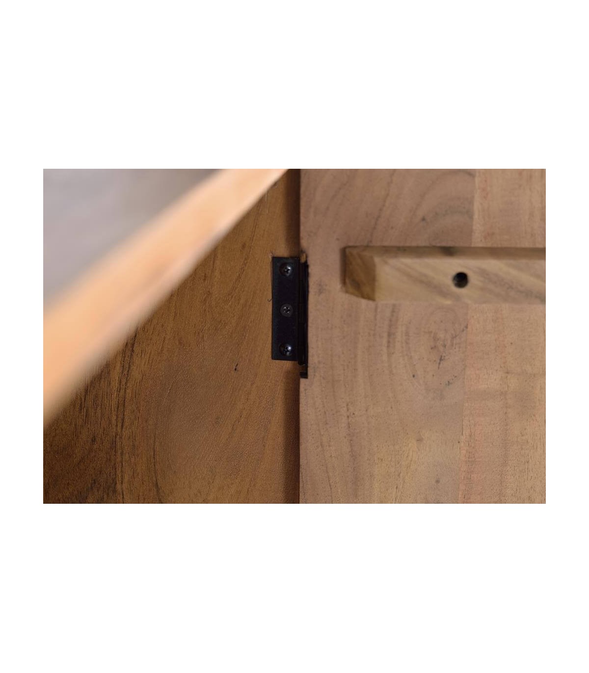 Acabado, madera maciza de acacia natural combinada con negro, patas en metal color negro, tiradores en forma de hoja que hace juego con el frente de los cajones. Fabricación artesanal. entendemos las variaciones de tonalidad, tamaño y forma o ciertas imperfecciones (grietas, nudos, marcas) como un valor añadido que la convierten en pieza única.
