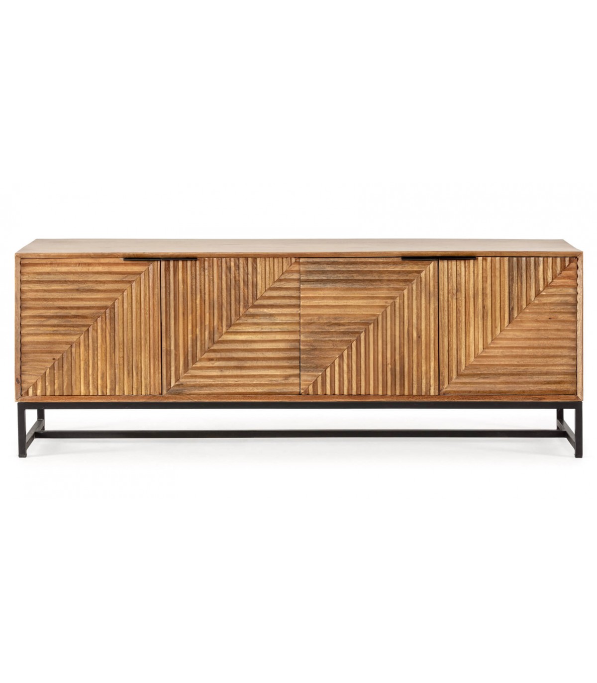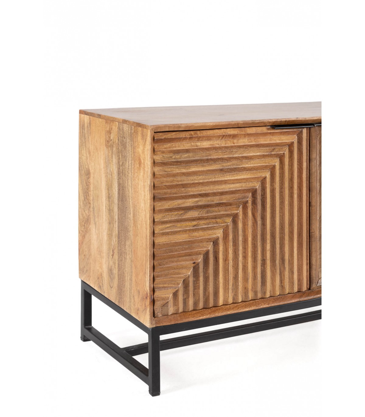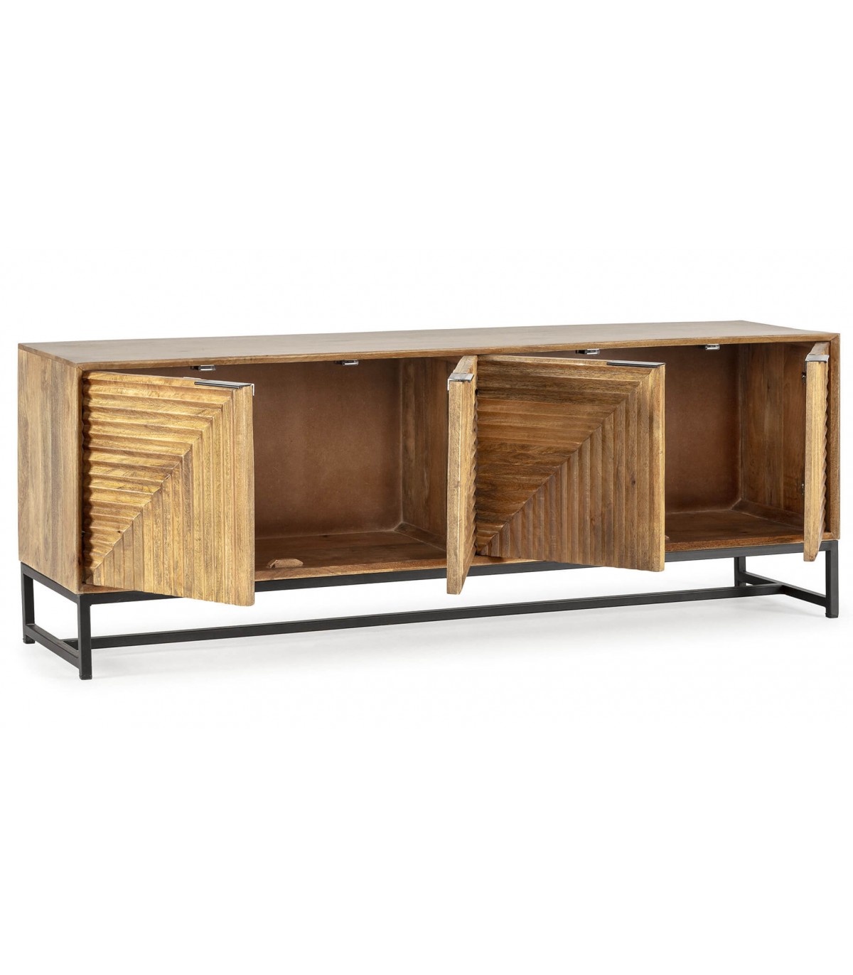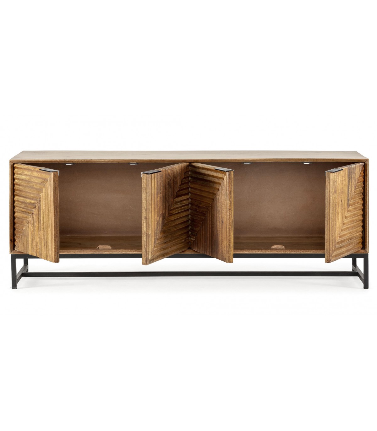 Aparador realizado en madera tallada natural, patas y tiradores en metal negro, con 4 puertas, los frentes llevan un dibujo tallado a mano que le da mucho movimiento al mueble, aportándole originalidad.