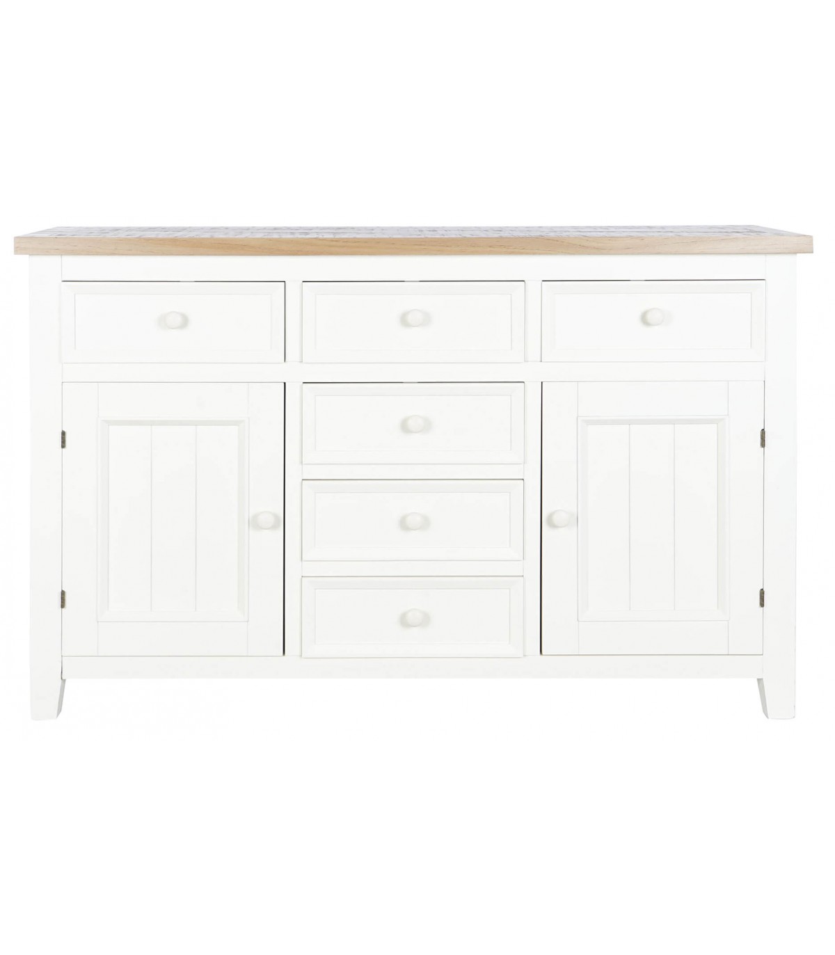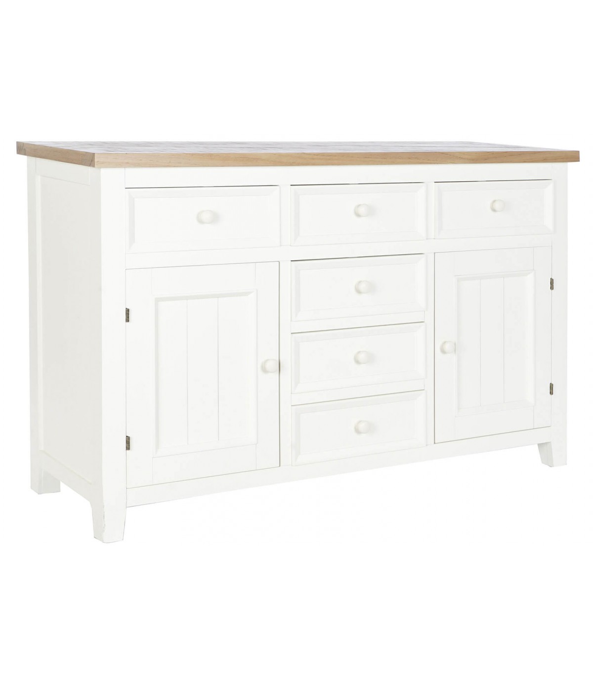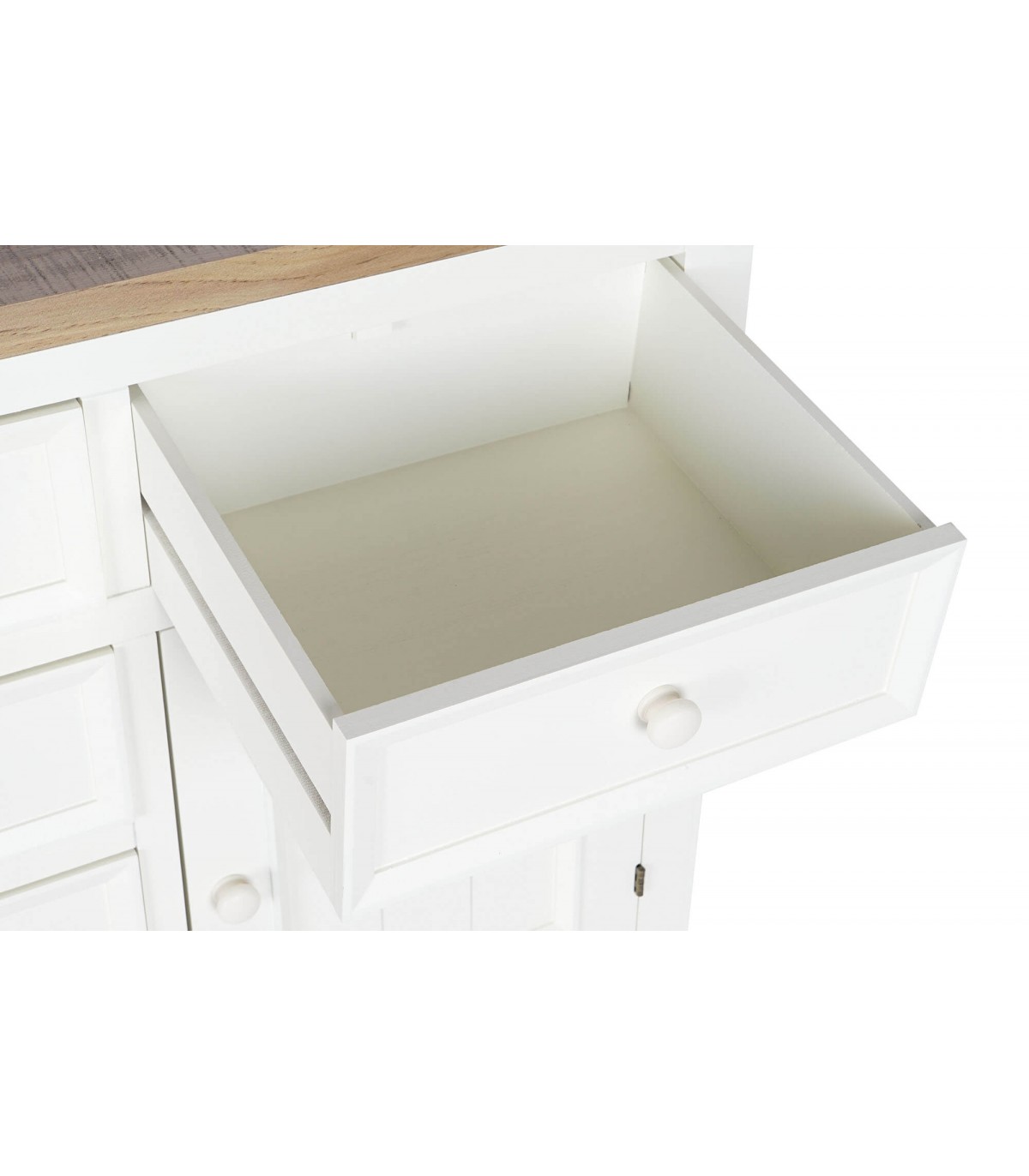 Aparador de estilo rústico con 6 cajones y 2 puertas realizado en madera de paulonia con la tapa natural y el resto lacado en blanco.