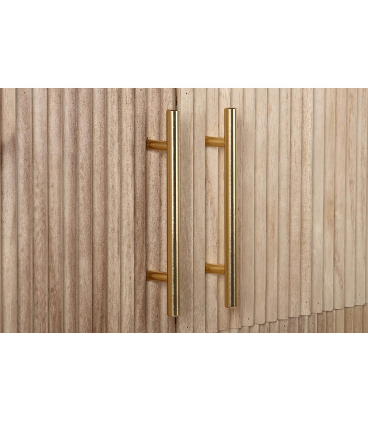 Aparador de nuestra colección Mandoline. Se caracteriza por su estilo contemporáneo con un toque art decó, realizada en madera maciza de paulonia con el contraste del tiradors en hierro acabado oro, una colección perfecta para tu dormitorio o salón.