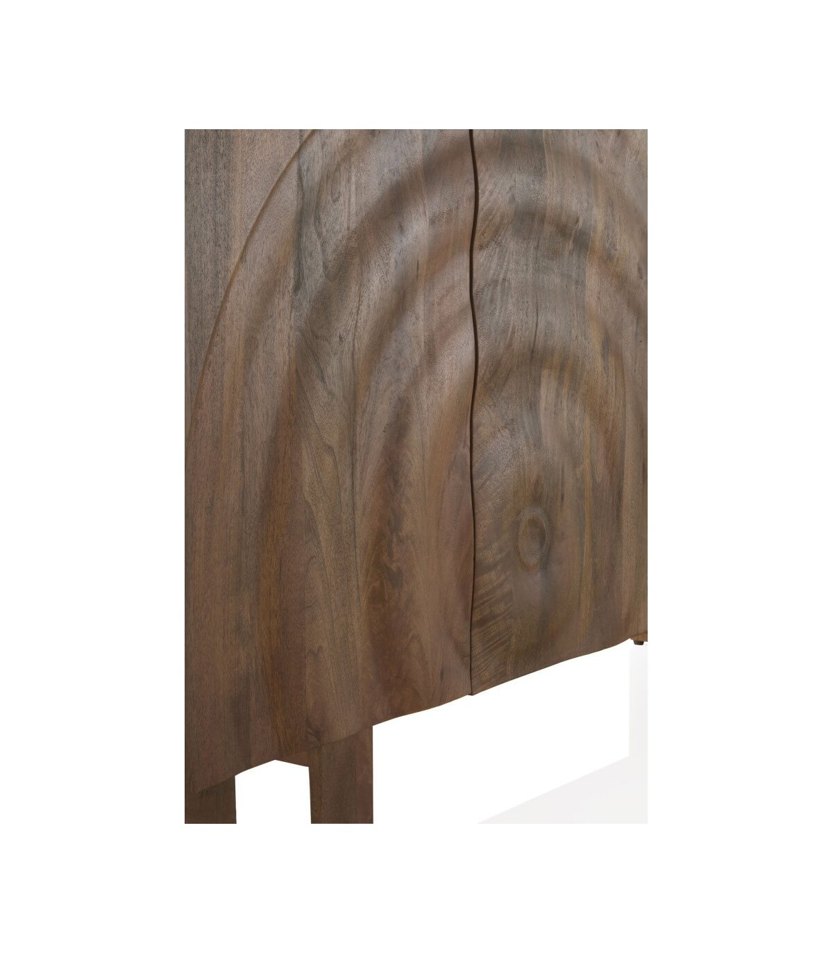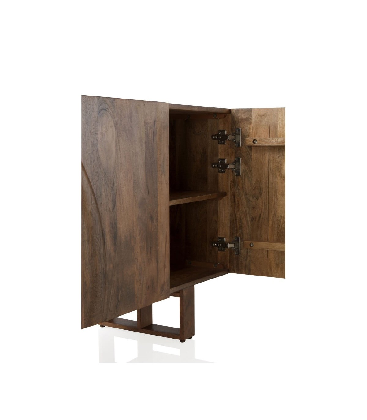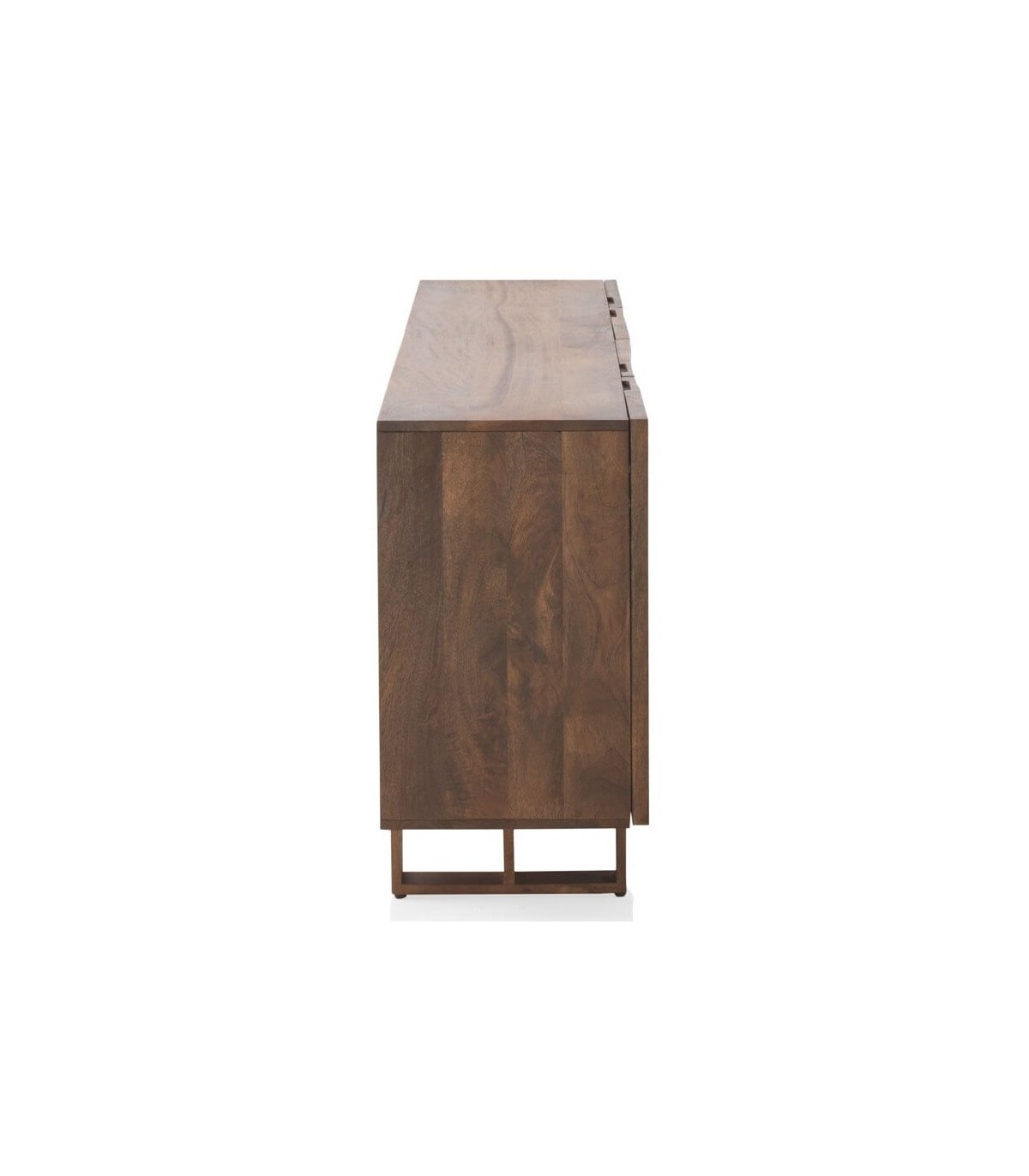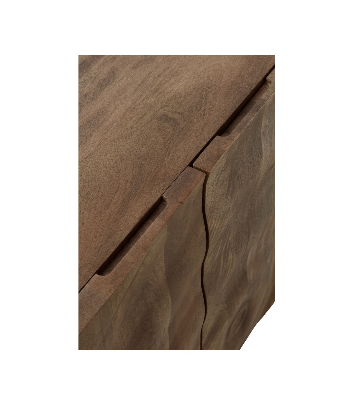 Acabado, artesanal, madera de mango natural con relieve en forma de honda al frente de dos de los cajones.