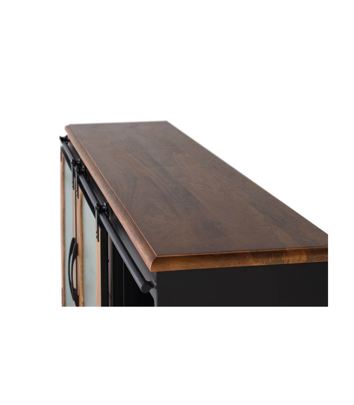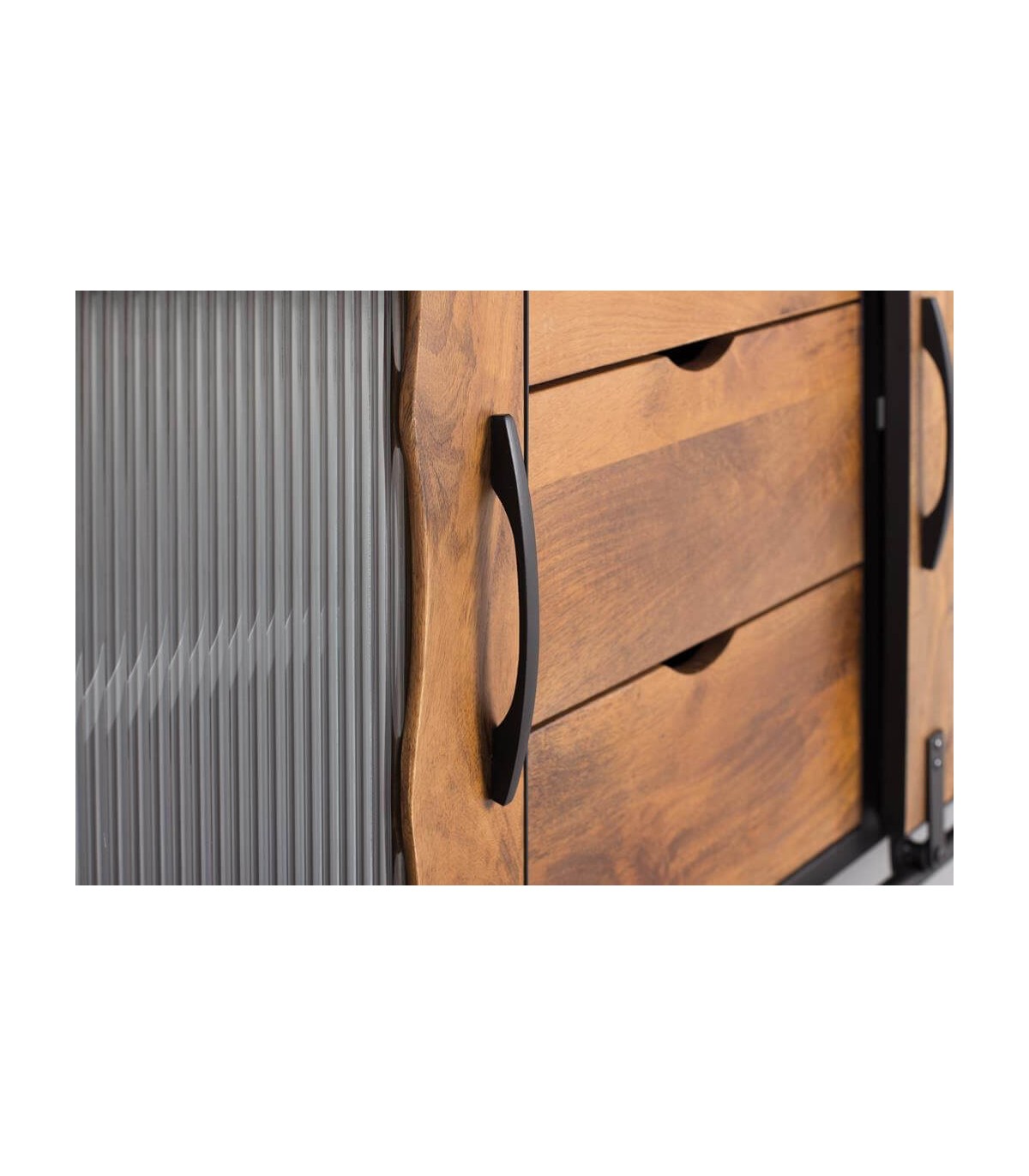 - Acabado, artesanal, estructura en madera maciza de mango acabado natural, puerta, guías y tiradores en metal negro, cristal corrugado.