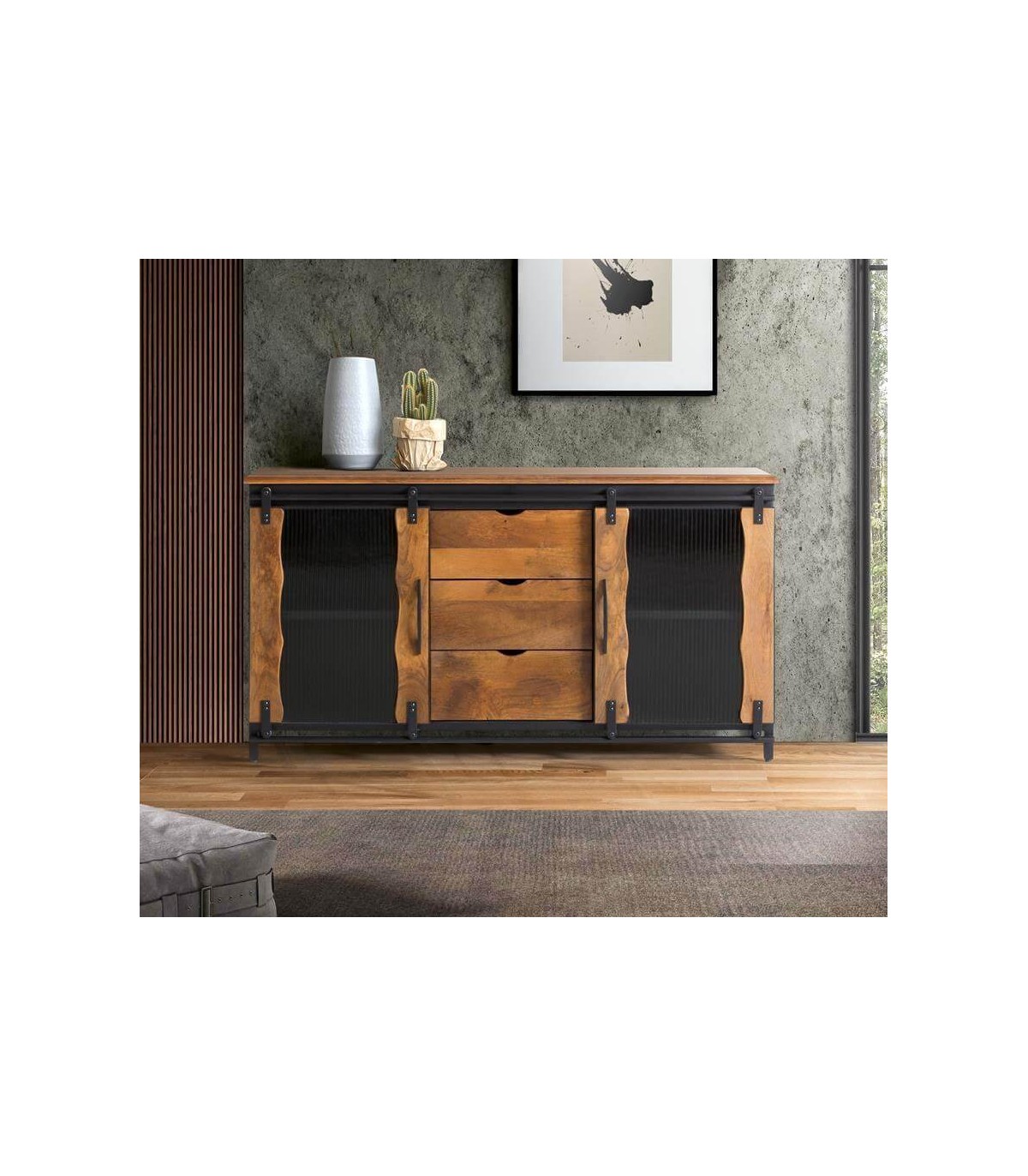 - Aparador, 3 cajones, 2 puertas correderas, estilo industrial.