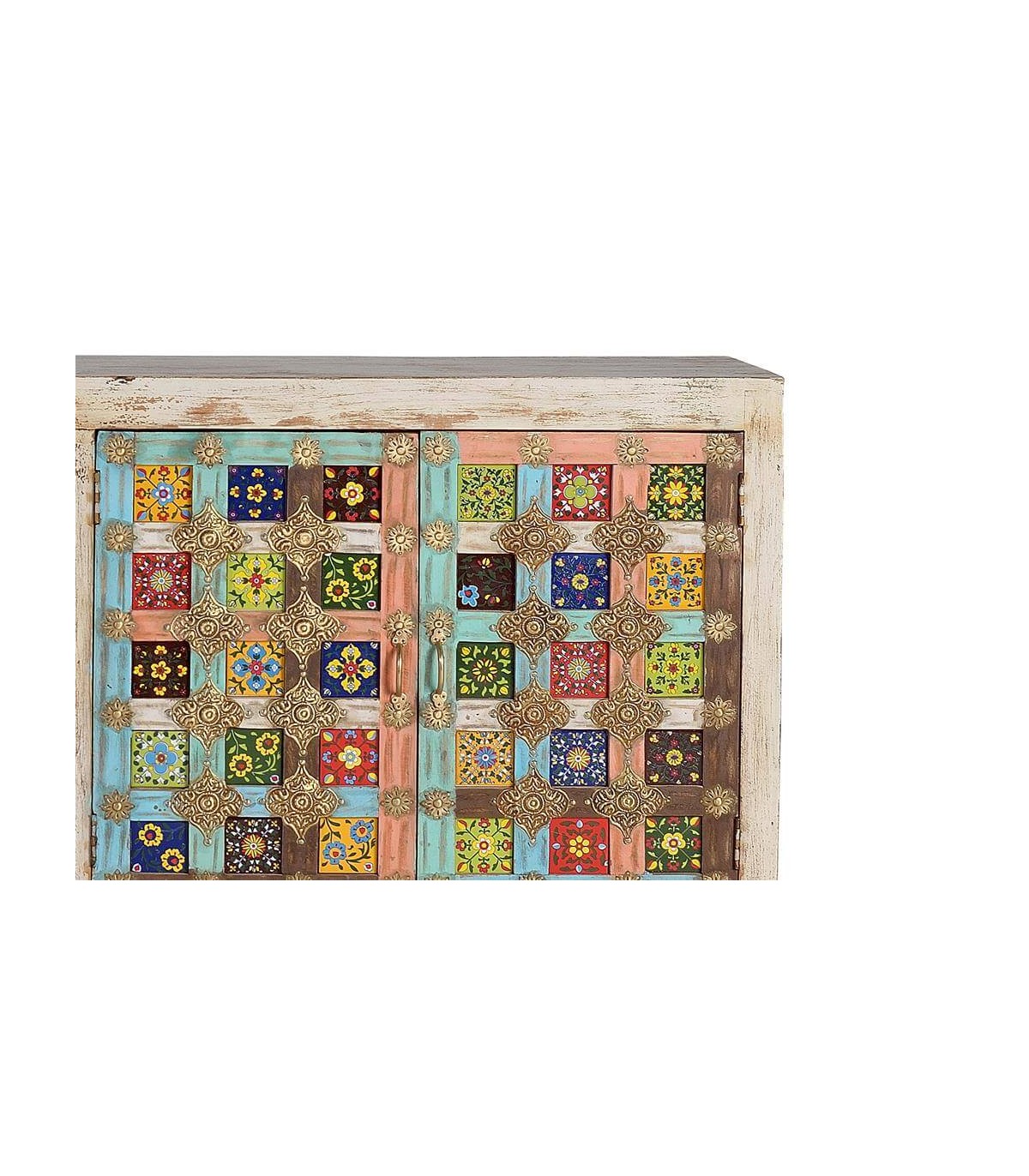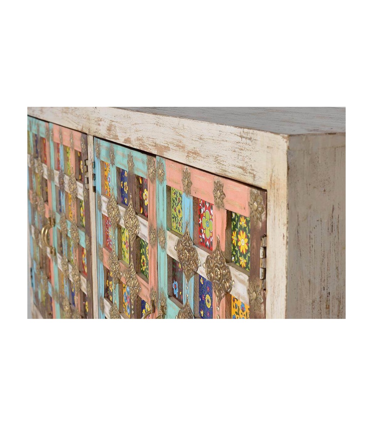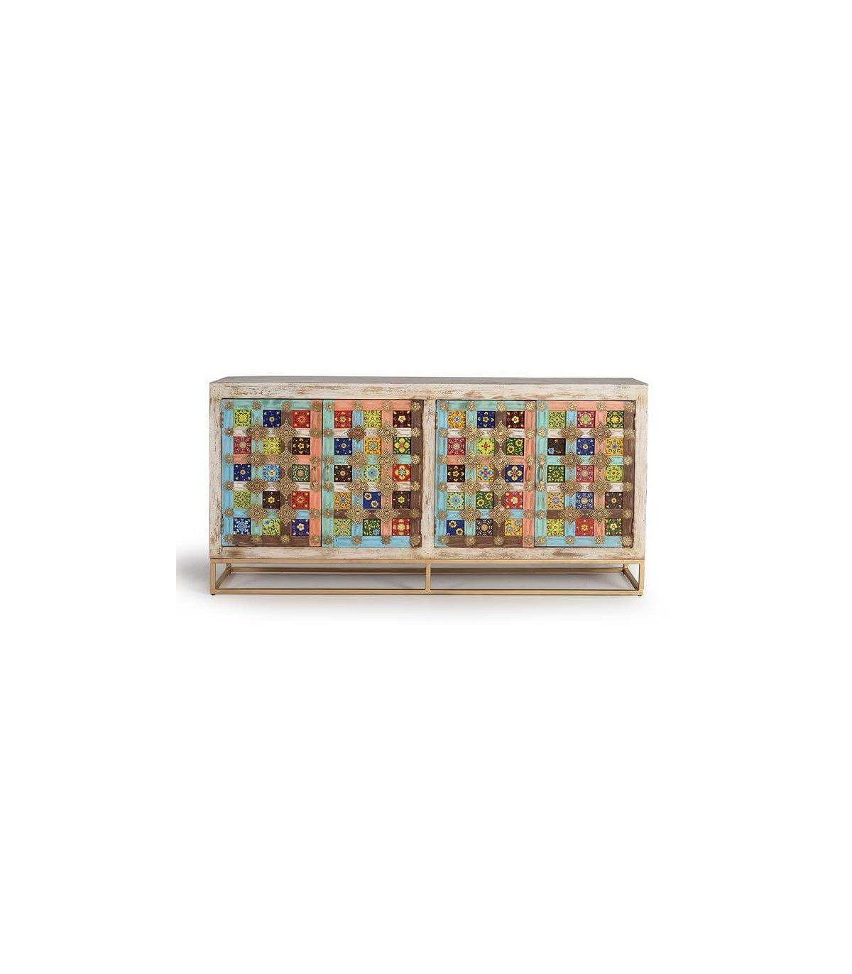 Aparador con el exterior realizado en madera de mango acabado blanco rozado, interior teñido en color caoba, con aplicaciones en azulejo multi color y bronce con la base en metal dorado.