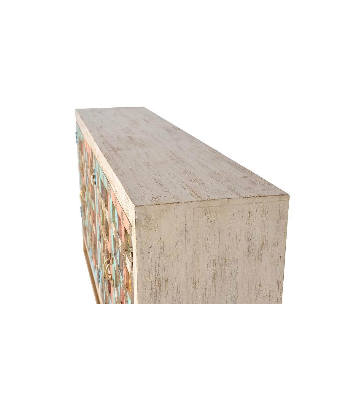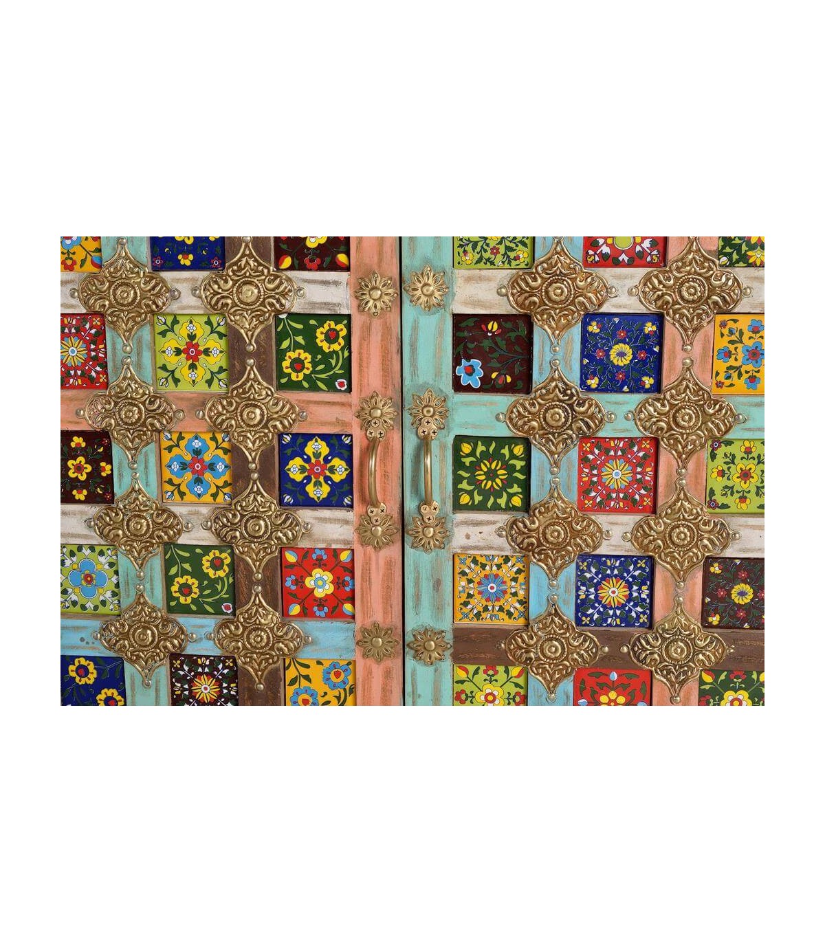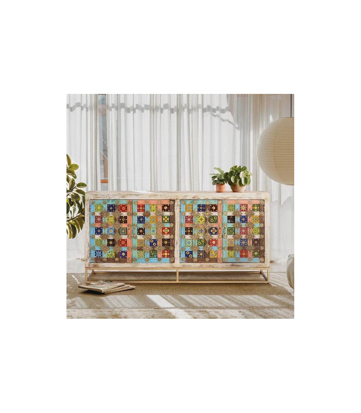 Aparador con el exterior realizado en madera de mango acabado blanco rozado, interior teñido en color caoba, con aplicaciones en azulejo multi color y bronce con la base en metal dorado.