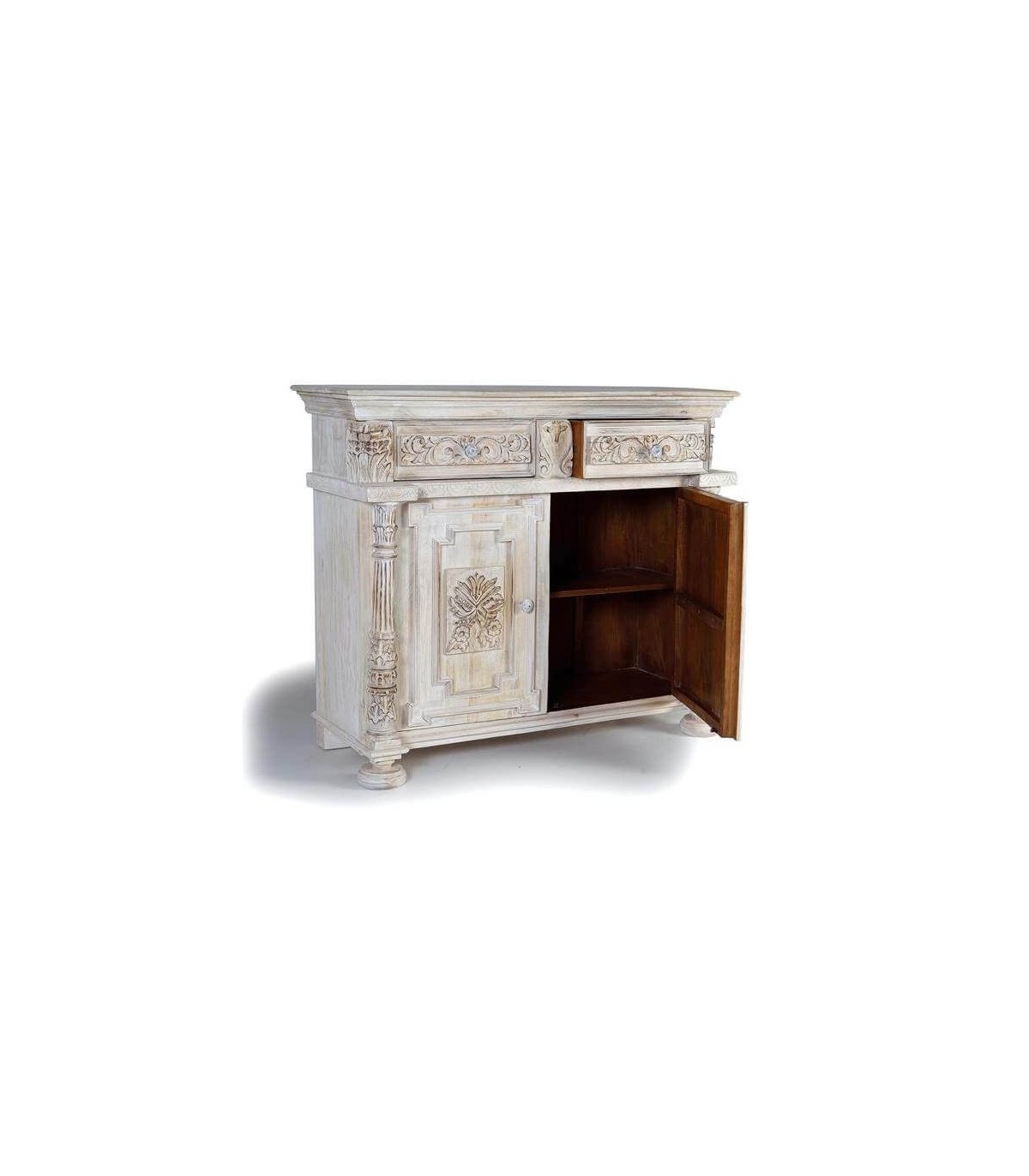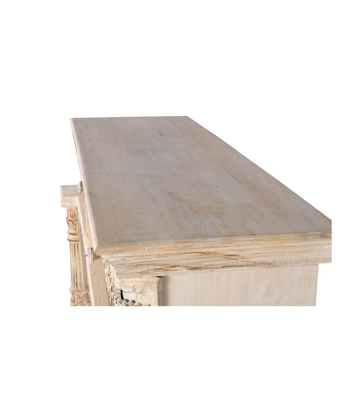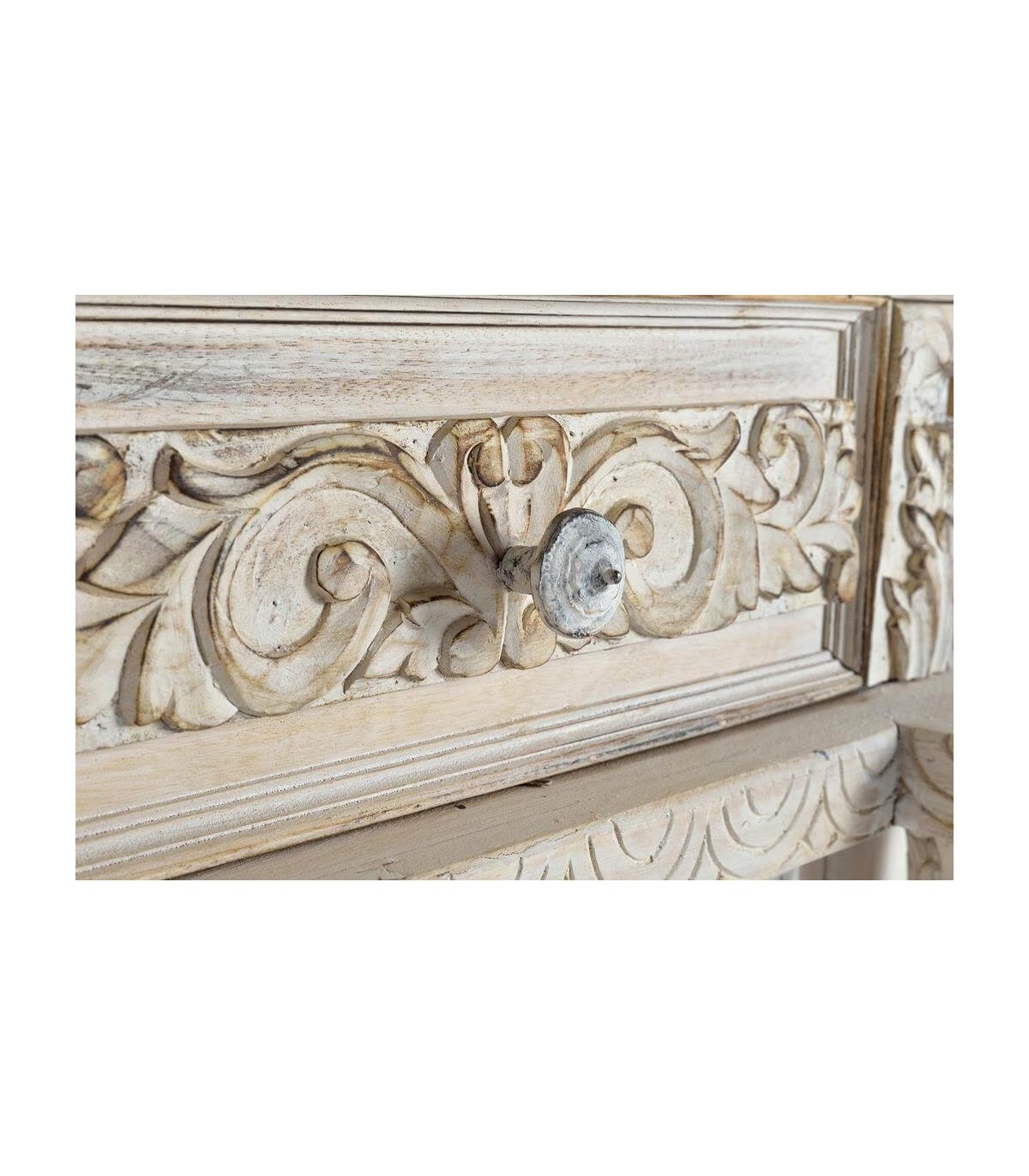 Acabado, acabado totalmente artesanal, madera natural tallada a mano, lavada en blanco y envejecida, interior color caoba, tiradores en bronce patinados a juego.