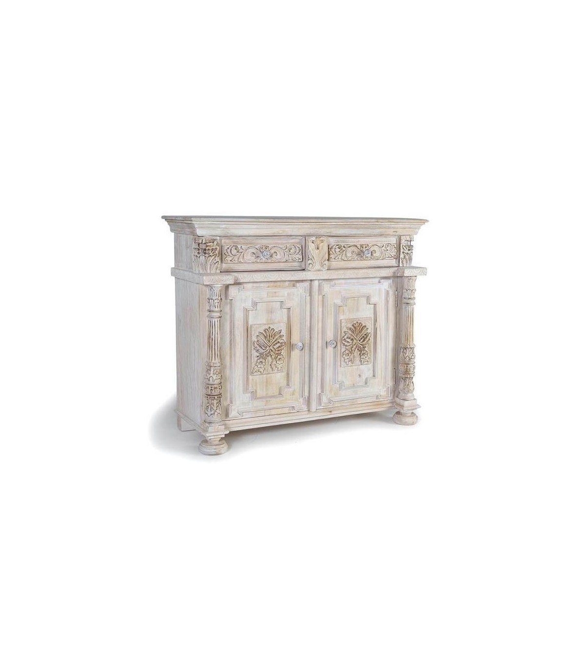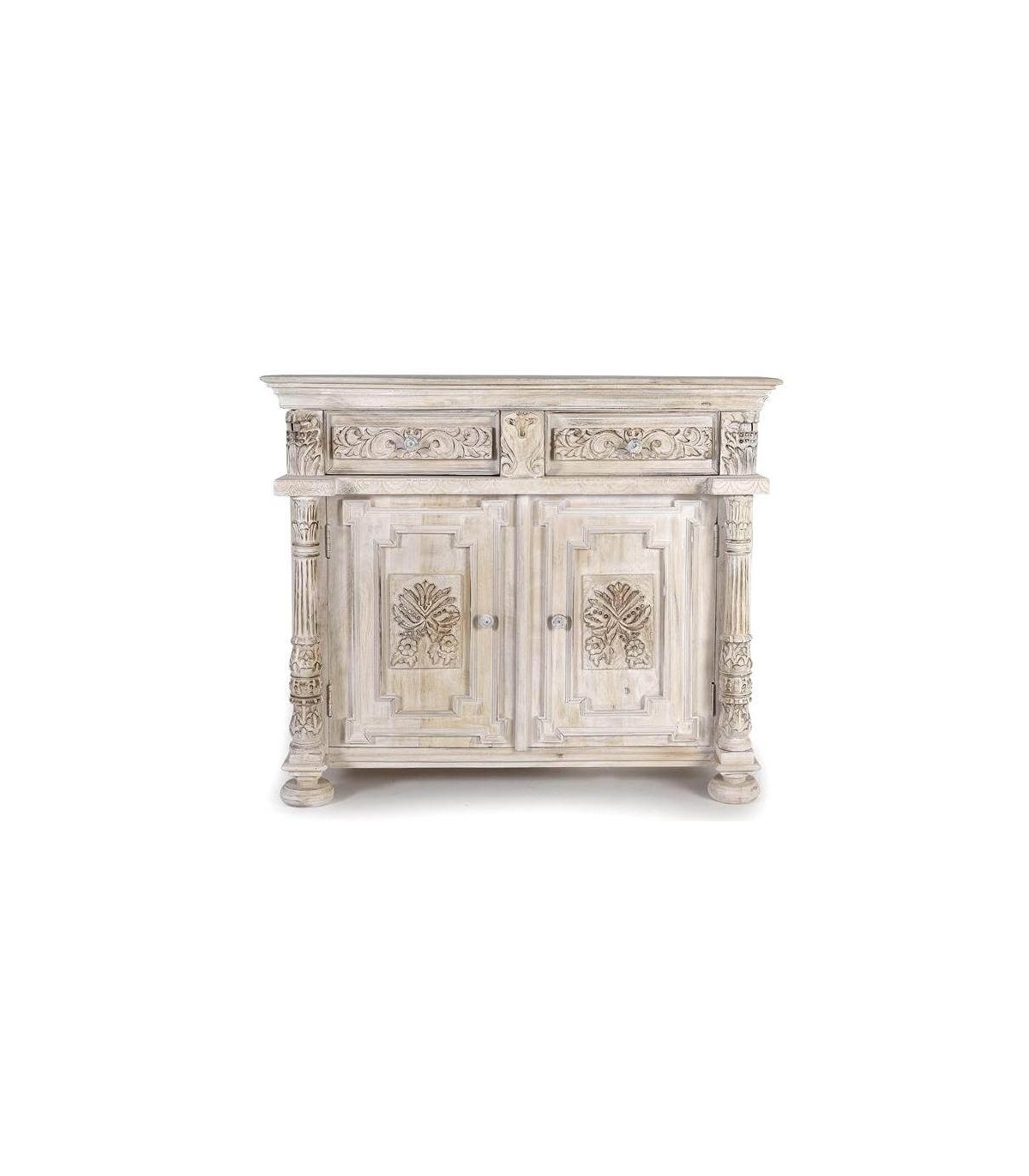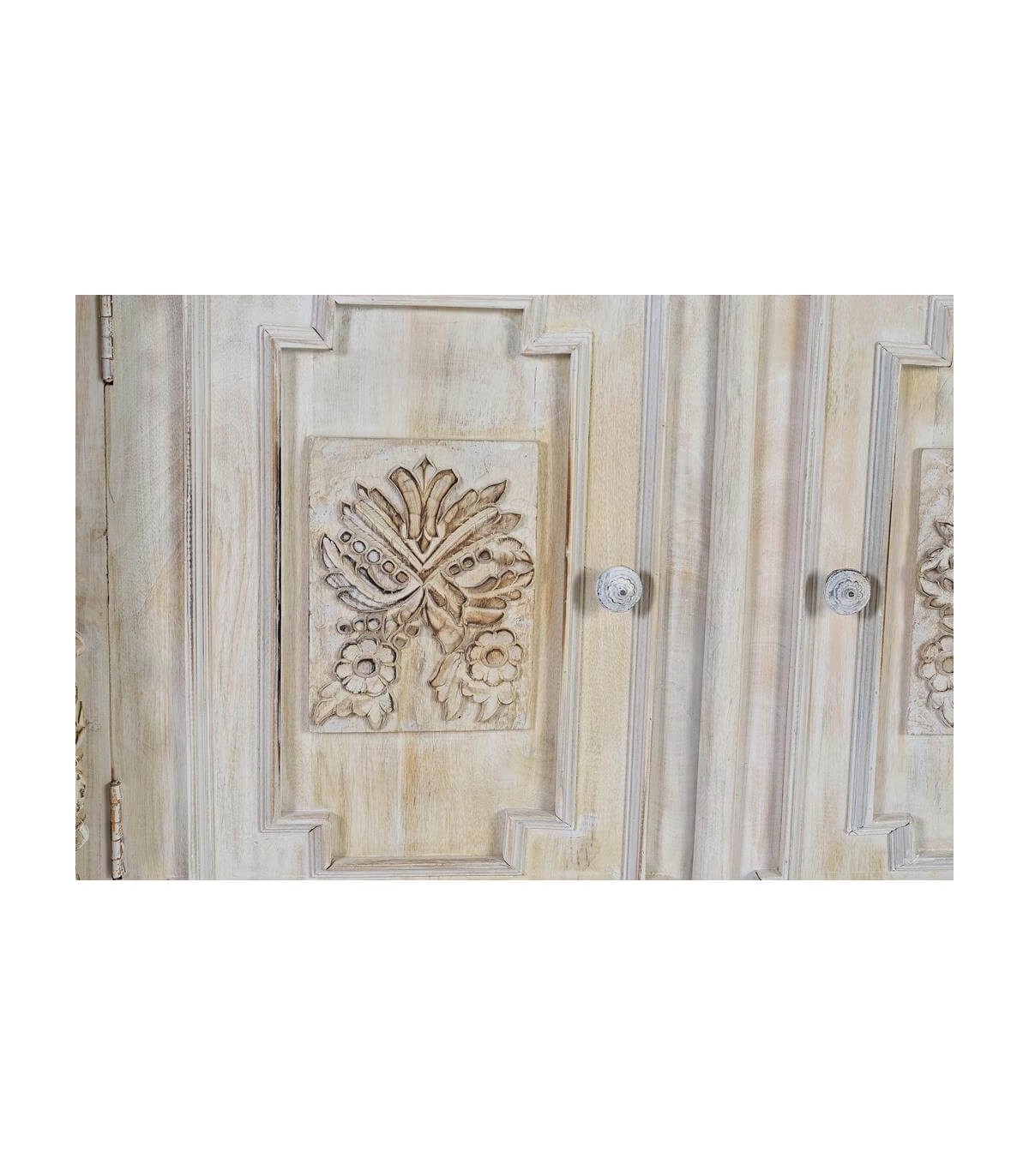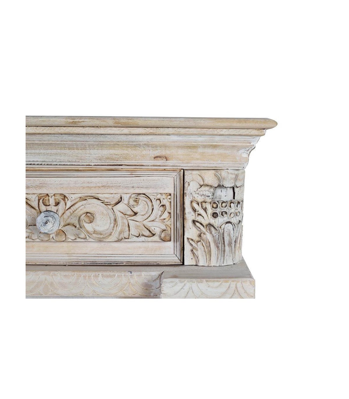 Acabado, acabado totalmente artesanal, madera natural tallada a mano, lavada en blanco y envejecida, interior color caoba, tiradores en bronce patinados a juego.