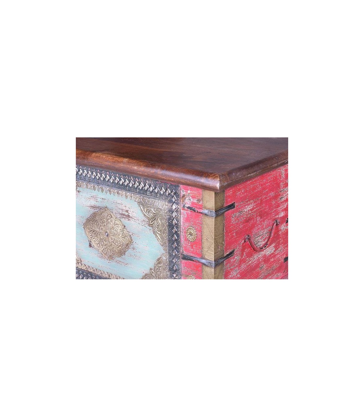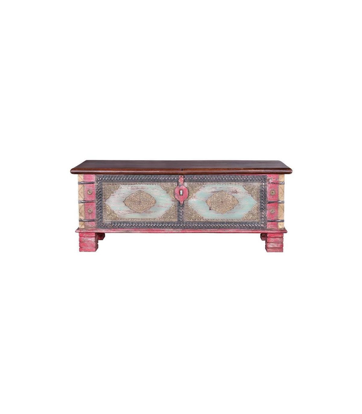 Baúl realizado artesanalmente en madera maciza de mango con aplicaciones en bronce, un mueble muy decorativo y versátil, perfecto para poner una nota étnica en tu decoración.