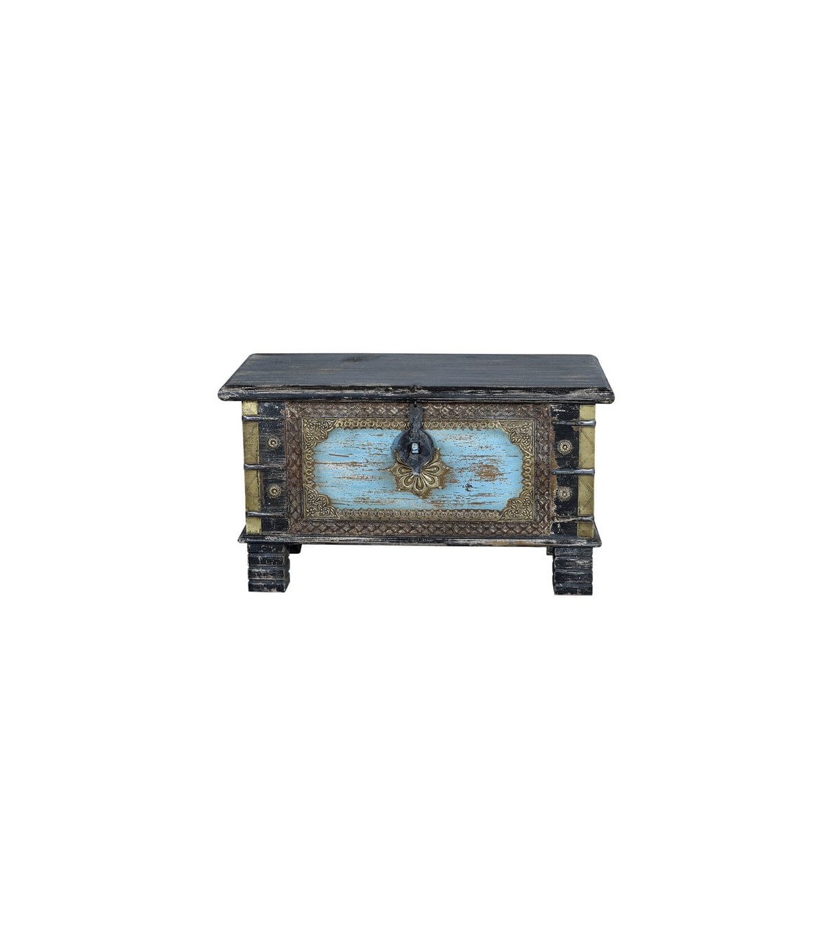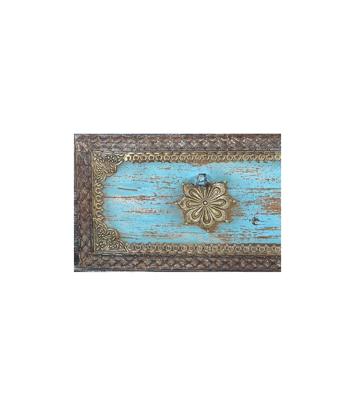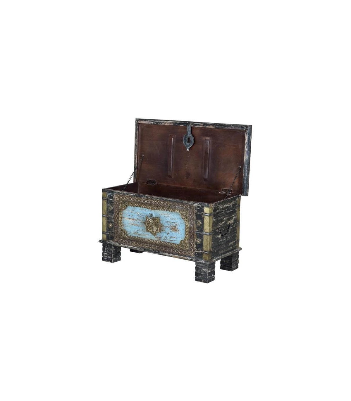 Baúl realizado artesanalmente en madera maciza de mango con aplicaciones en bronce, un mueble muy decorativo y versátil, perfecto para poner una nota étnica en tu decoración.