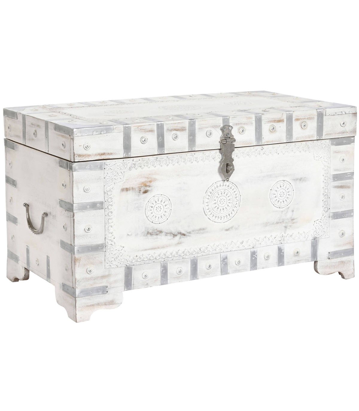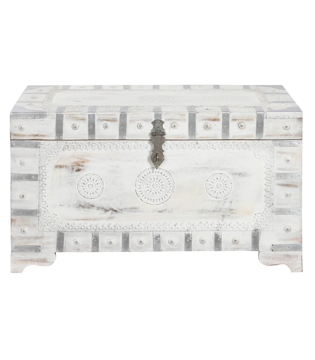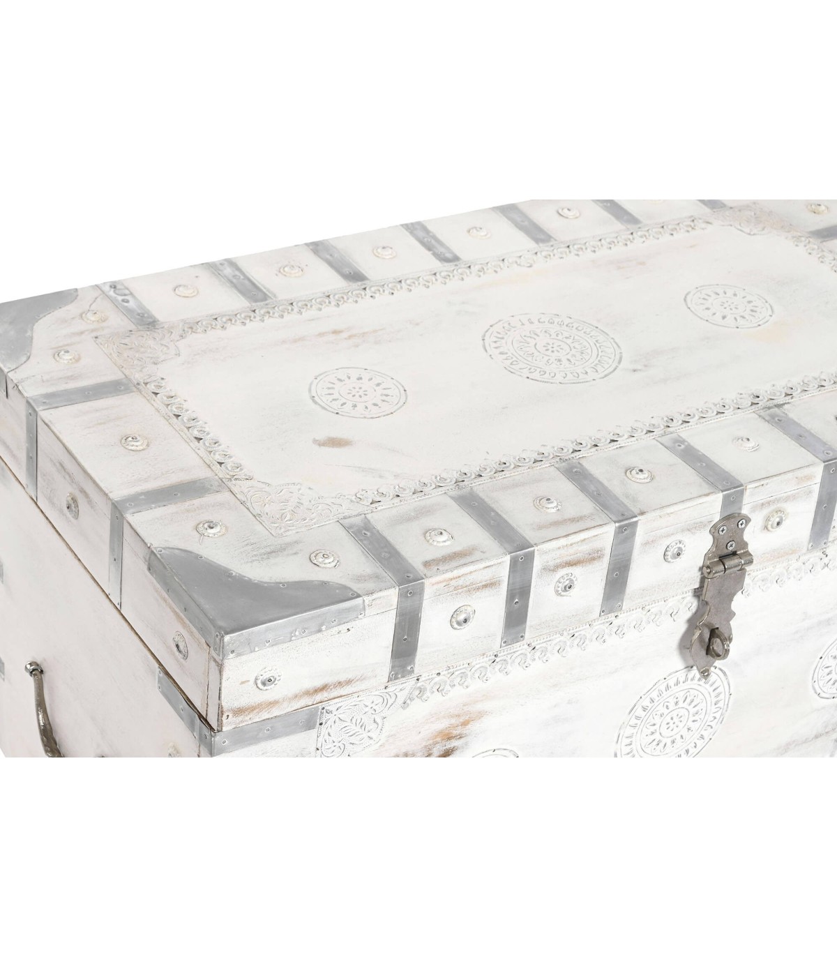 Baúl estilo étnico en madera de mango tallada y acabado a mano, blanco envejecido ,ideal como mesa de centro o pie de cama en tu dormitorio.