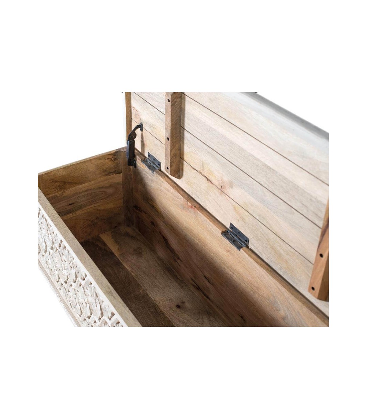 Baúl realizado en madera maciza de mango natural tallada y teñida en blanco artesanalmente, un baúl importante de buena capacidad que puede utilizarse como meas de centro y sin duda será el centro de atención.