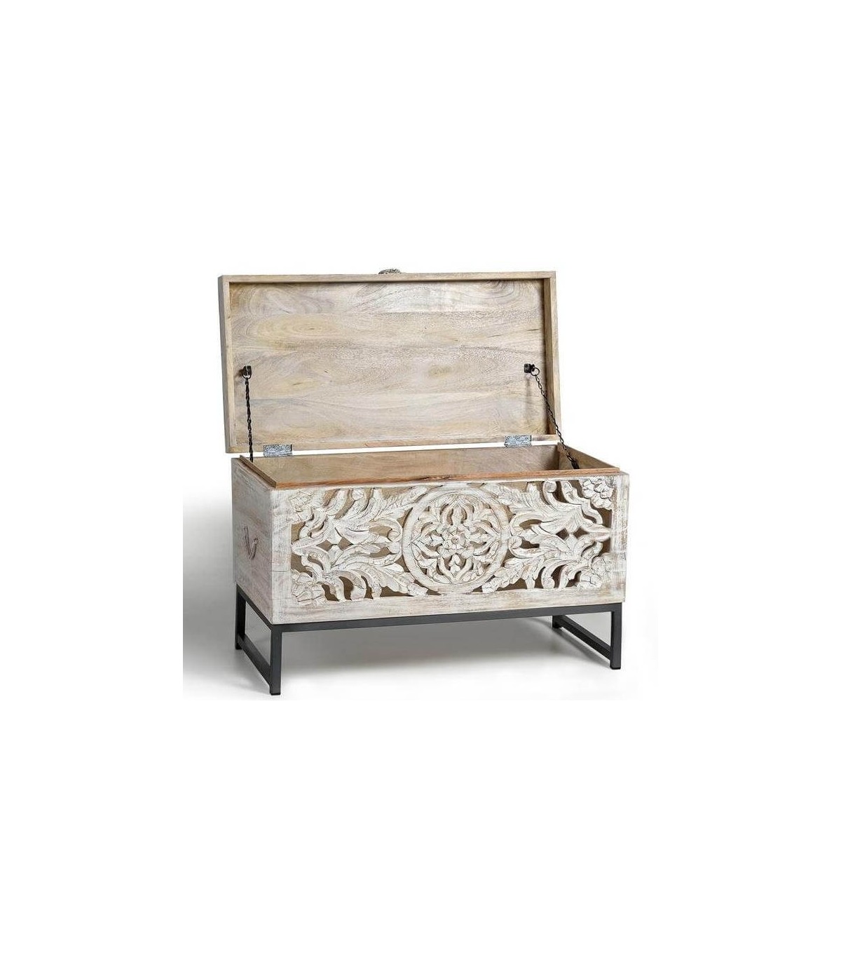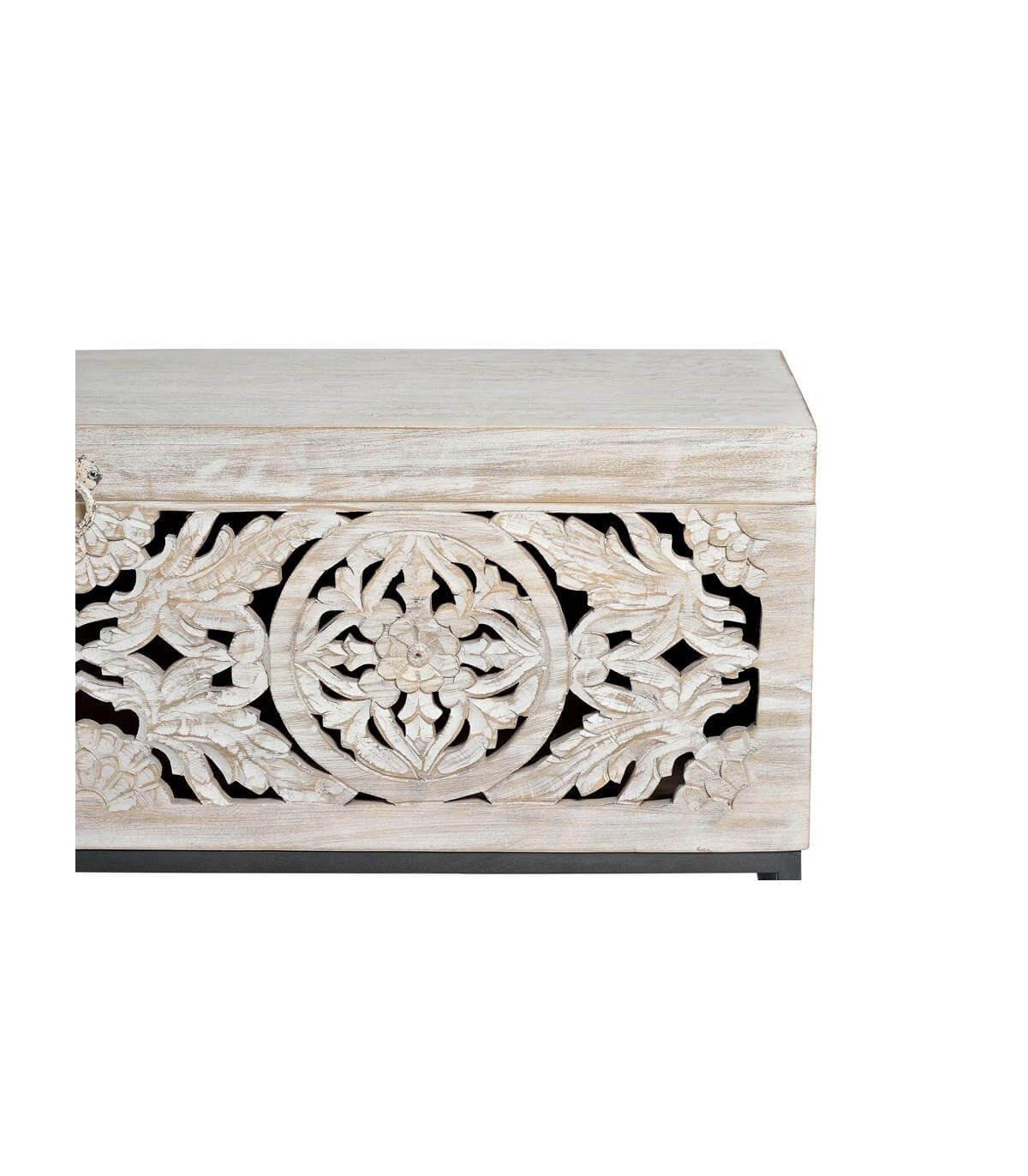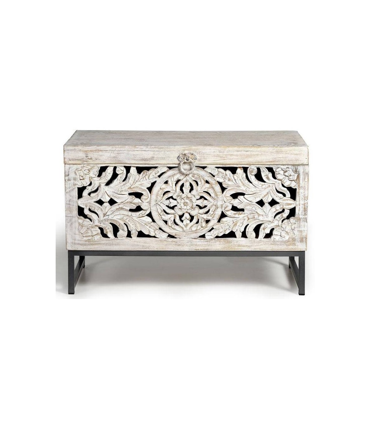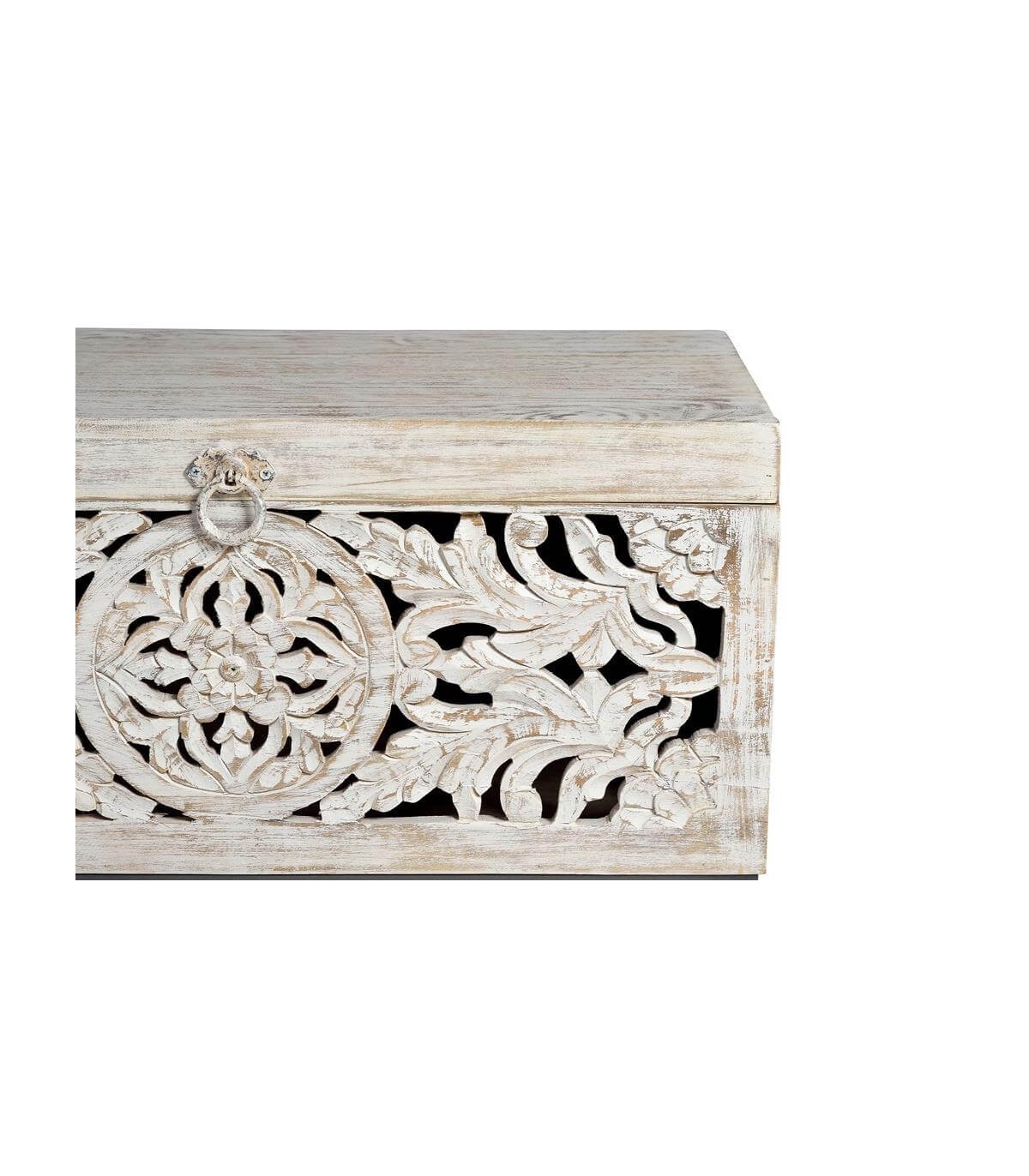 • Este baúl pequeño es una auténtica joya decorativa que aúna funcionalidad y arte tallado a mano. Fabricado en madera maciza de mango con acabado natural blanqueado, destaca por su espectacular talla frontal, de inspiración floral y étnica, que convierte cada pieza en un objeto de colección.
