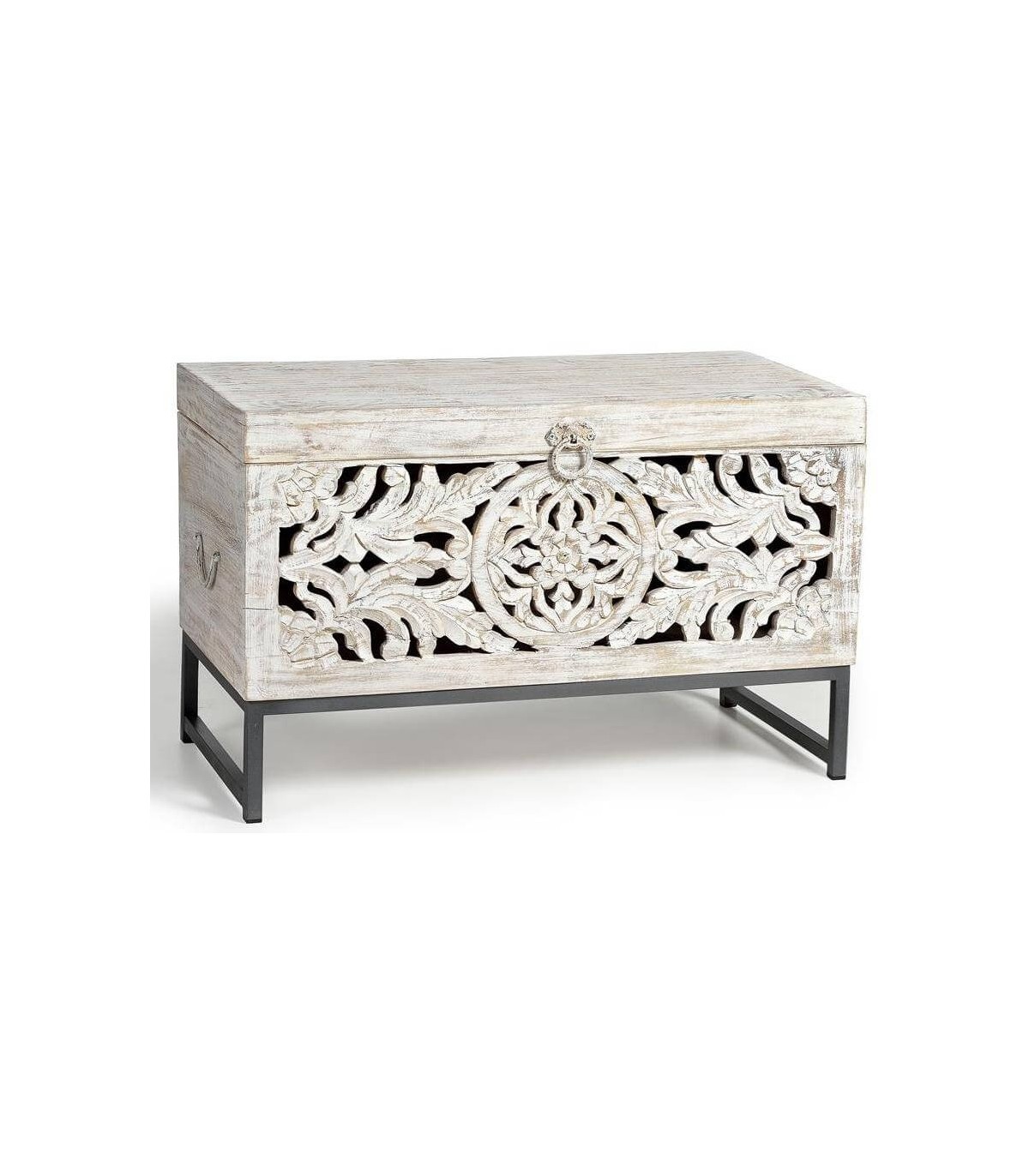 • 🧳 Baúl Pequeño de Madera Tallada Blanqueada – Estilo Étnico con Base Metálica Gris ✨