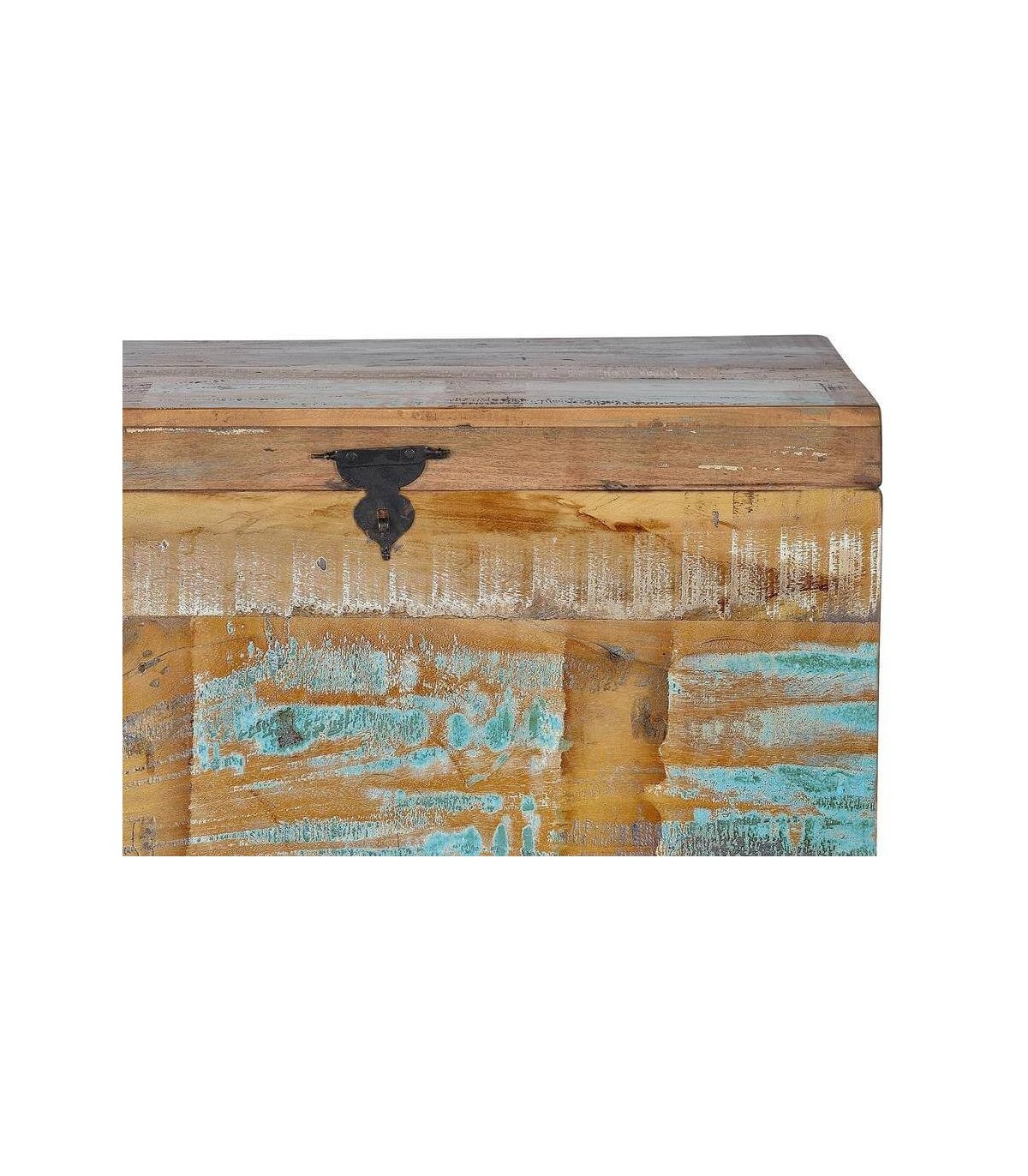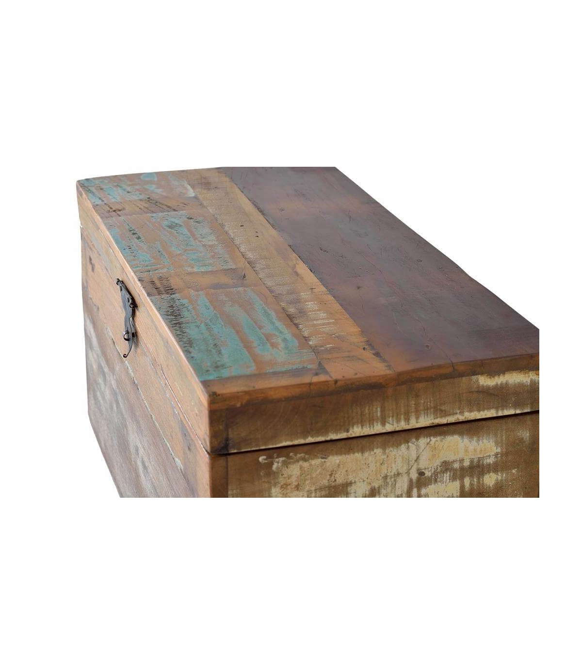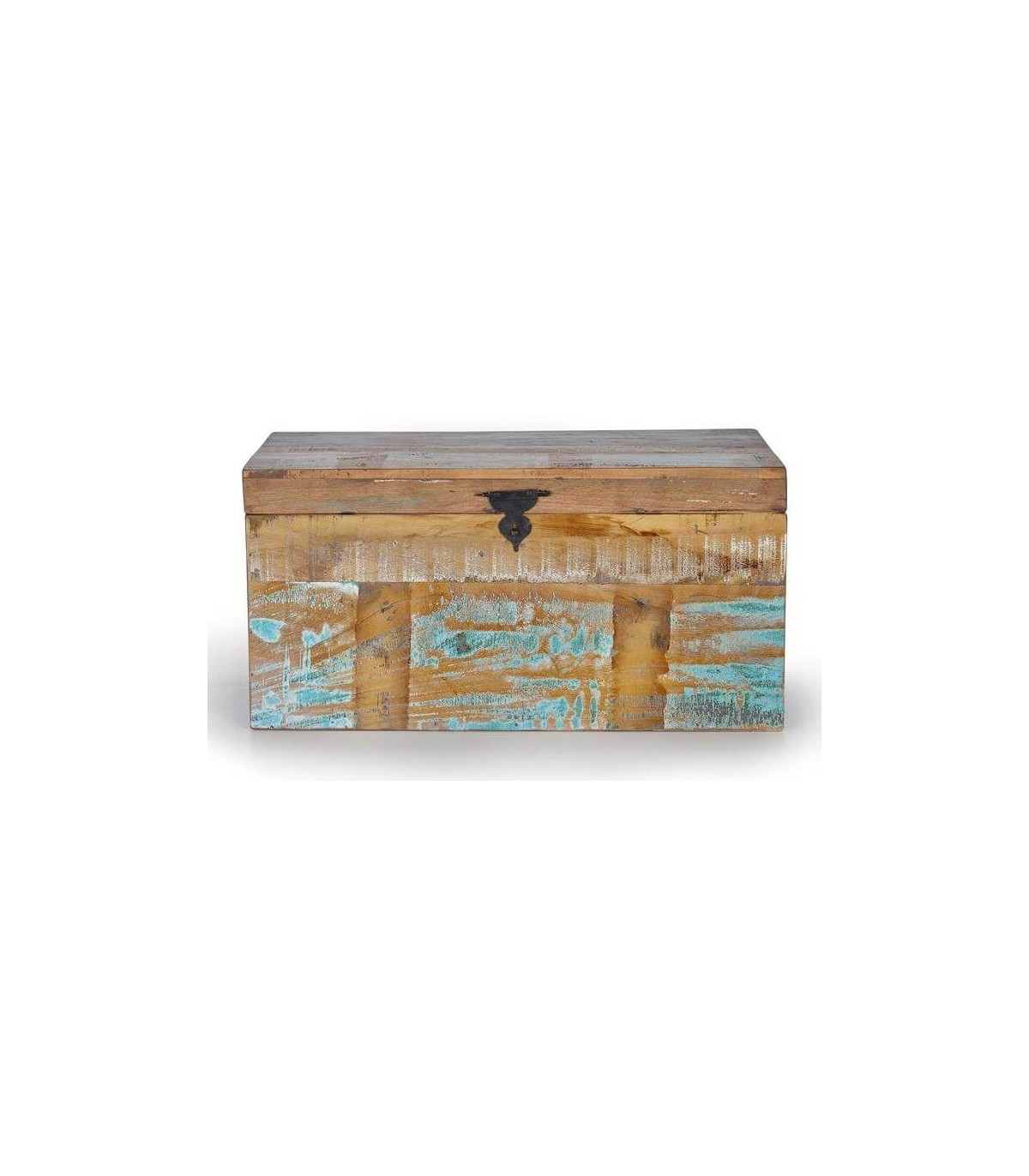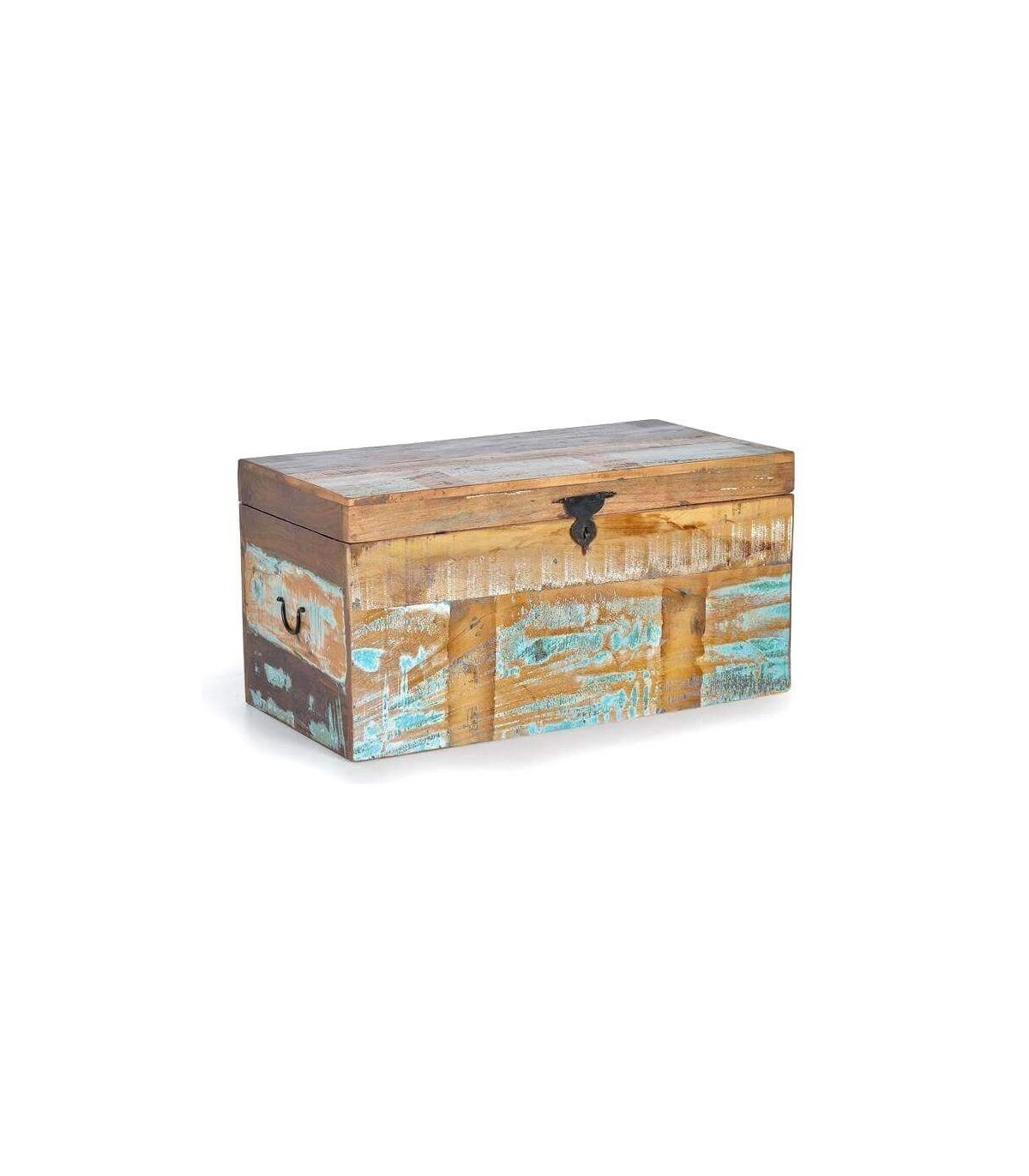 Baúl de nuestra colección de muebles Mares, una colección realizada en madera maciza reciclada 100% tratada, con la peculiaridad de el decapado en multicolor que le da un aspecto fresco y mediterraneo y la aplicación del metal negro que le da un aire industrial vintage, sin duda un muble que será el centro de atención en tu decoración.