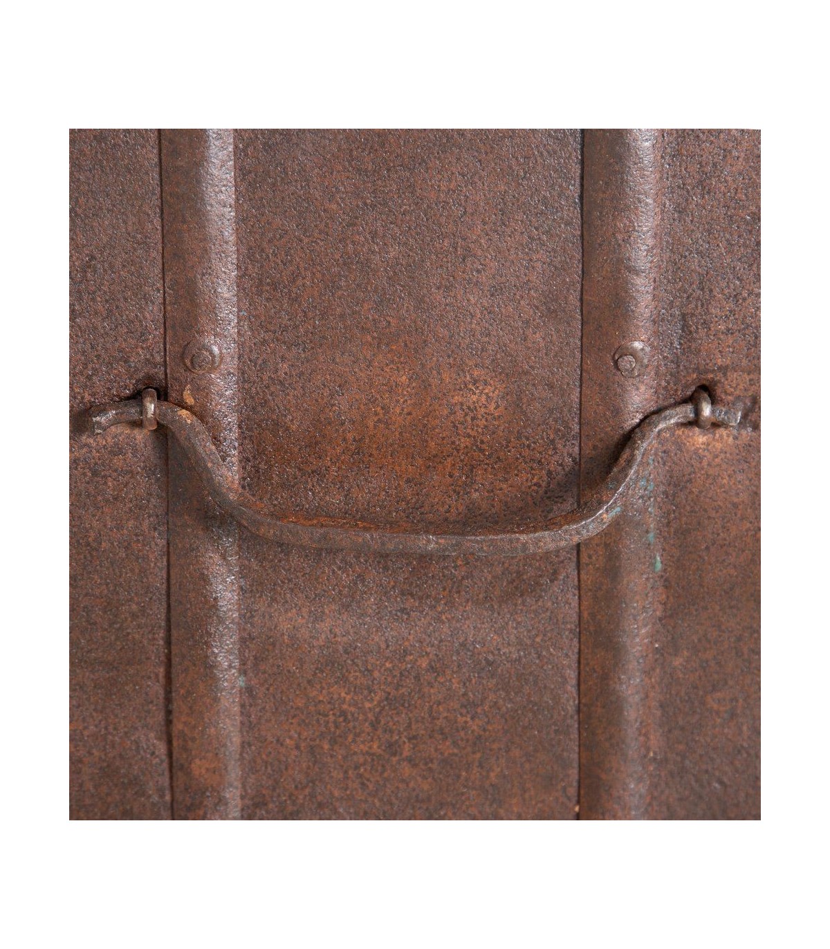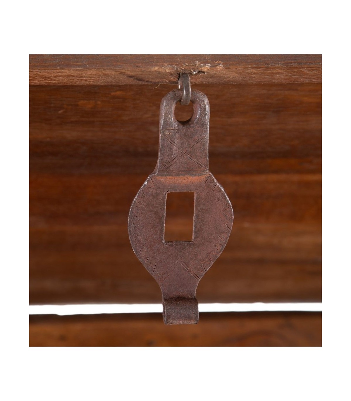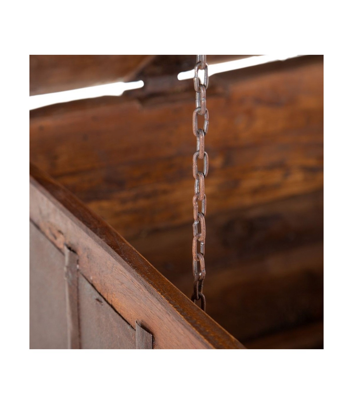 Arcón realizado en madera de teka maciza con aplicaciones en metal, acabado envejecido dandole aspecto de mueble antiguo o pieza única, ideal para decoraciones raciales donde se aprecian las piezas singulares como esta.