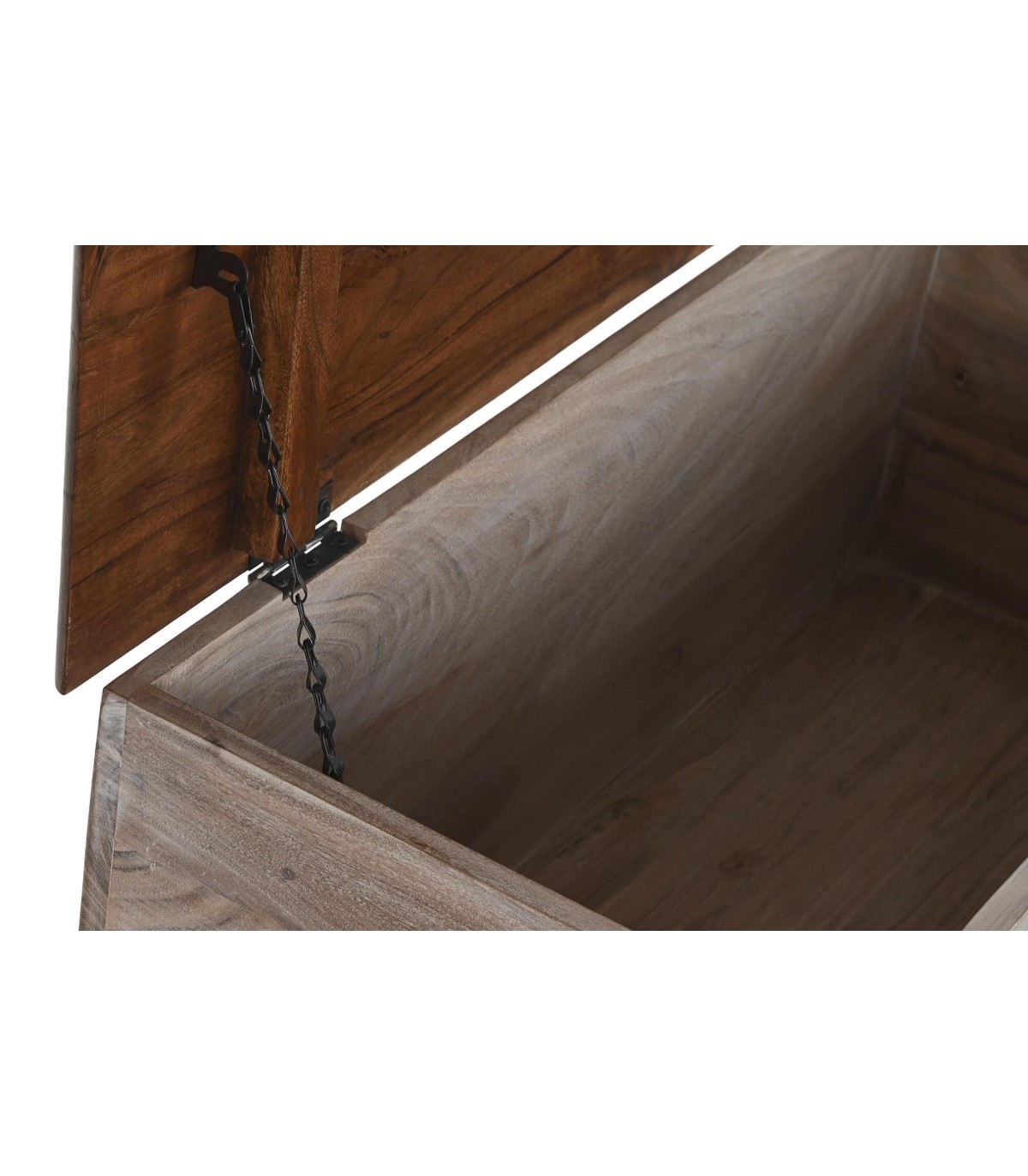 Arcón realizado en madera de acacia maciza con aplicaciones en metal, acabado envejecido dando le aspecto de mueble antiguo o pieza única, ideal para decoraciones raciales donde se aprecian las piezas singulares como esta.