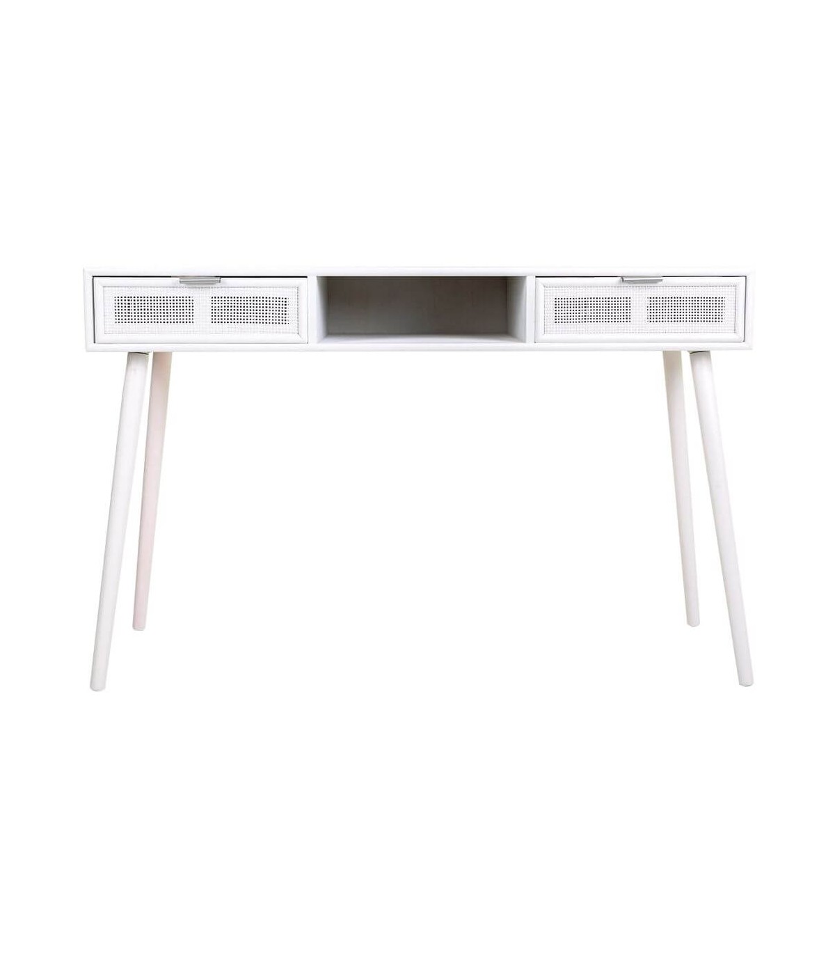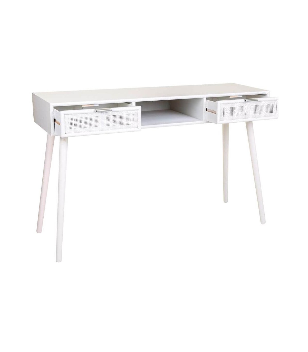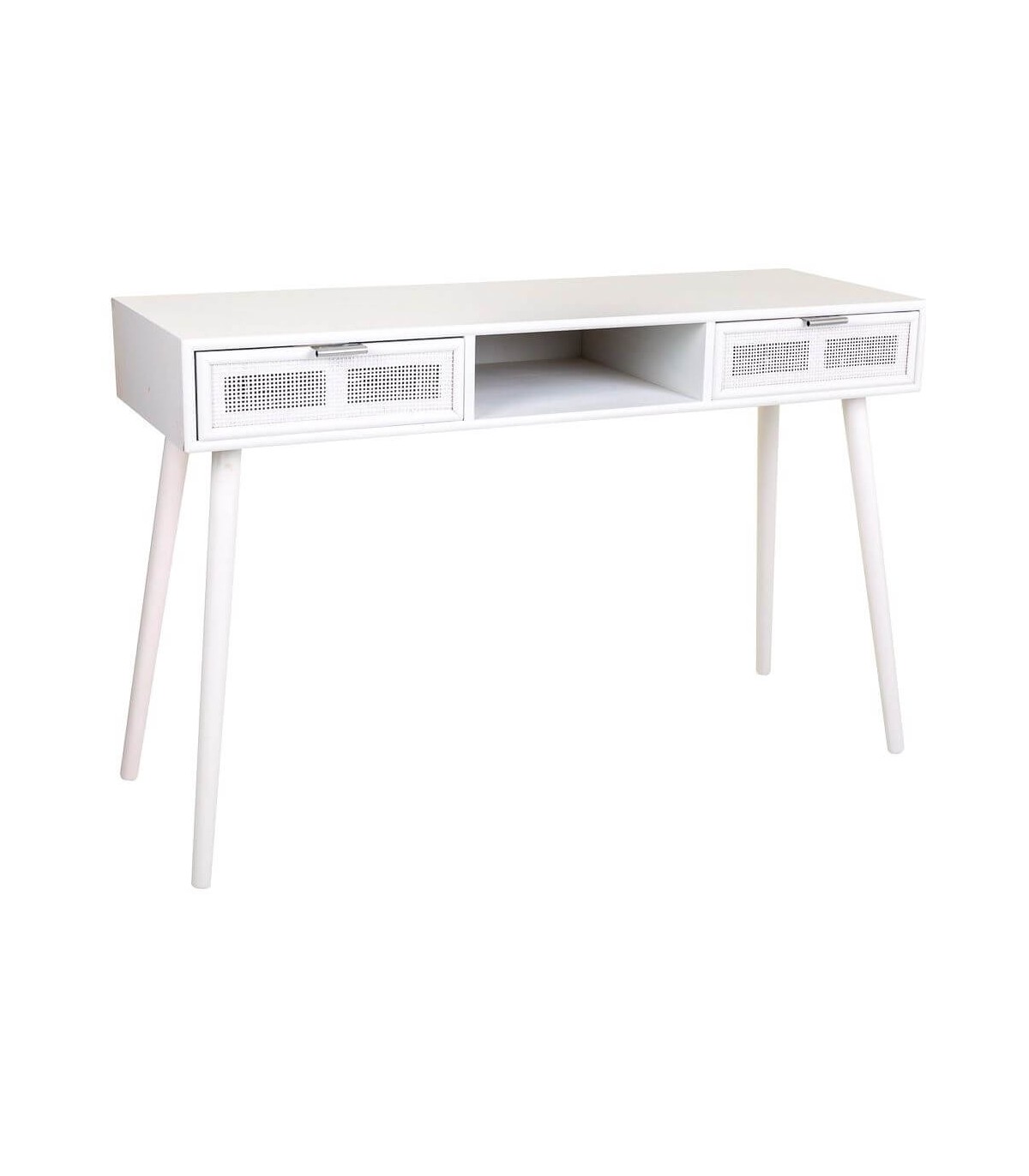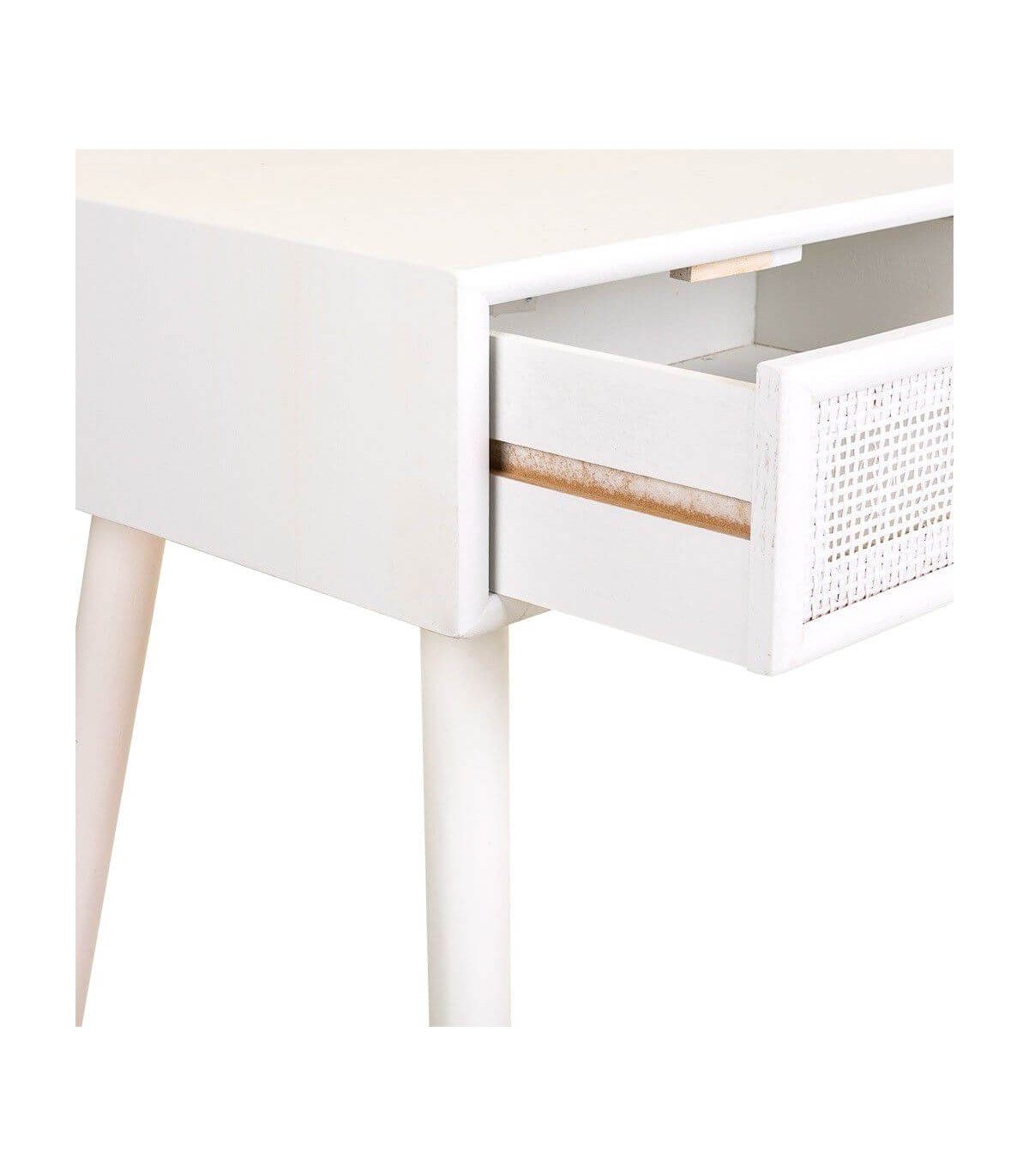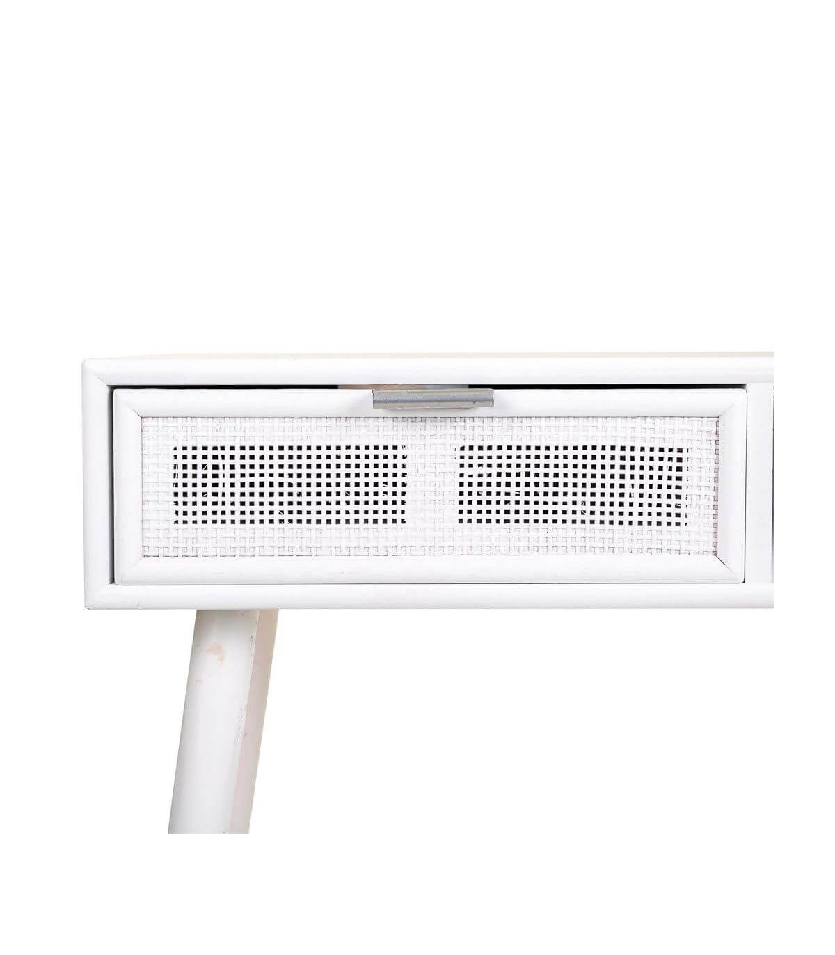 Consola de nuestra colección Denia, una colección que se caracteriza por la luminosidad que le aporta el blanco lacado con ese pequeño detalle del tirador cromado y el ratán que le da un toque contemporáneo, una colección pensada para darle ese toque natural sofisticado en tu dormitorio o tu salón.