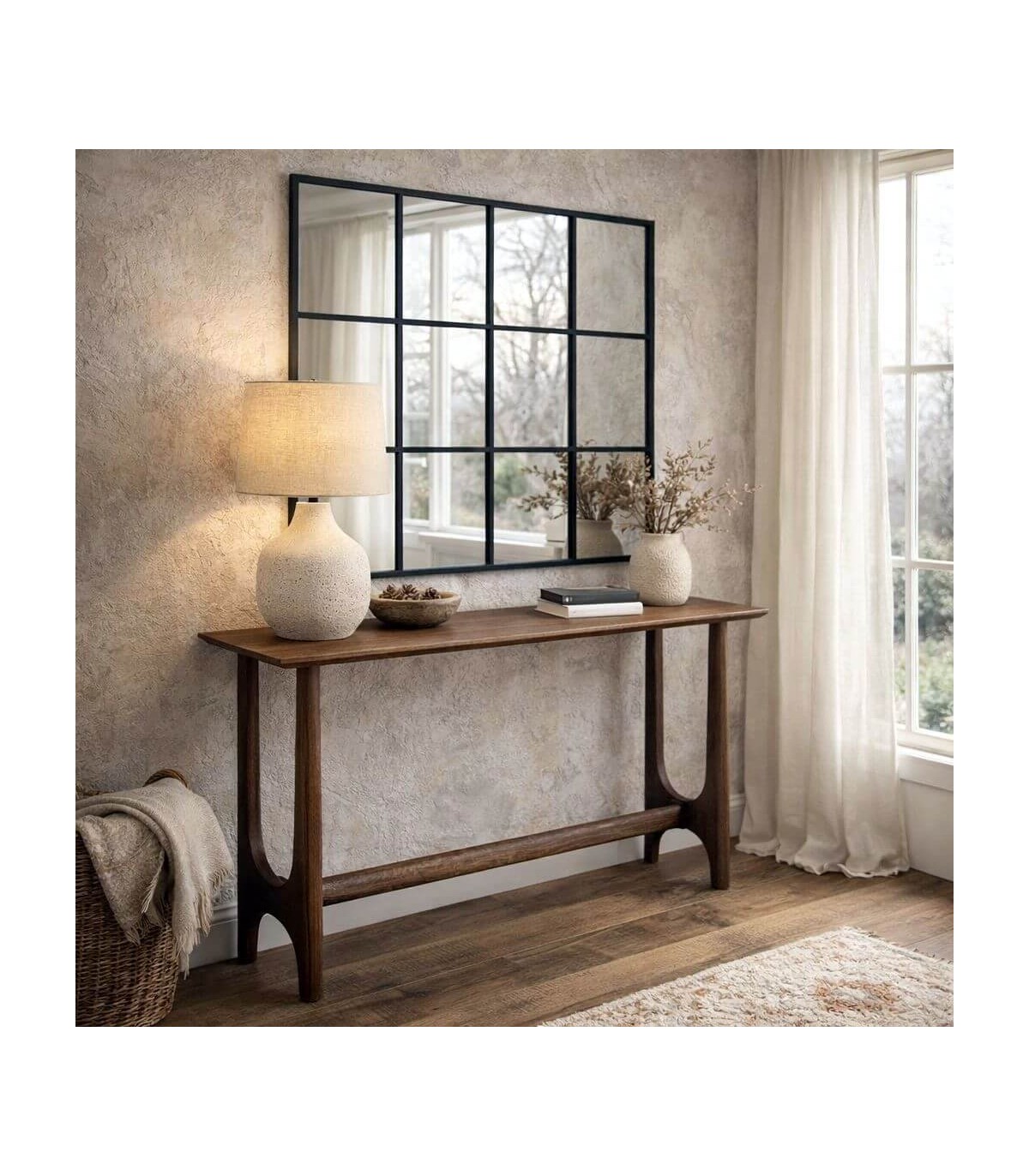 Consola de entrada grande de inspiración contemporánea aporta equilibrio y presencia al espacio gracias a su diseño limpio y proporciones alargadas. La madera maciza de mango transmite solidez y una sensación de mueble bien construido y estable.