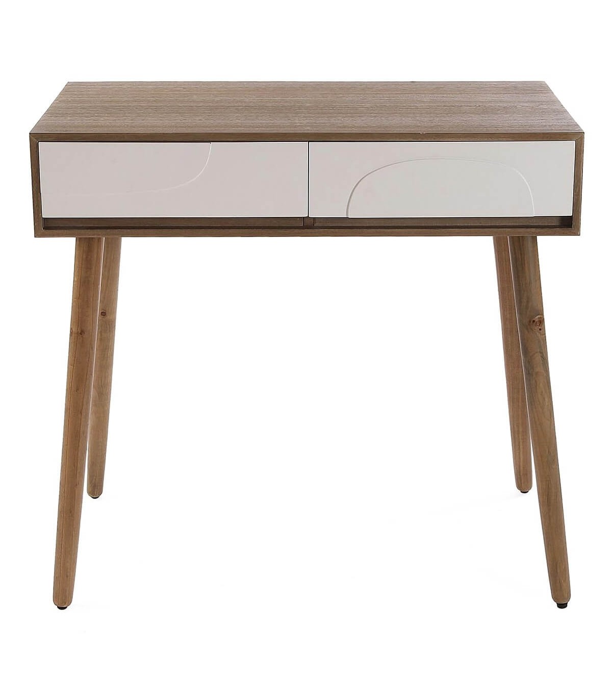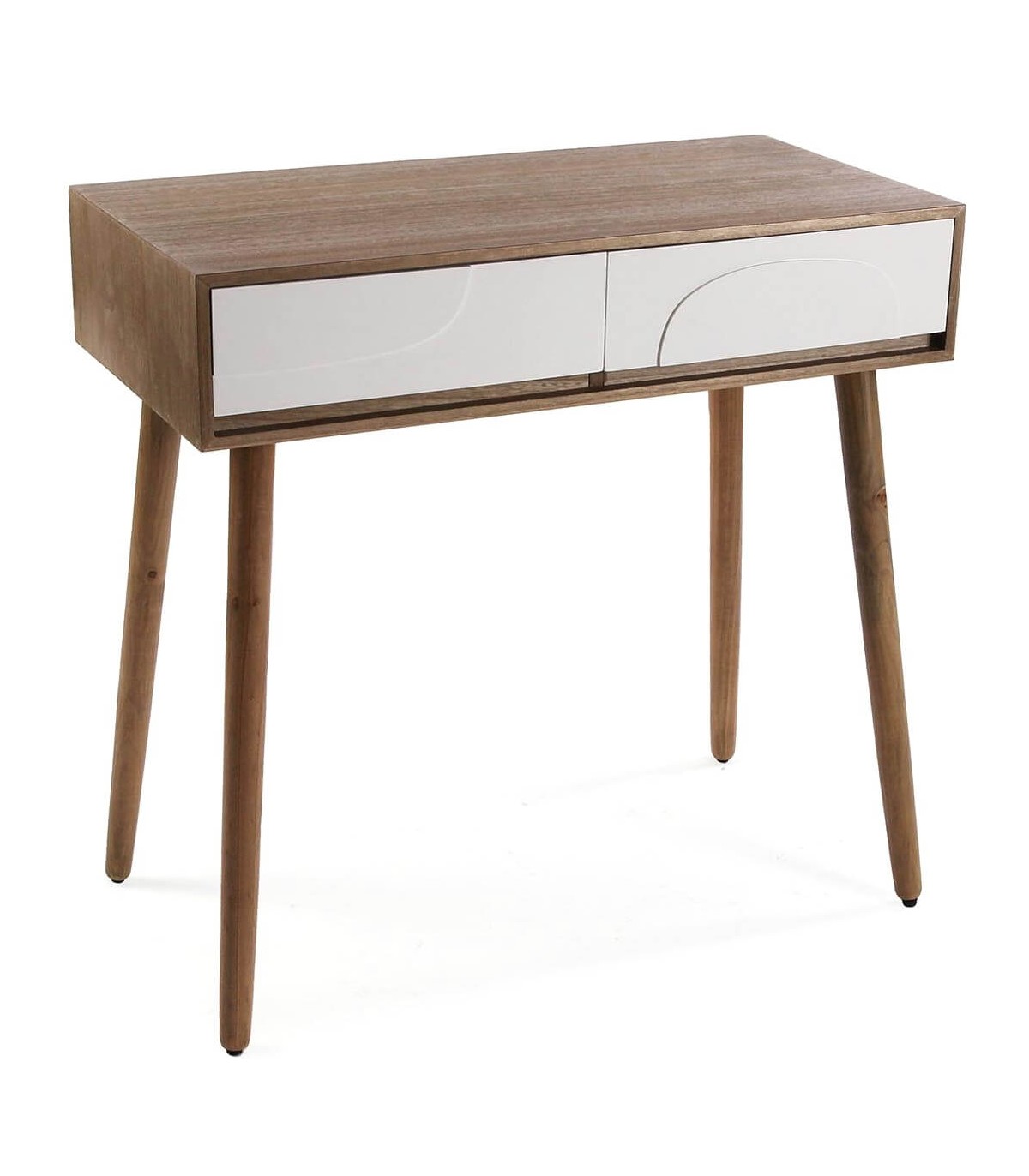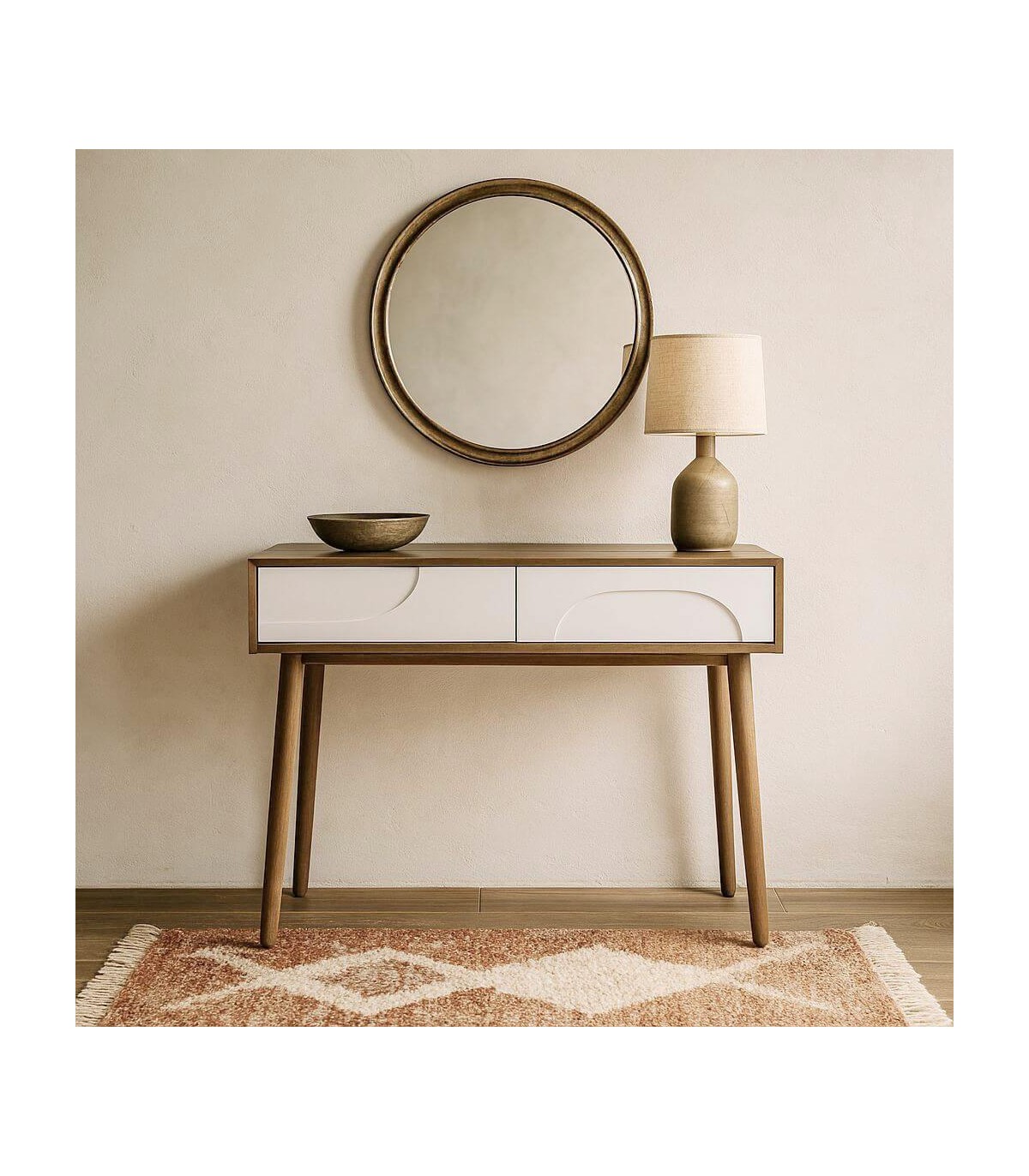 La estructura en tono nogal realza el dibujo de la madera y se complementa con los dos cajones lacados en blanco, creando un juego armónico de volúmenes. Su diseño limpio y funcional resulta ideal para recibidores, pasillos o zonas de paso con estilo discreto. Una consola contemporánea que une elegancia, equilibrio y sentido práctico en cada detalle.