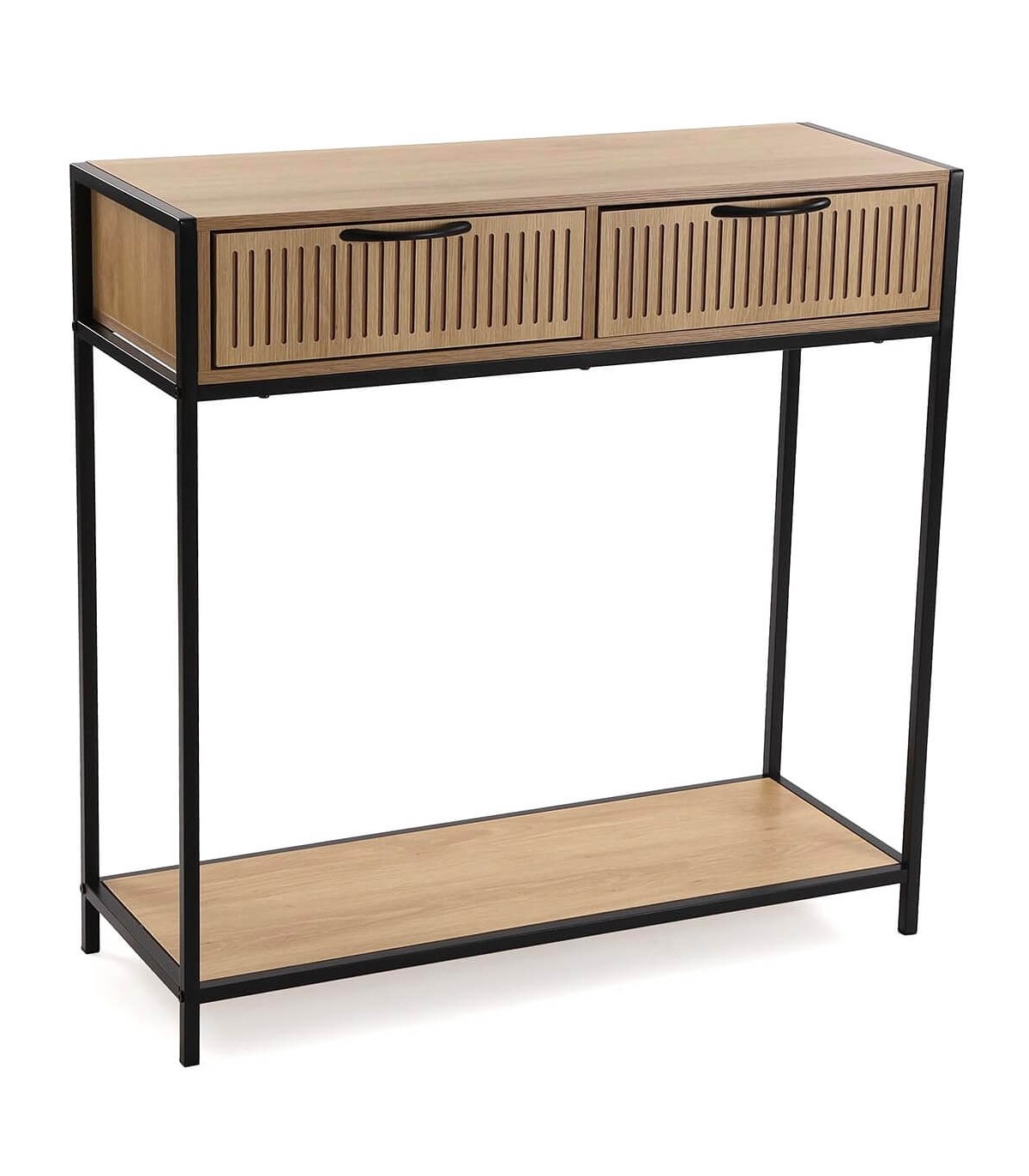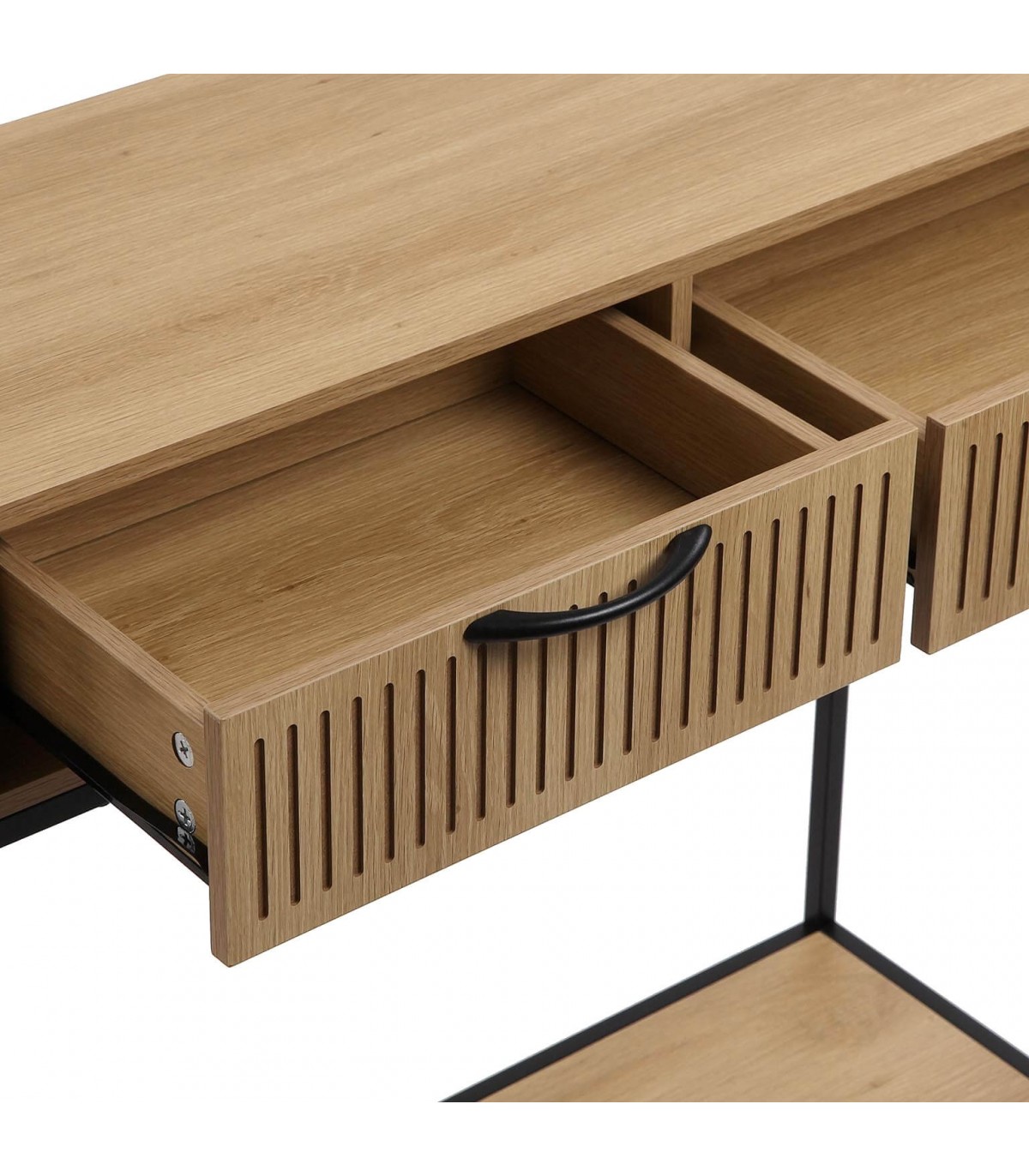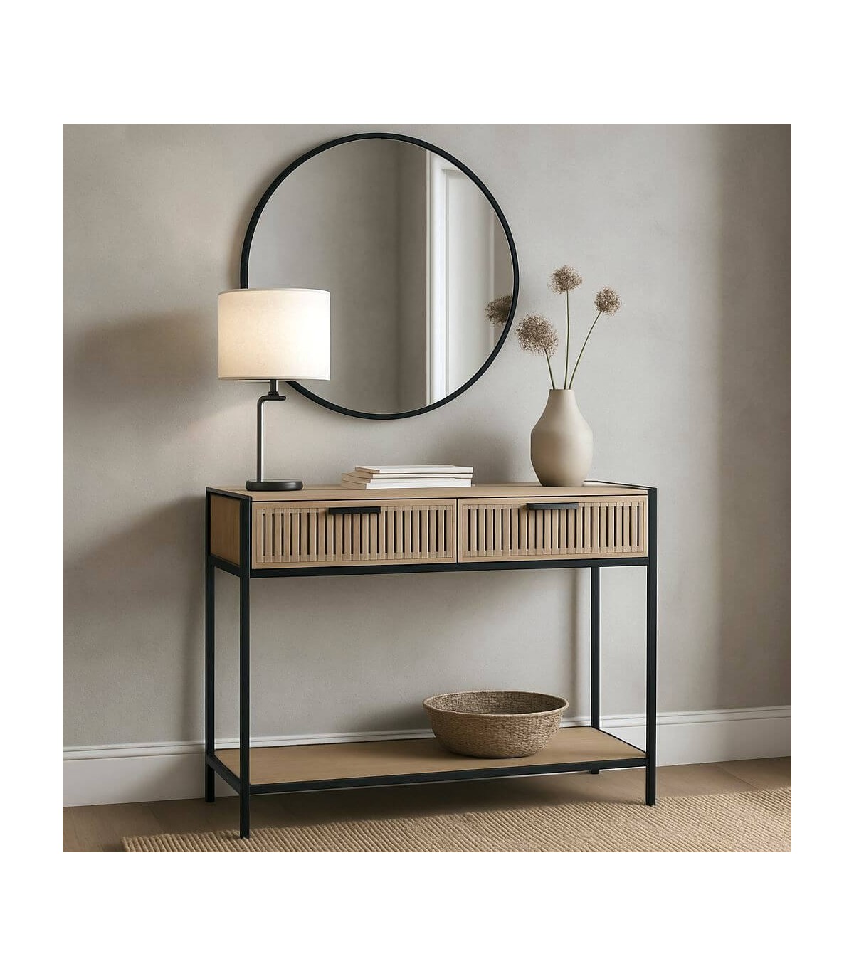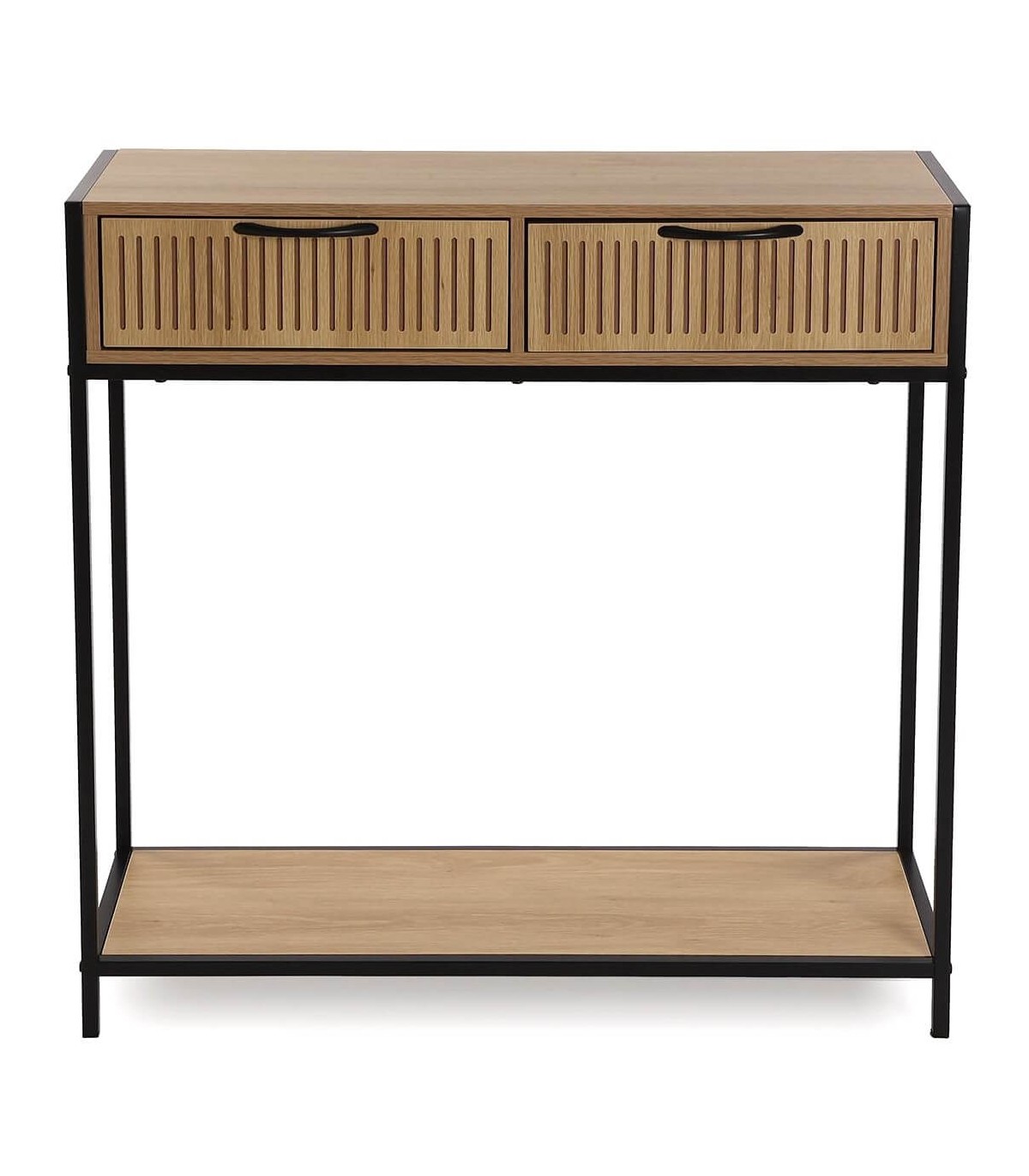 Una consola de entrada que combina carácter urbano y funcionalidad práctica. Esta pieza destaca por su estructura de metal acabado en negro que contrasta con la calidez del MDF imitación roble natural. Los dos cajones con frente ranurado y tiradores metálicos aportan orden y un aire contemporáneo, mientras que la balda inferior multiplica el espacio útil sin recargar.