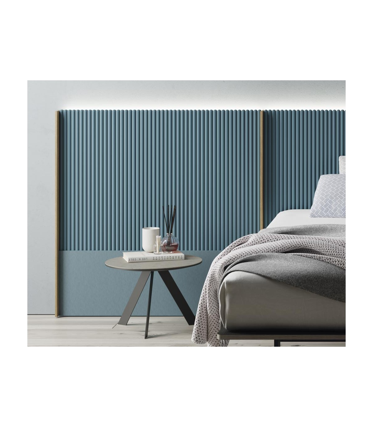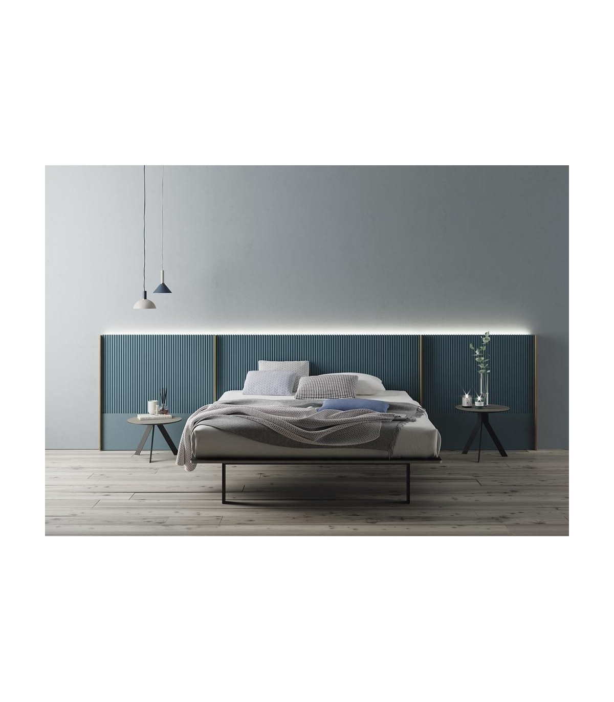 El cabezal se puede iluminar en la parte superior con leds así como los accesorios laterales que son opcionales y cuyas medidas de 50,75 y 100 cm de ancho permiten adaptarlos a cualquier habitación.