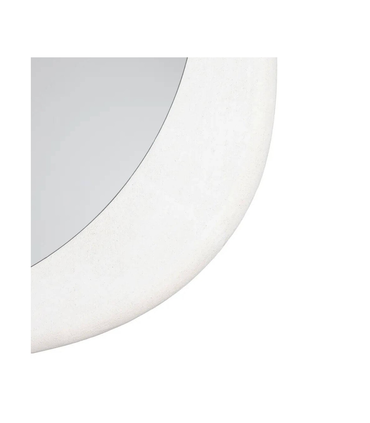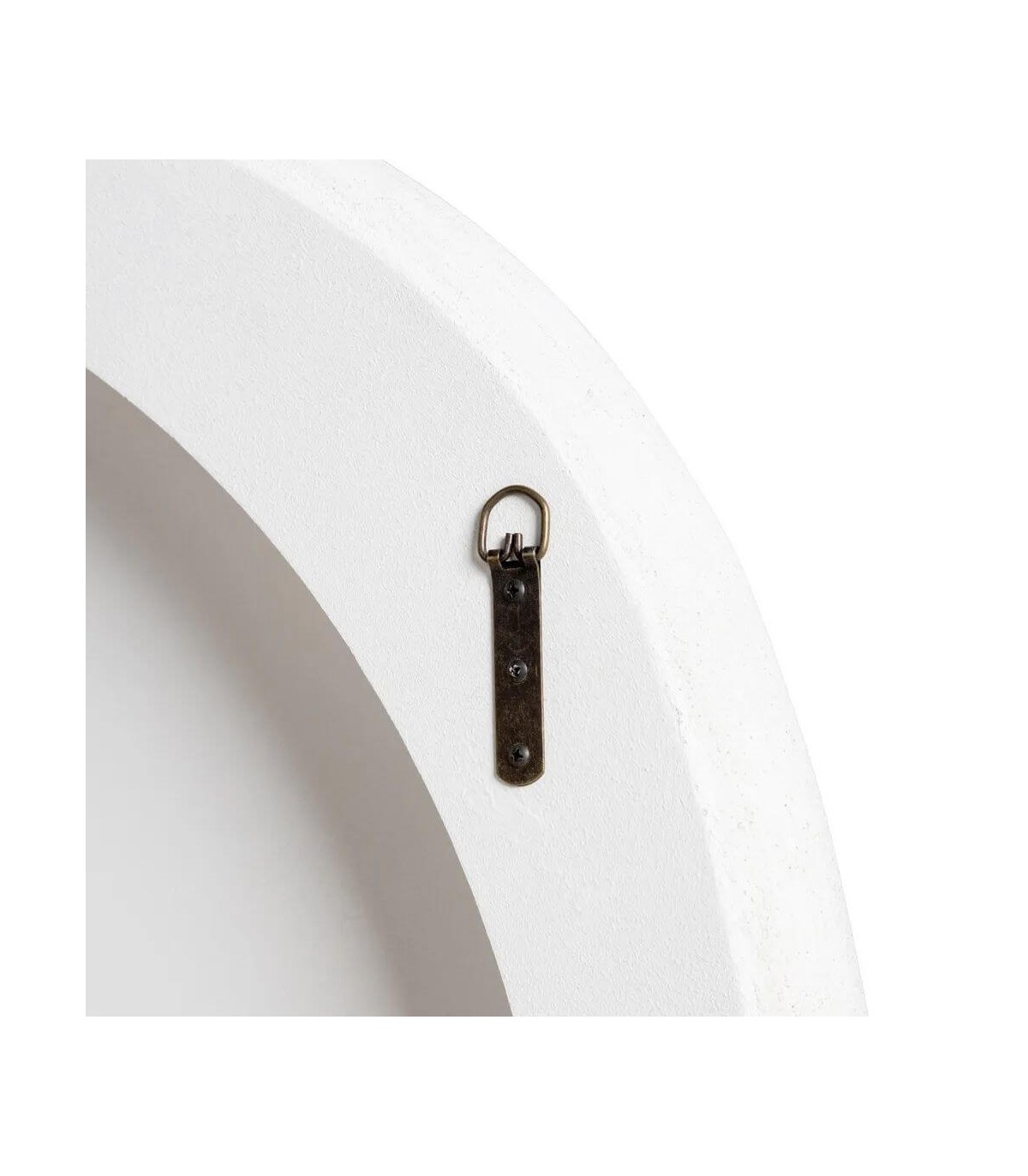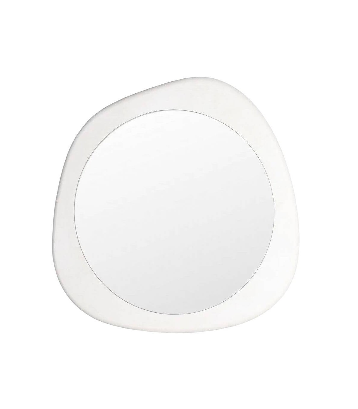 Este espejo decorativo de formas orgánicas combina simplicidad y carácter con un diseño de marco irregular en acabado blanco mate efecto yeso. La estructura está fabricada en madera DM moldeada con bordes suaves e irregulares que evocan las líneas naturales de las piedras pulidas.