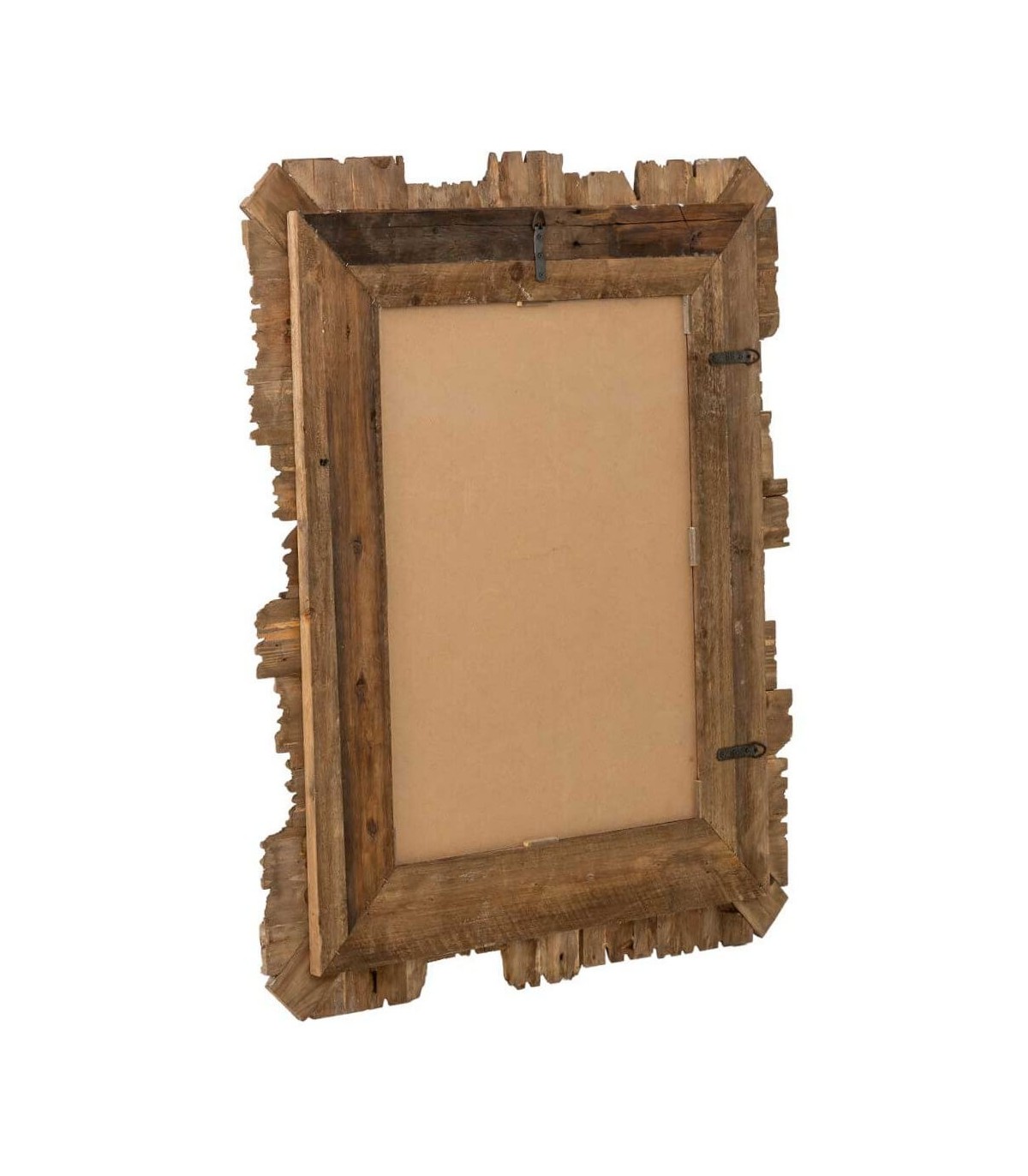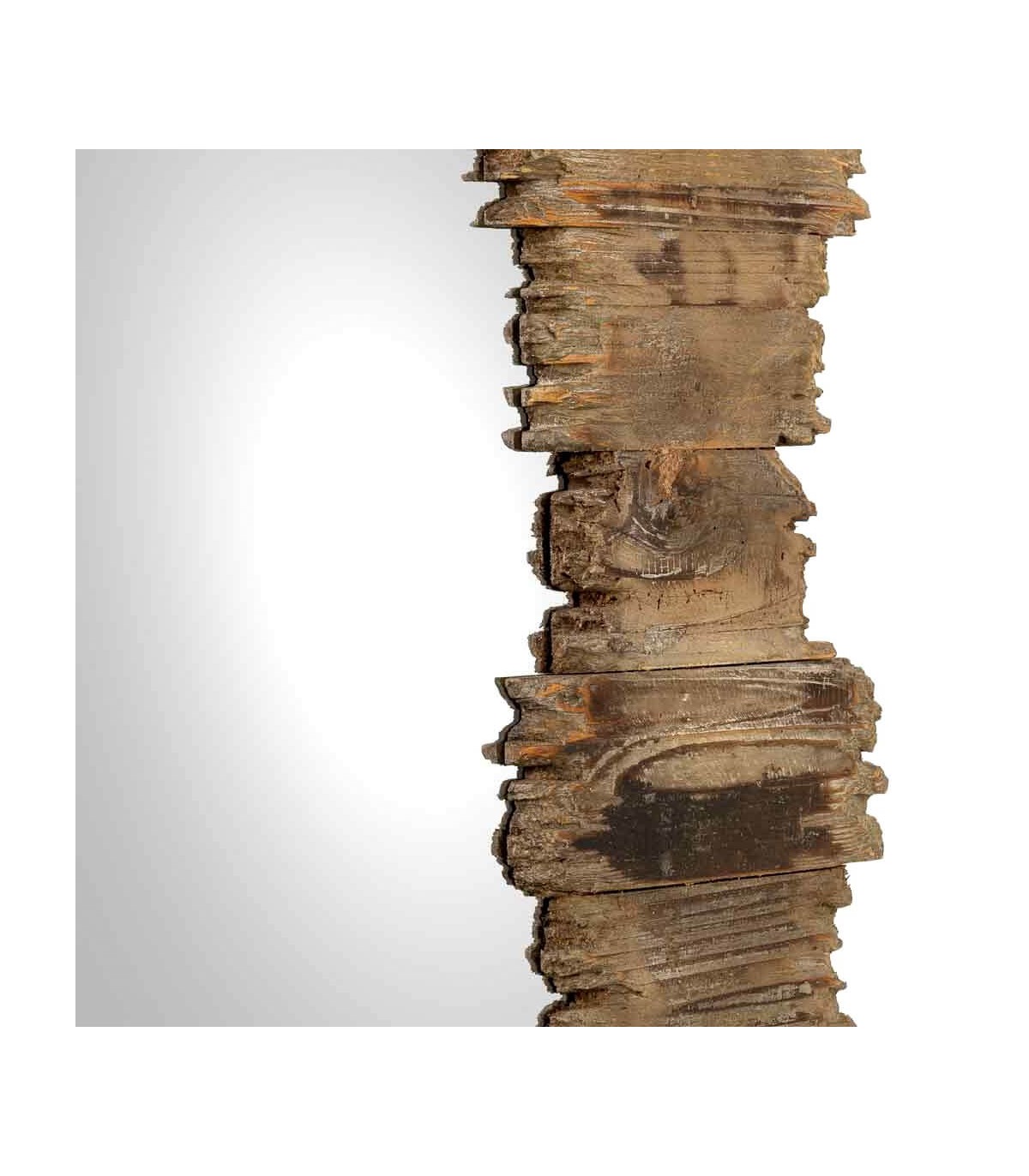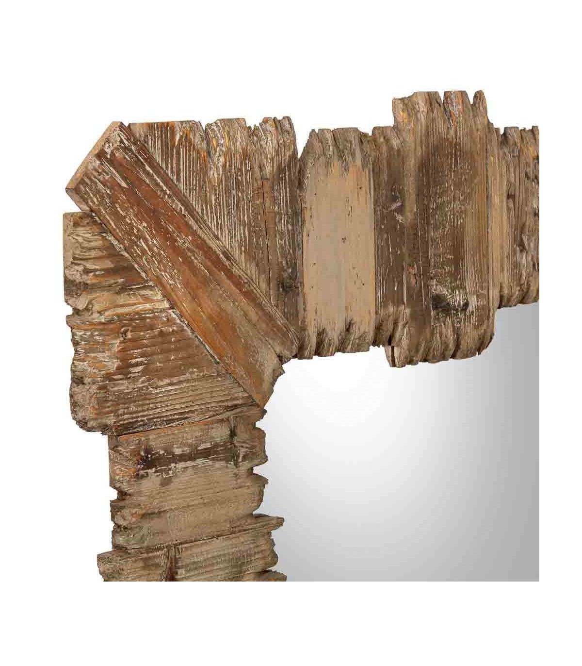 Con una personalidad desbordante, este espejo de pared destaca por su marco irregular tallado en madera reciclada de abeto, con efecto desgastado y textura natural. Cada pieza es única, con marcas y vetas que le confieren autenticidad e historia.