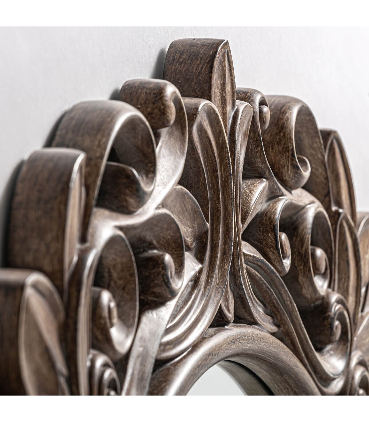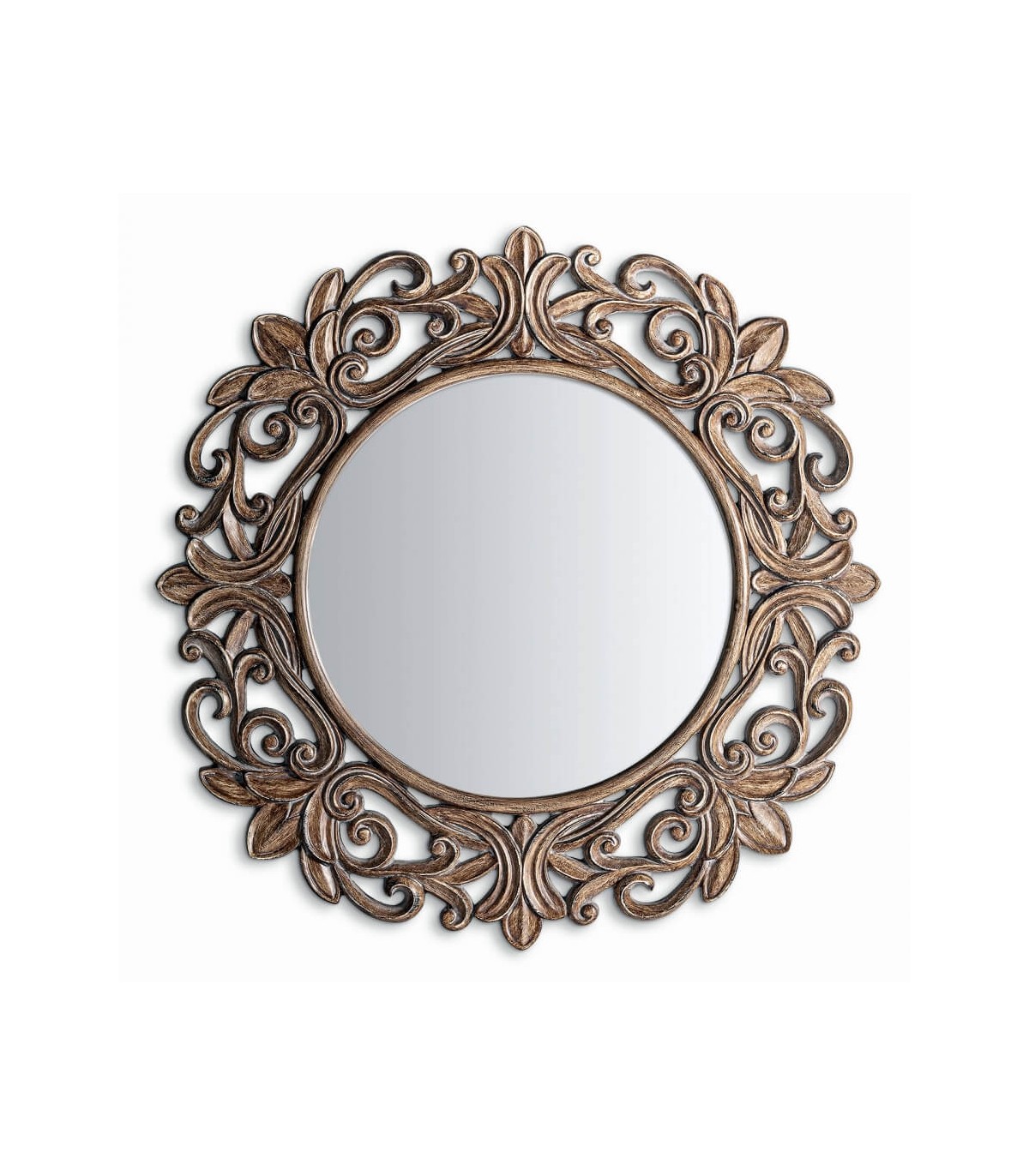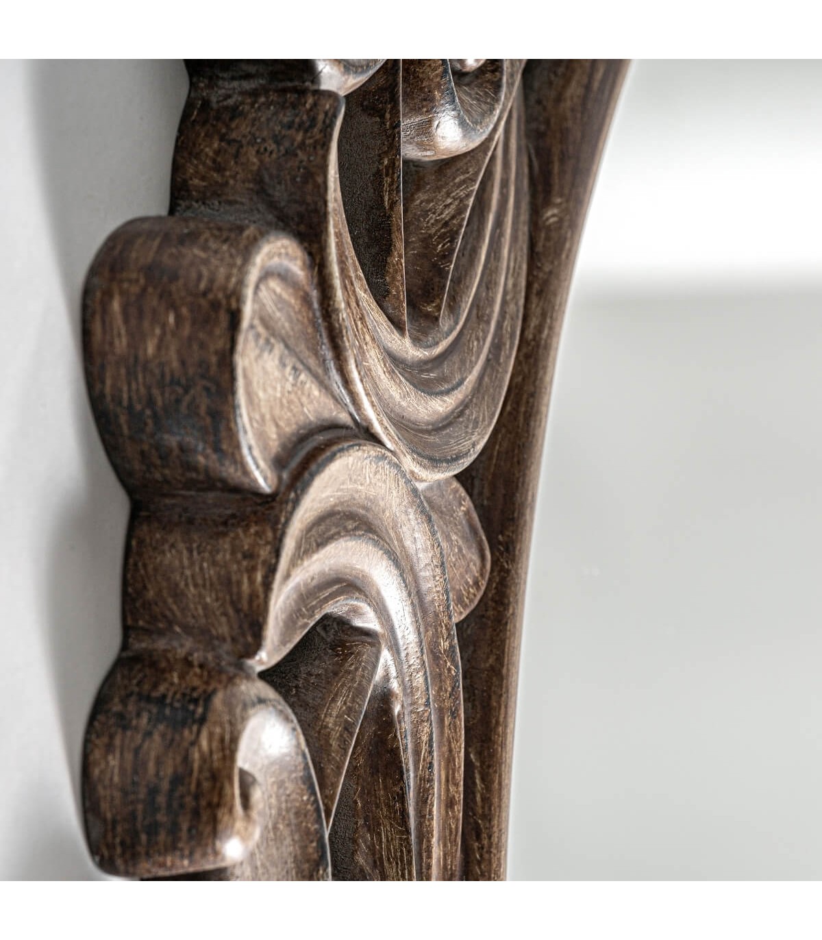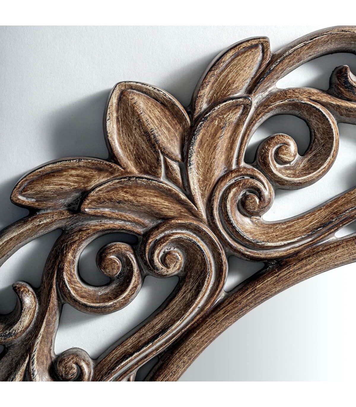 Este espectacular espejo de pared combina la elegancia clásica con la calidez de los acabados envejecidos. Su marco de resina tallada imita con detalle el trabajo artesanal de la madera, con formas curvas y motivos florales que aportan presencia decorativa sin sobrecargar el ambiente. El acabado marrón patinado añade profundidad visual y un toque vintage muy versátil.