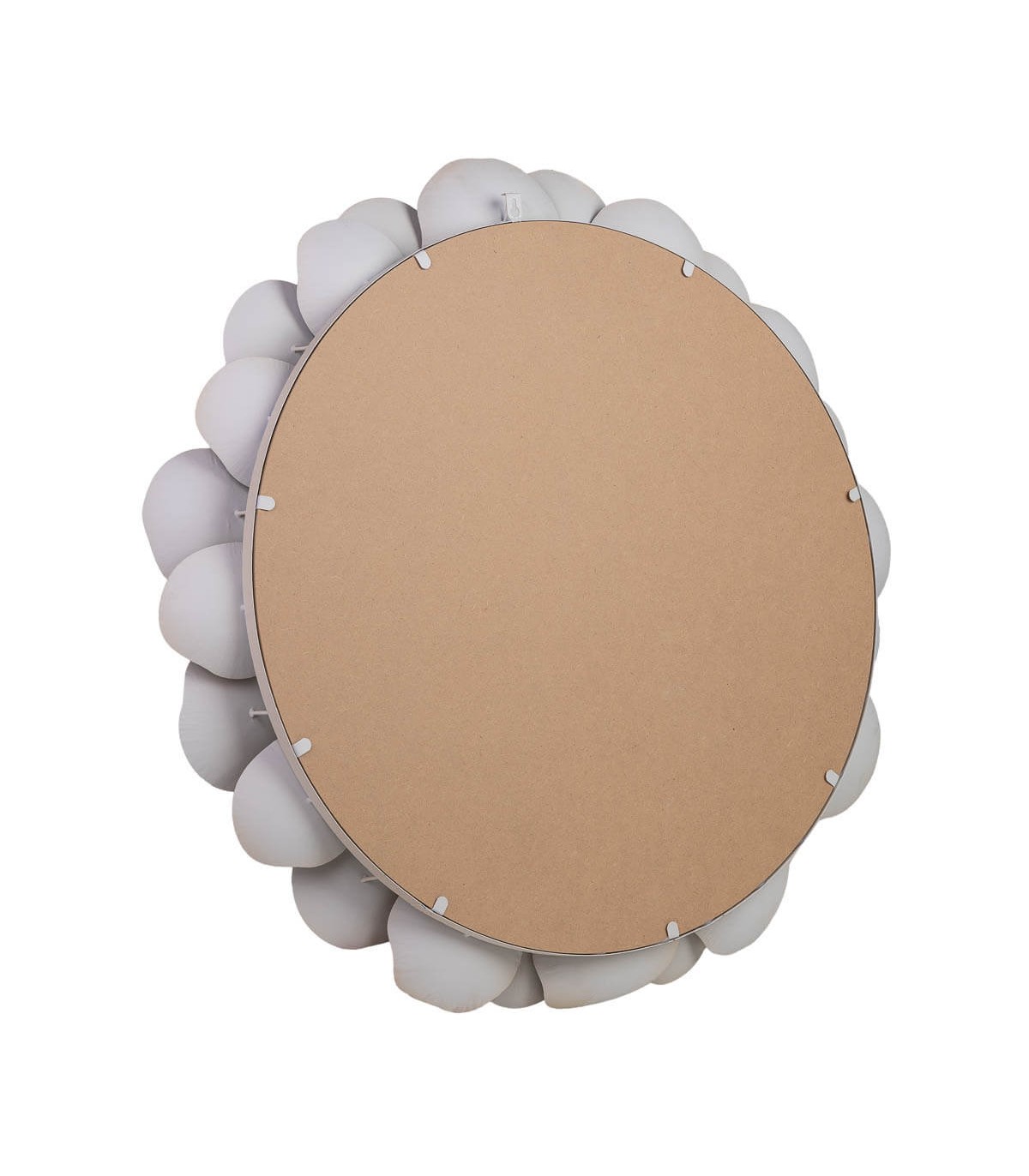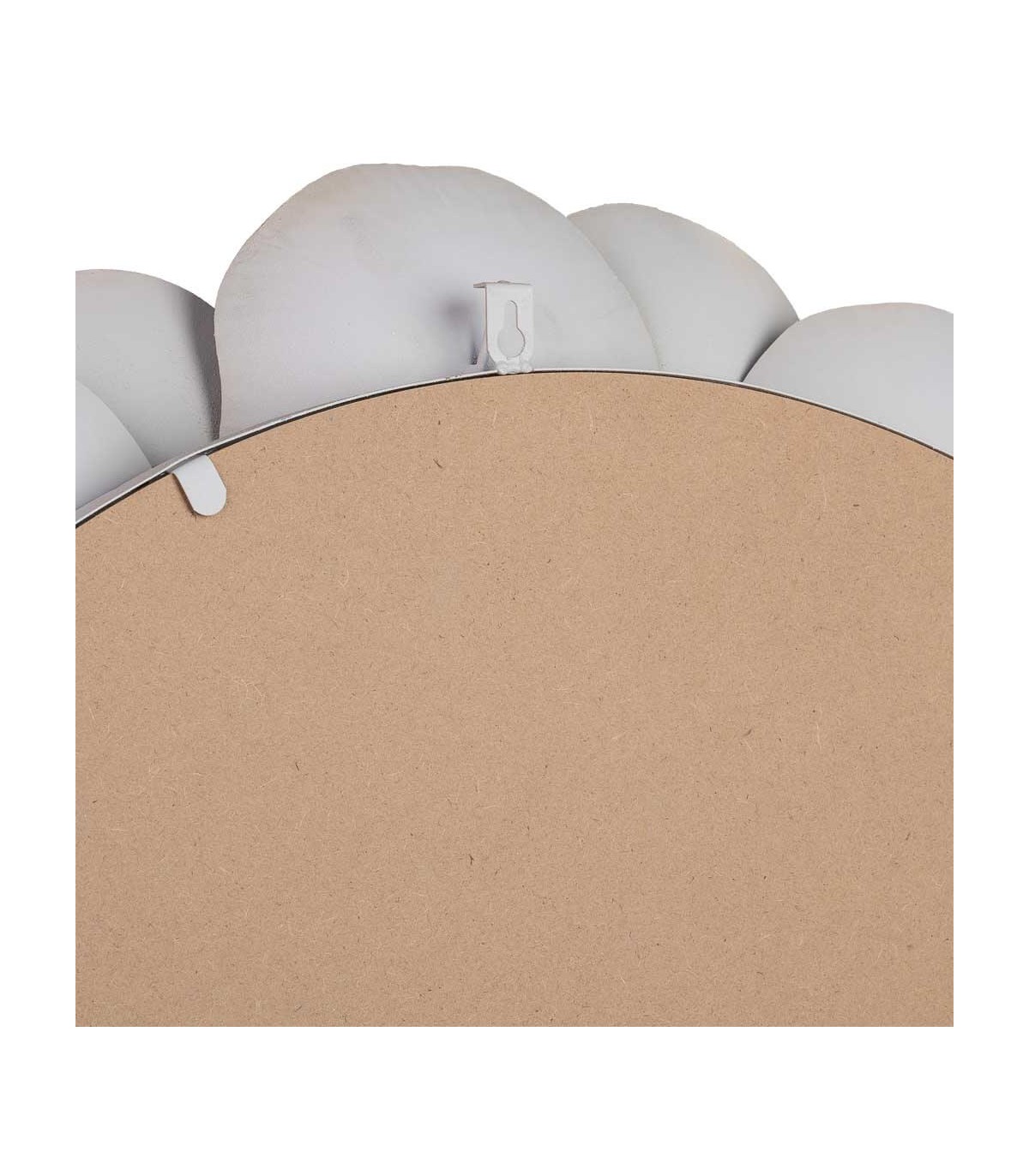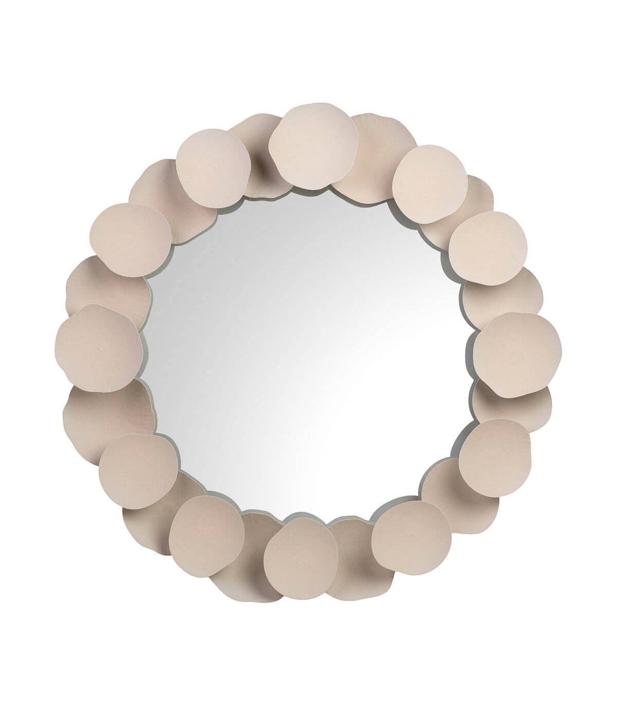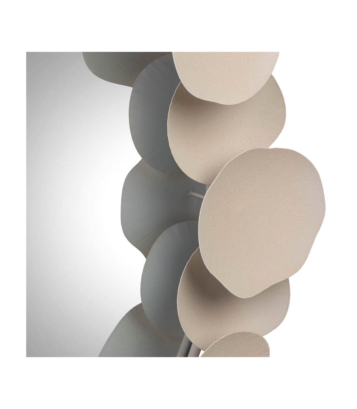 Este espejo de pared es una pieza escultórica que aporta carácter a cualquier estancia. Su marco circular está formado por discos de metal en acabado rugoso beige, creando un efecto visual dinámico y elegante. Ideal para entradas, dormitorios o salones donde se busque añadir un punto focal decorativo con personalidad.