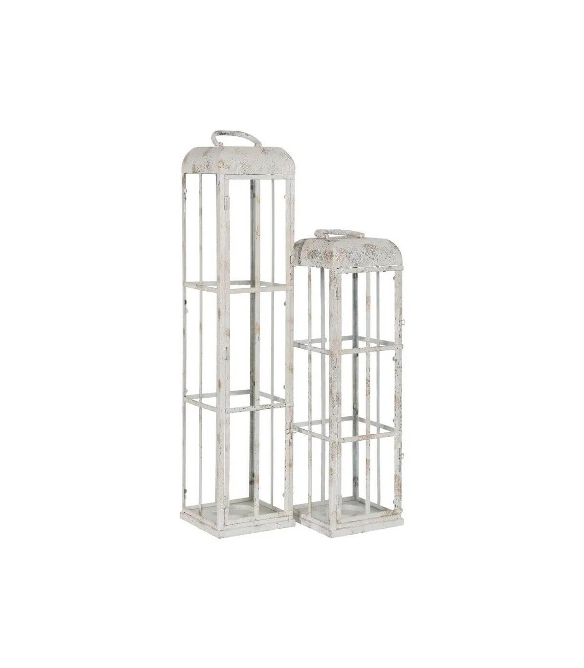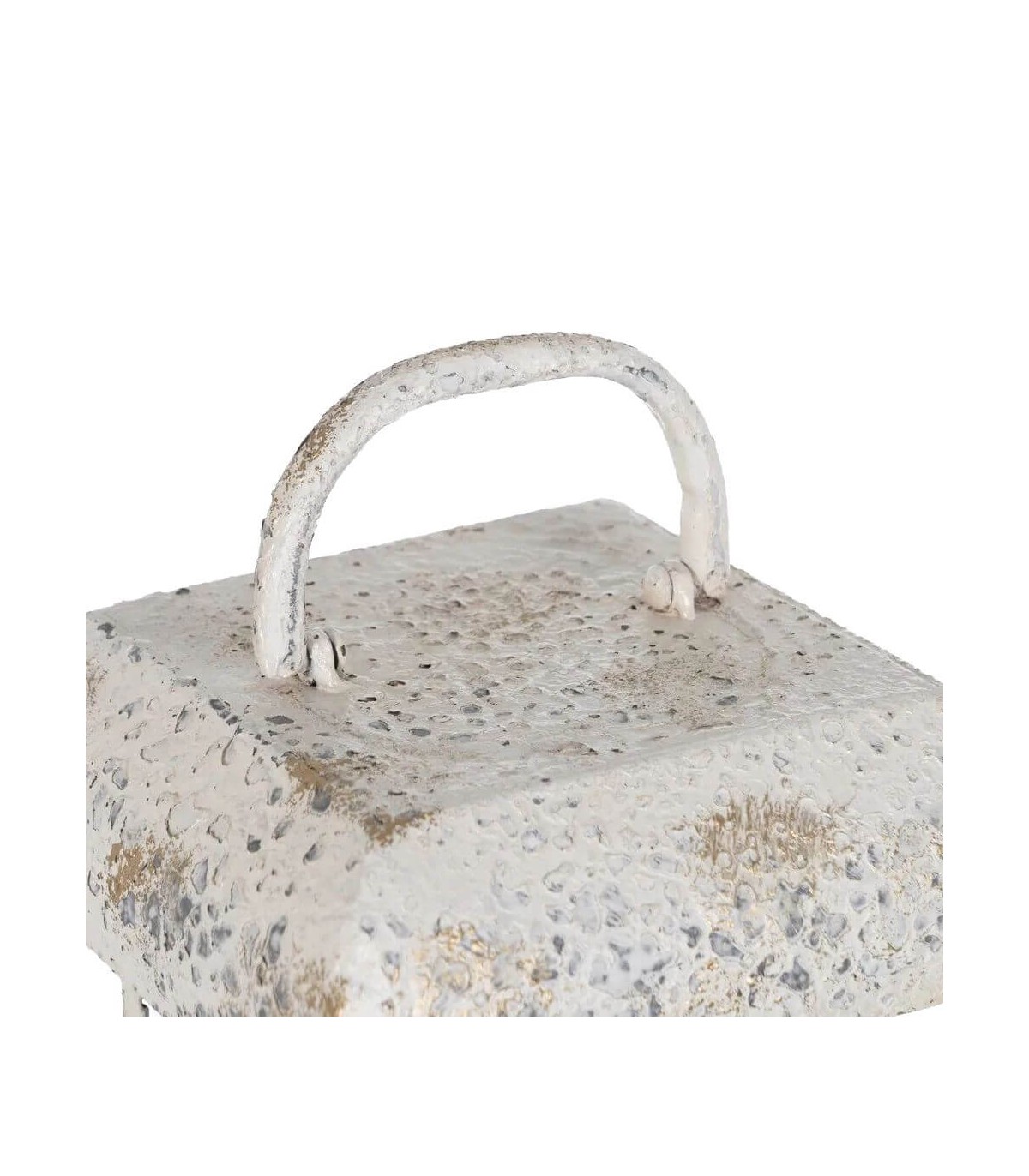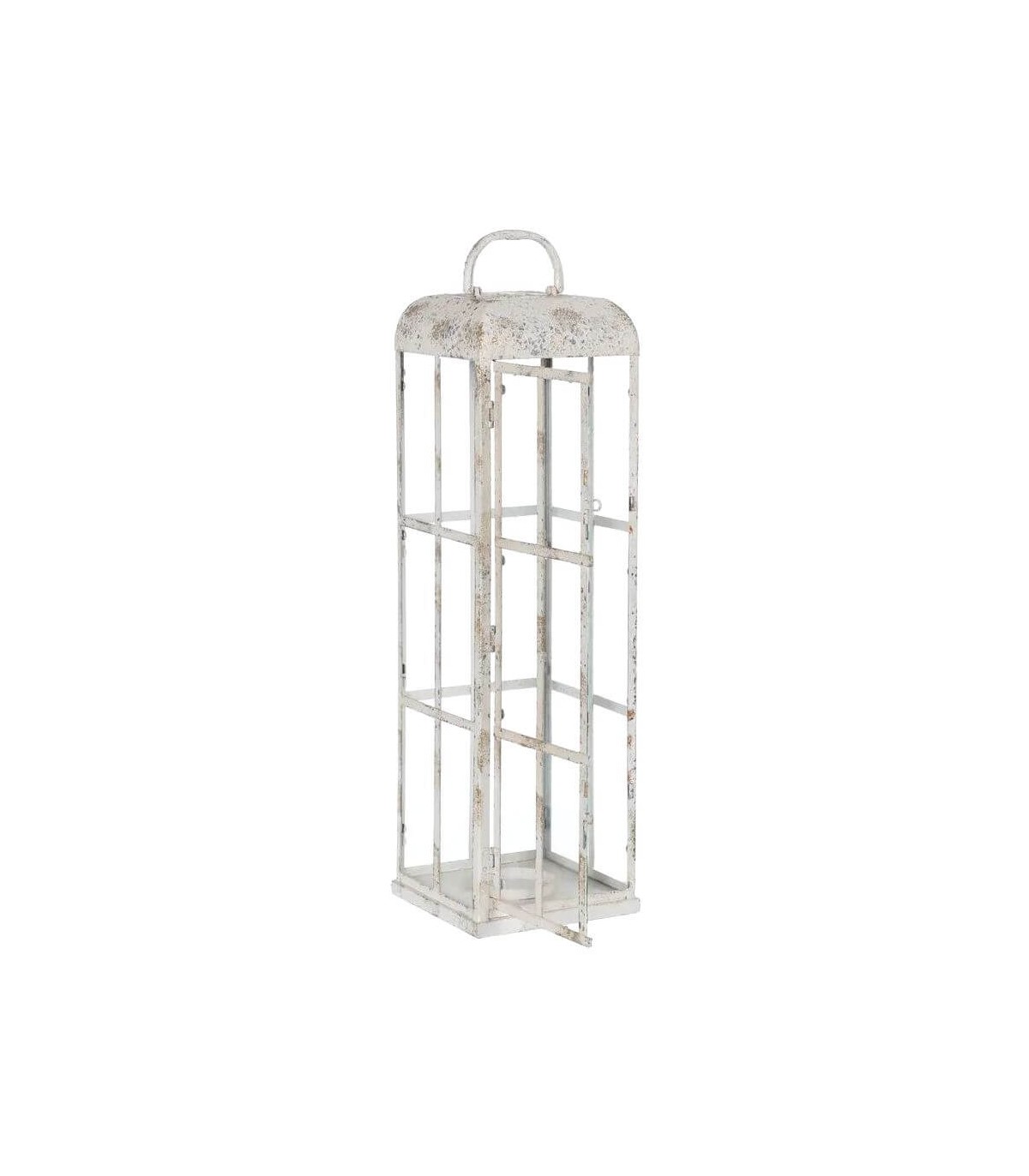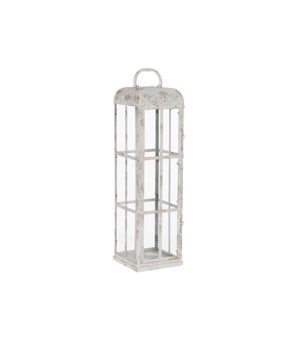 Este farol decorativo bajo de estilo clásico aporta un toque romántico y nostálgico a cualquier rincón. Fabricado en metal con acabado blanco rozado y toques artesanales en oro envejecido, destaca por su estructura de ventanas acristaladas y su forma vertical con asa superior.